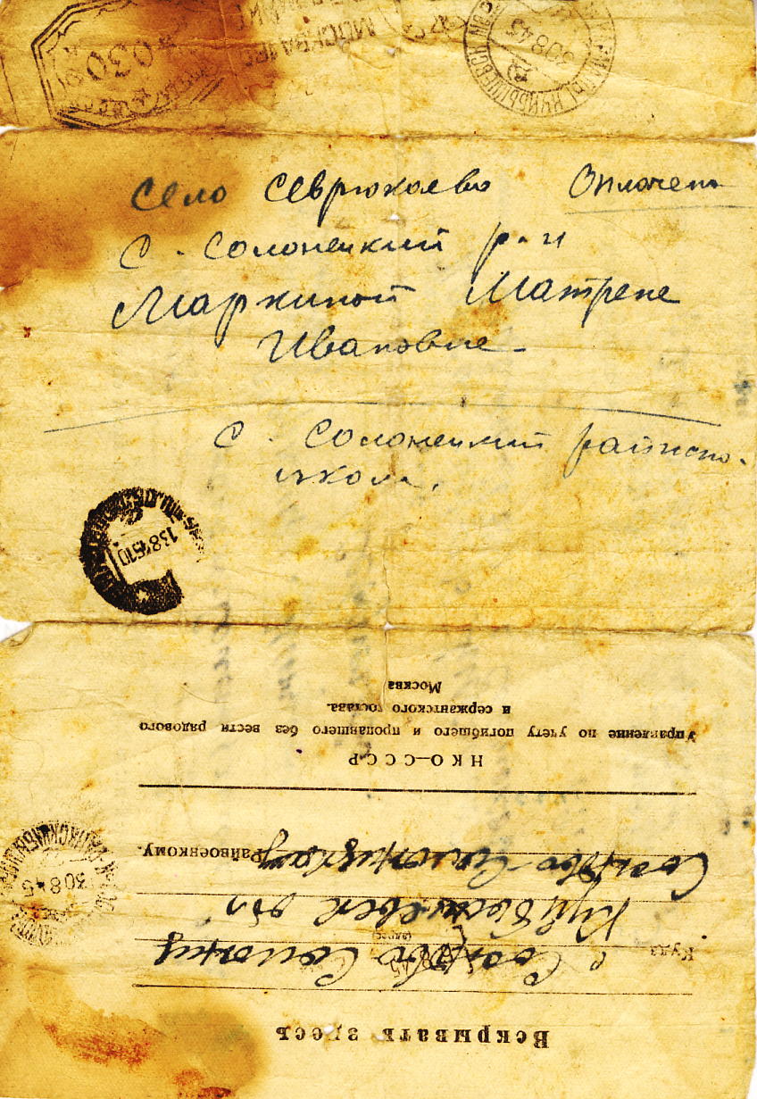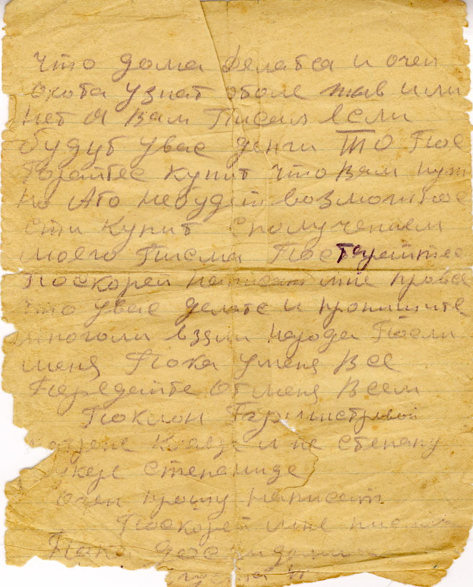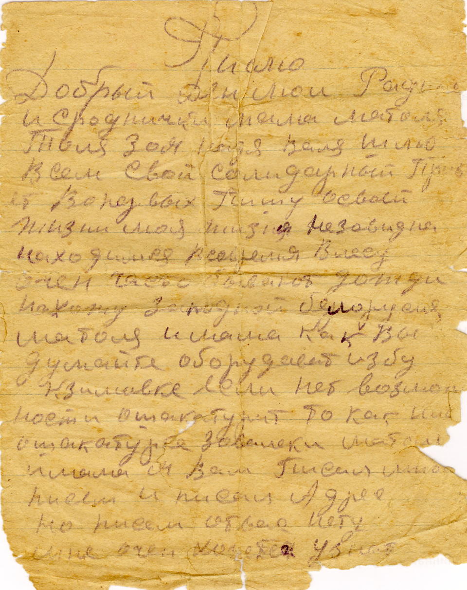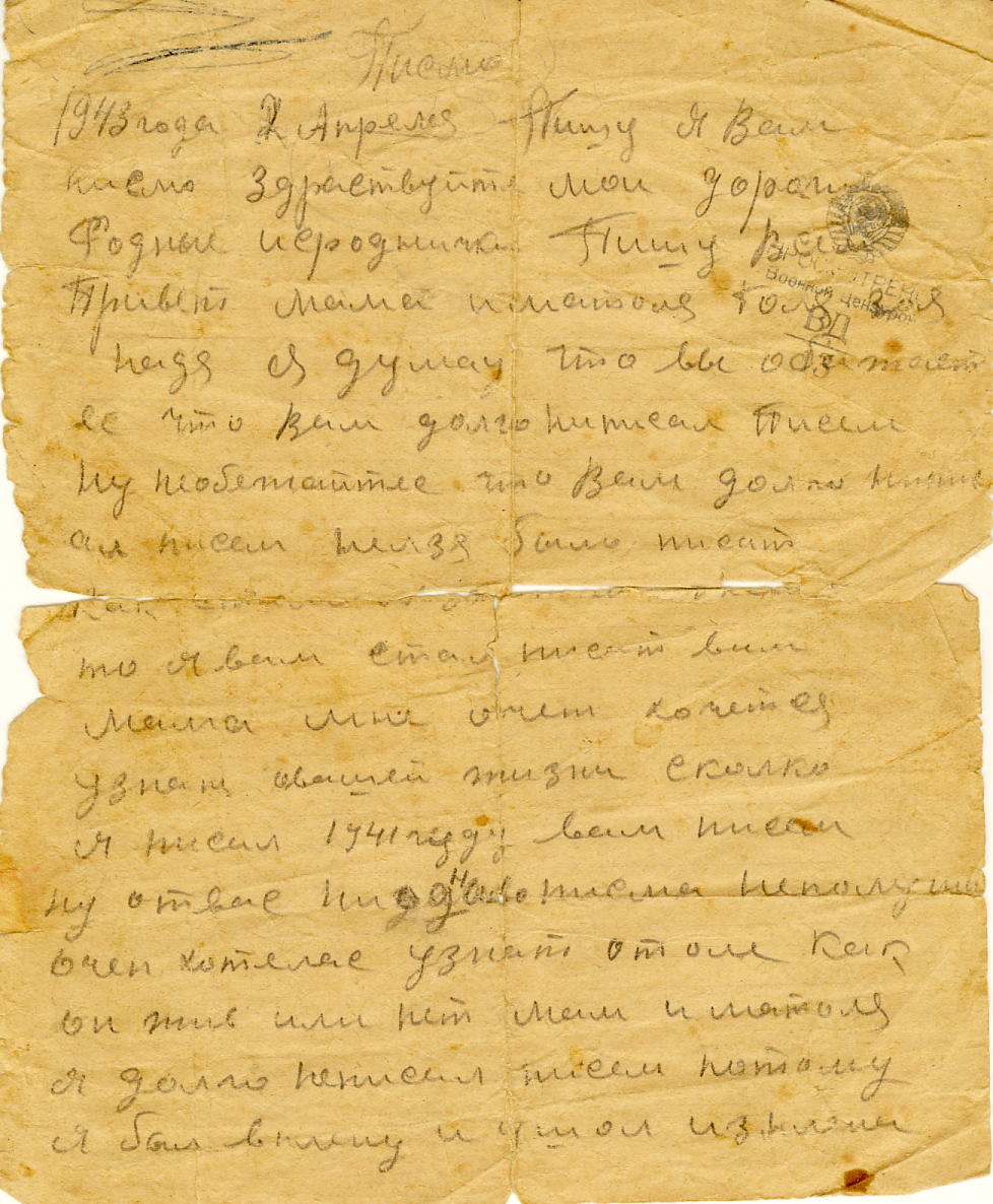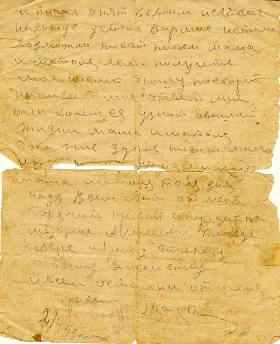 и попал опять к своим, и сейчас нахожусь у своих в армии, и стало возможно писать письма. Мама и Матоля, если получите мое письмо, прошу поскорее написать мне ответ. Мне очень хочется узнать о вашей жизни. Мама и Матоля, пока жив, здоров, писать много (неразборчиво) и не разрешается. Мама и Матоля, Толя, Зоя, Надя, всем вам от меня горячий привет, и передайте Матрене Алексеевне, Клавдии, Лене и брату Степану и всему семейству и всем остальным от меня привет. ? апреля 1943 года. Подпись.