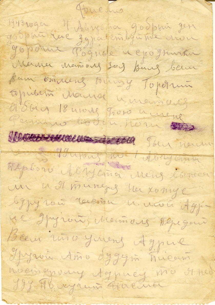 Маркин А.А. Письмо семье, 4 августа 1943 г. (2 стр.). Текст письма: Письмо. 1943 года 4 августа, добрый день, добрый час, здравствуйте, мои дорогие родные и сроднички мама, Матоля, Зоя, Валя, всем вам от меня пишу горячий привет. Мама и Матоля, я был 18 июля в бою, и меня ранило в обе ноги (далее несколько слов зачеркнуто военной цензурой). Был на лечении с 19 июля по 1 августа. Первого августа меня выписали, и я теперь нахожусь в другой части, и мой адрес другой. Матоля, передай всем, что у меня адрес другой, а то будут писать по старому адресу, то я не буду получать письма.(окончание на след. странице)