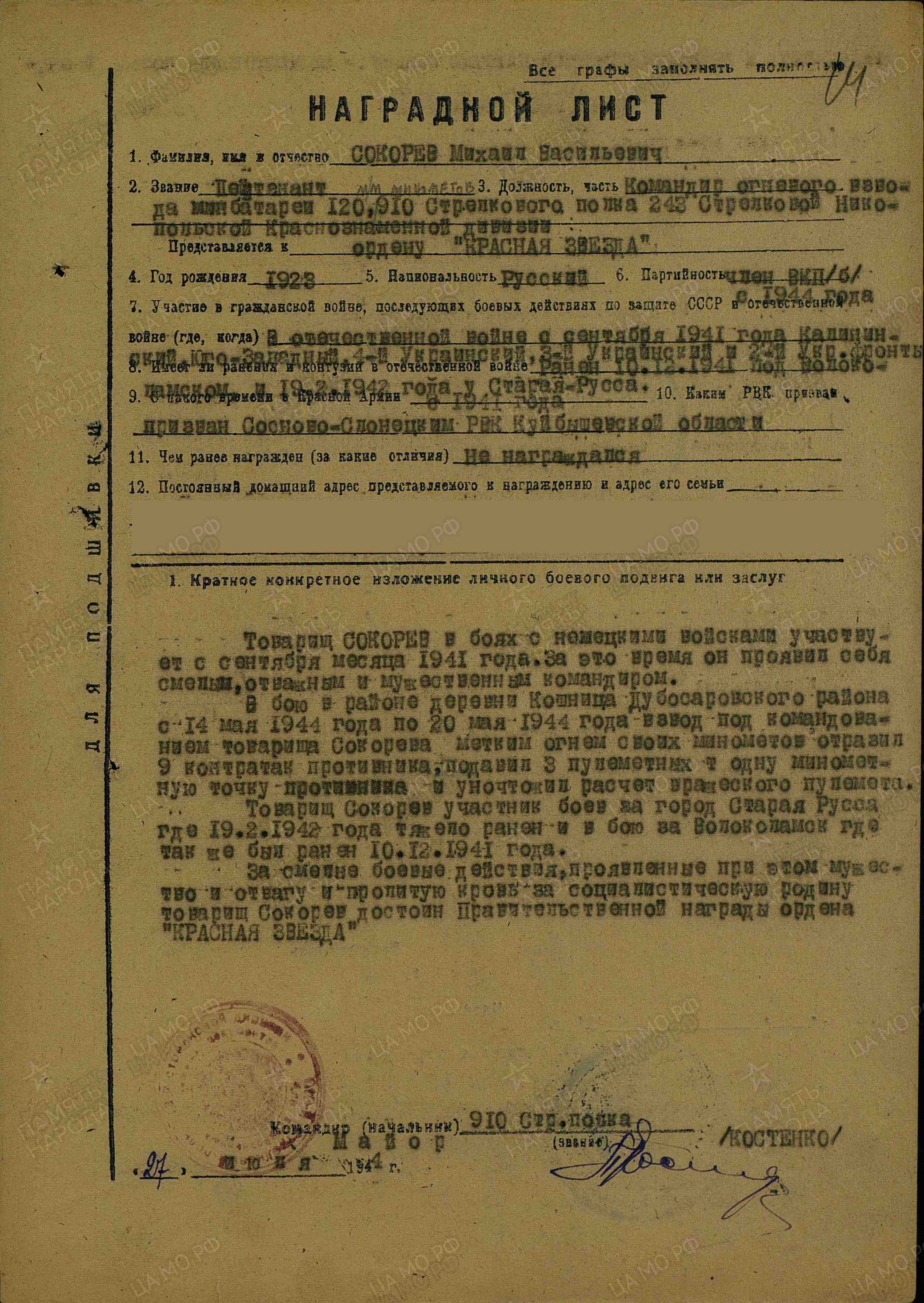 О войне Михаил Васильевич узнал в Куйбышеве, куда он приехал 21 июня к родст-венникам. А 22 июня ему пришла повестка из Молотовского военкомата г. Куйбышев. На фронт Михаила взяли в июле – по Сталинскому призыву, в воздушно-десантные войска. Первый свой бой принял Михаил 6 декабря под Москвой. Долгие военные дороги выпали на долю Сокорева, прошел солдат через многие испытания и встретил долгожданную победу в Европе, под Будапештом. Затем служил на Забайкальской фронте. В послевоенные годы Михаил Васильевич проработал много лет начальником участка Яблоневского месторождения. Награды: орден Отечественной войны II степени (дважды). Тов. Сокорев в боях с немецкими войсками участвует с сентября 1941 г. За это время он проявил себя смелым, отважным и мужественным командиром. В бою в районе в деревне Кошница Дубоссаровского района с 14 мая по 20 мая 1944 г. взвод под командованием тов. Сокорева метким огнем своего минометов отразил 9 контратак противника, подавил 3 пулеметных и 1 минометную точку противника и уничтожил расчет вражеского пулемета. Тов. Сокорев участник боев за г. Старая Русса, где 19 февраля 1942 г. тяжело ранен. В бою за Волоколамск был ранен 10 декабря 1941 г. За смелые боевые действия, проявленные при этом мужество и отвагу и пролитую за Социалистическую Родину кровь тов. Сокорев достоин правительственной награды – ордена Красной Звезды (награжден орденом Отечественной войны II степени; наградной лист от 27.06.1944 г.).
