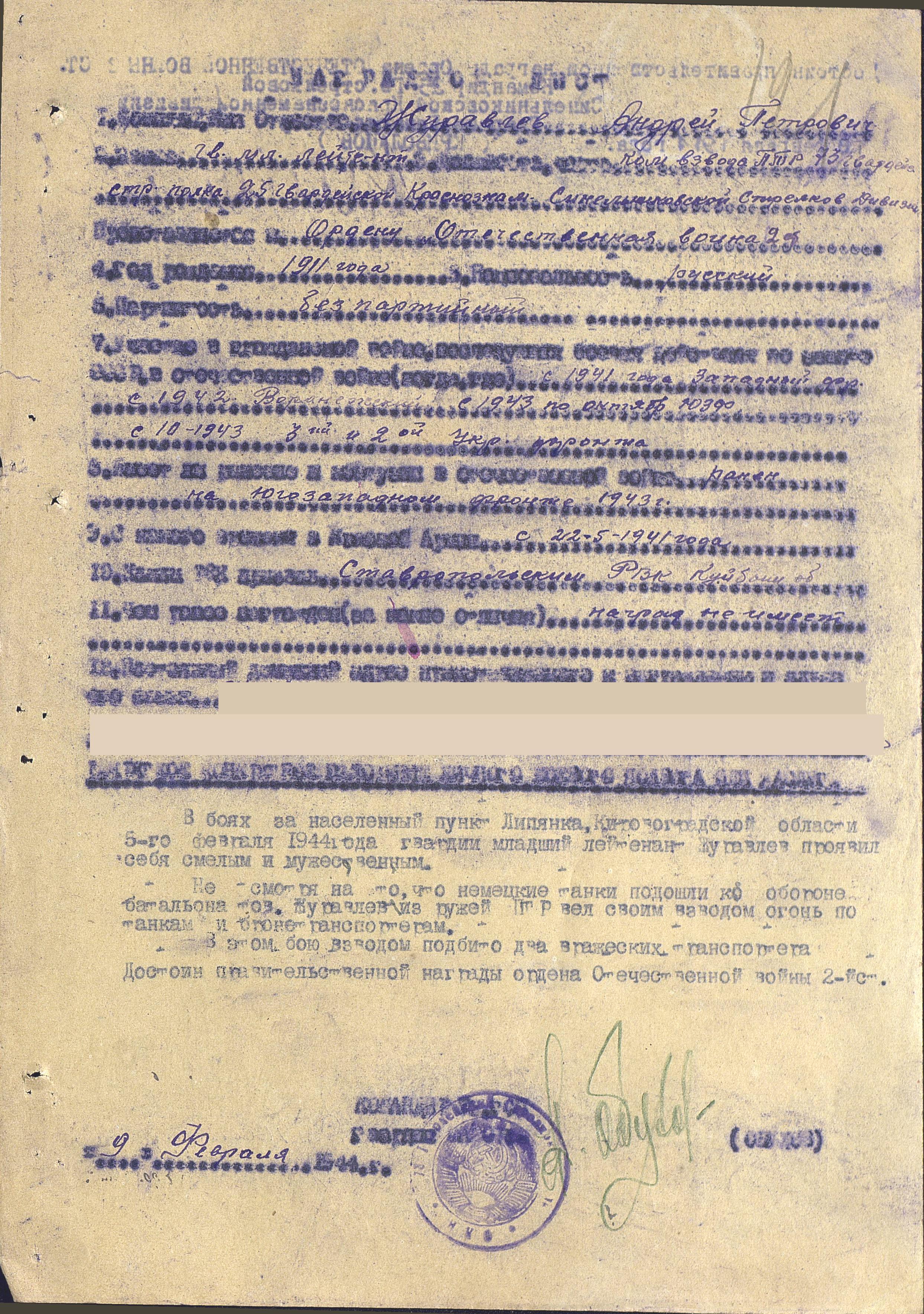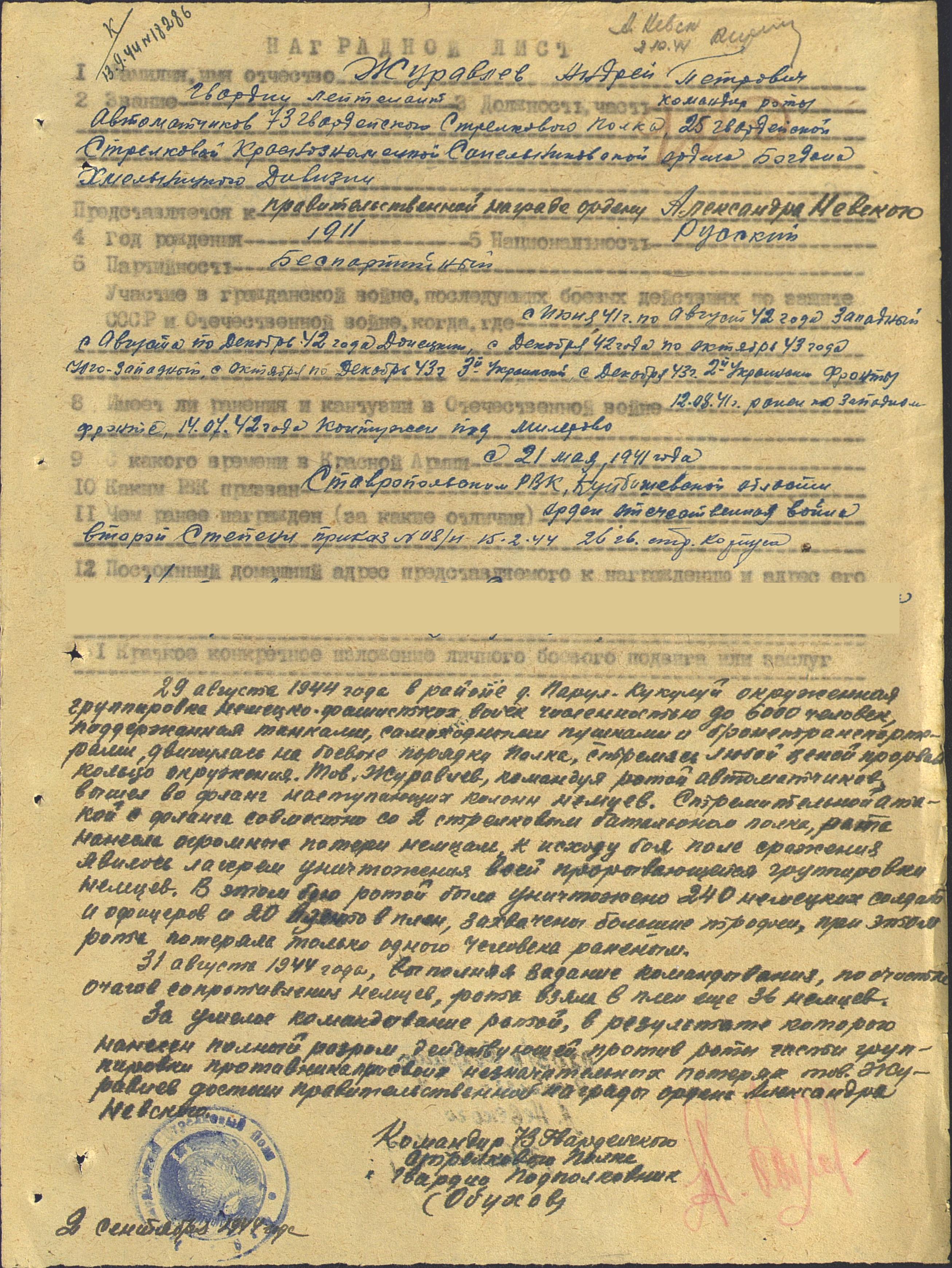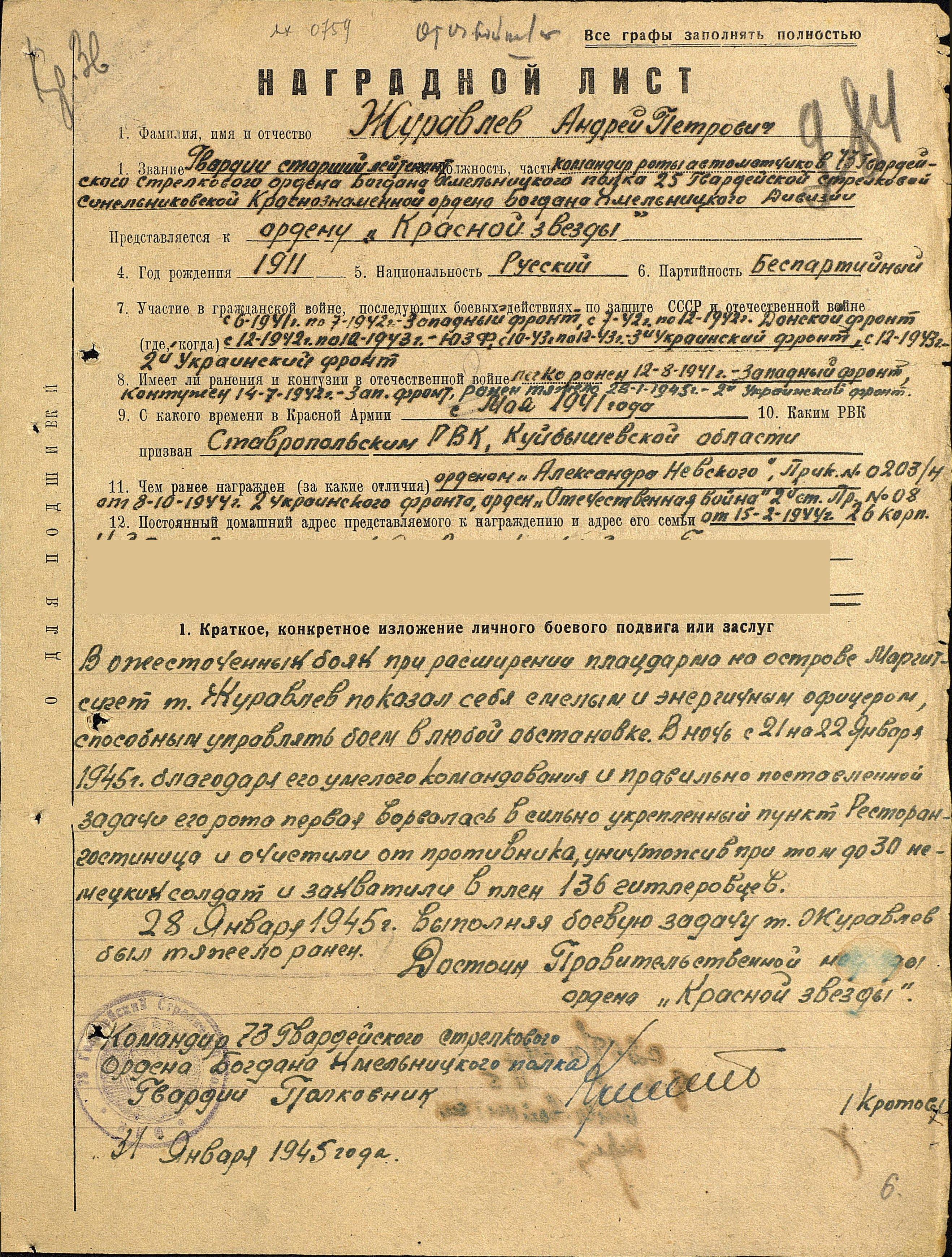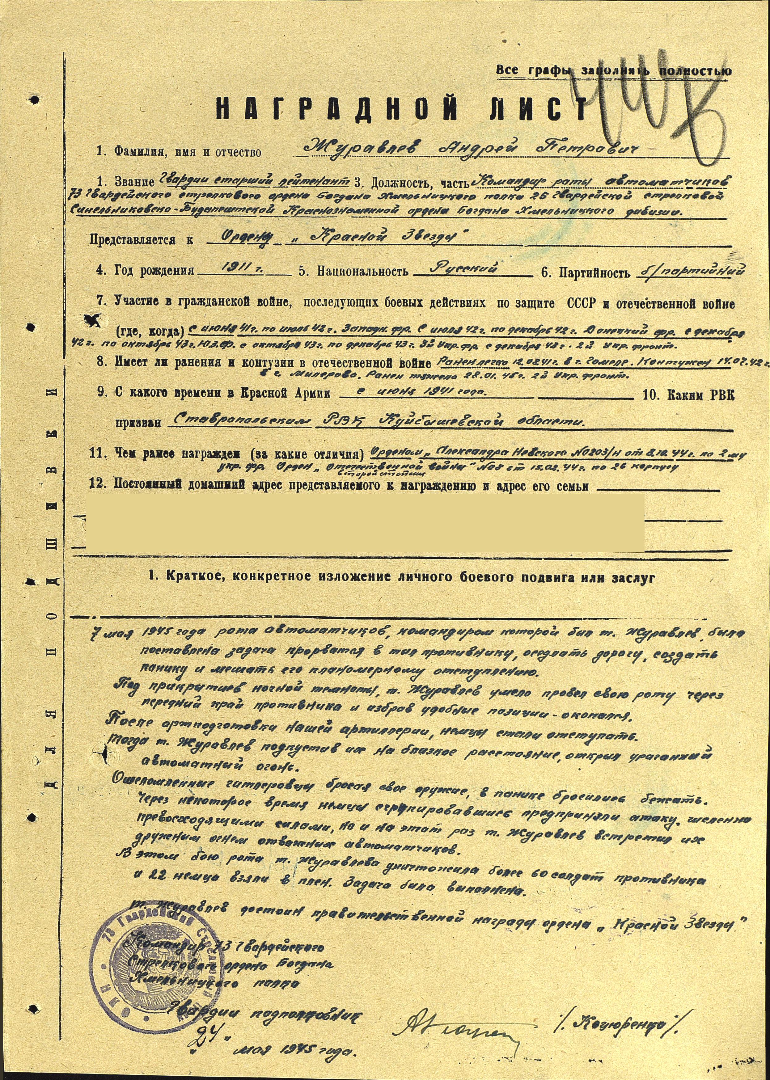 Родился 22 сентября 1911 г. в с. Ташелка Ставропольского района Куйбышевской области. До войны женился, воспитывал двух дочек. Трудился на МТС слесарем. В стадную пору уходил засветло, и приходил затемно. 21 мая Андрею Павловичу и другим односельчанам пришла повестка на 45-дневные сборы. Простились с семьями попросту – не знали, что долго не вернутся домой. Попали в Тоцкие лагеря. А в середине июня подняли всех по тревоге, в ночь с 14 на 15 июня посадили в военный эшелон и отправили в Западную Украину на маневры. 22 июня прибыли на станцию Буда-Кошелёво. Кругом тревожная суета, большое скопление военных. Затем – митинг: «Товарищи! Сегодня в четыре часа утра…». Первый бой рядовой Журавлев А.П. принял под г. Жлобин на берегу Днепра. Батарея артиллеристов, где Андрей Петрович был наводчиком орудия, уничтожила 6 танков. «Первые дни войны оказались особенно тяжелыми. Натиск немцев был мощным: артобстрелы, бомбежки, танки – все это приводило порой наших солдат в панику, сказывалась и неопытность командиров»,- вспоминал фронтовик. Воевал в Полтавской, Орловской областях, держал оборону на московско-смоленском направлении. Все пережил Андрей Петрович: отступление, неравные бои, окружение, ранения и гибель друзей однополчан. Горько и тягостно было смотреть на беженцев, искореженную взрывами землю, пепелища сел и городов. «Не раз приходилось выбираться из окружения. Нашу часть немец разбил основательно, много полегло солдат, а оставшиеся в живых выходили, как могли. И попадали в «особый отдел». Из остатков бывшей армии сформировали батальон, и я попал в конную разведку. А когда в полку стала формироваться артиллерийская батарея, меня вновь определили туда наводчиком». Воевал на Воронежском, Западном, Донском 2-м и 3-м Украинских фронтах. В августе 1941 г. – ранение, в июле 1942 г. – контузия. В 1943 г. в одном из боев на Юго-Западном фронте Андрей Петрович получил сквозное ранение в ногу. После госпиталя был направлен в 73-й гвардейский стрелковый полк 25-й гвардейской Краснознаменной Синельниковской стрелковой дивизии. Его послали на курсы командиров, и в середине августа 1943 г. младший лейтенант Журавлев А.П. назначен командиром взвода ПТР (противотанковое ружье). Участвовал в разгроме группировки противника в Корсунь-Шевченковской операции. В сентябре 1944 г. за смелость, проявленную в боях, уже лейтенант Андрей Петрович награжден орденом Отечественной войны II степени. В 1944 г. ему присвоено звание старший лейтенант, назначили командиром роты автоматчиков. Прикрывая переправу через Дунай, Андрей Петрович был ранен двумя пулями в легкие. Из госпиталя выписался в апреле 1945 г. Его назначили заместителем командира батальона. Демобилизовался в марте 1946 г. в звании капитана. Вернулся домой с пулей в груди, работал в колхозе. Умер 30 апреля 1992 г.