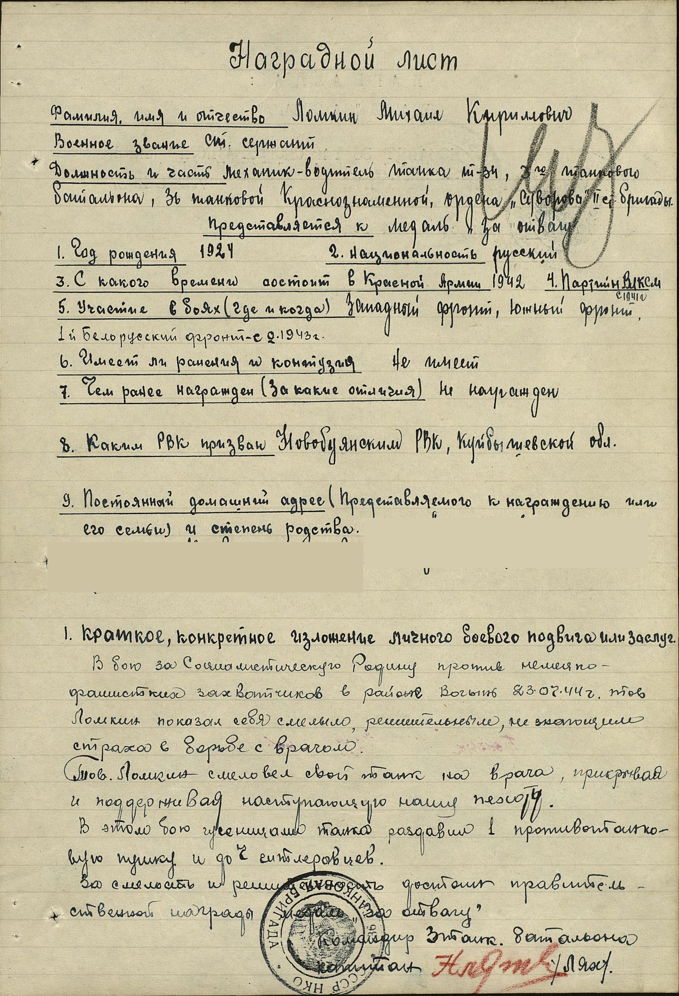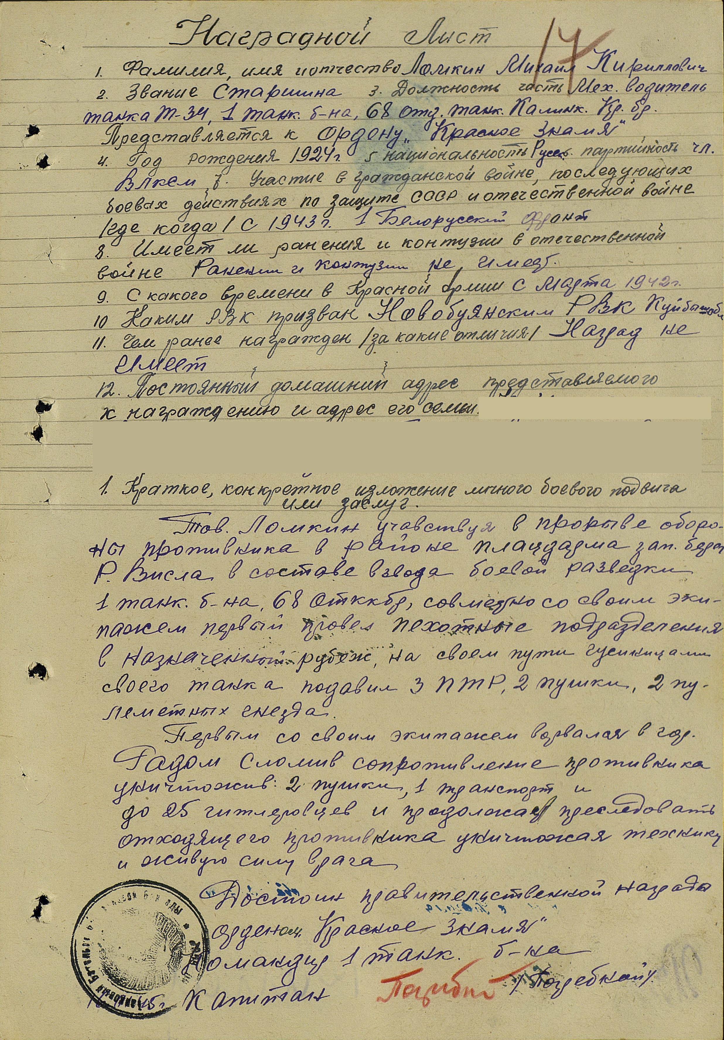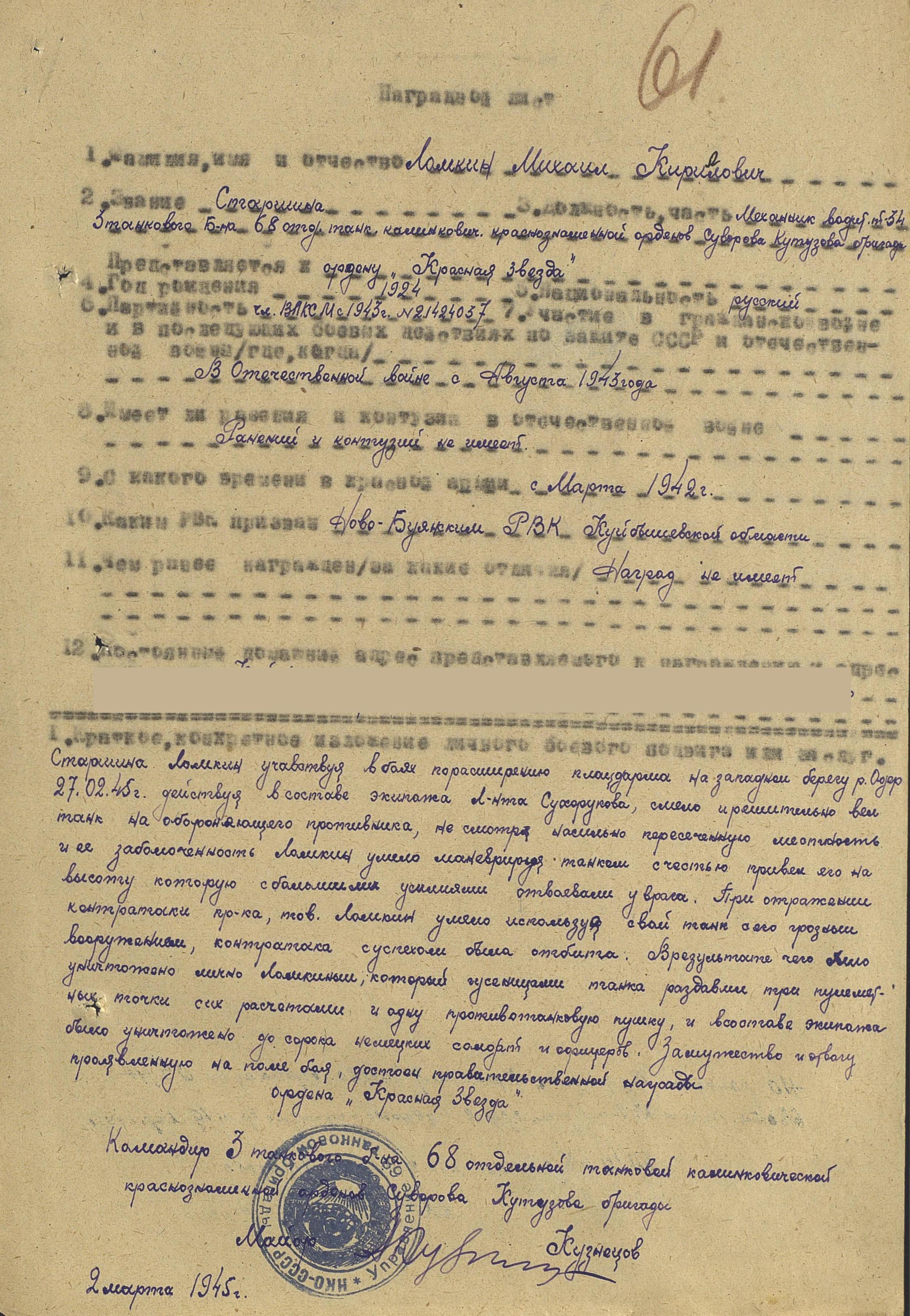 Родился 7 августа 1924 г. в с. Ташла Ново-Буянского (ныне Ставропольского) района Куйбышевской области. Окончил 7 классов Ташлинской школы, работал трактористом в колхозе. В августе 1942 г. мобилизован в Красную армию, направлен на курсы младших командиров. После окончания, в феврале 1943 г., получив новый танк Т-34 в Нижнем Тагиле, Михаил Кириллович начинает свой боевой путь в 3-м танковом батальоне 36-й танковой бригады механиком-водителем танка в звании сержант. Воевал на Западном, Южном, 1-м Белорусском фронтах. «В бою 23 июля 1944 г. гусеницами своего танка раздавил 1 противотанковую пушку противника и до 7 гитлеровцев, смело вел свой танк на врага, прикрывая и поддерживая пехоту» (представление к медали «За отвагу»). Со второй половины 1944 г. Михаил Кириллович воевал в 1-м танковом батальоне 68-й отдельной танковой Краснознаменной бригады в звании старшина. «В феврале 1945 г., участвуя в прорыве обороны противника в районе плацдарма западного берега Вислы в составе взвода боевой разведки, совместно со своим экипажем первый провел пехотное подразделение в назначенный рубеж, на своем пути танком подавил 3 противотанковых ружья, 2 пушки, 2 пулеметных гнезда. Первым ворвался в город Радом, сломив сопротивление противника, уничтожив 2 пушки, 1 транспорт и до 25 гитлеровцев и продолжил преследовать отходящего противника, уничтожая технику и живую силу врага» (представление к ордену Красного Знамени). «Старшина Ломкин, участвуя в боях по расширению плацдарма на западном берегу реки Одер 27 февраля 1945 г., смело и решительно вел свой танк на обороняющегося противника, несмотря на сильно пересеченную местность и ее заболоченность. При отражении контратаки противника, умело маневрируя, уничтожил гусеницами танка 3 пулеметных точки с их расчетами и 1 противотанковую пушку, вместе с экипажем Т-34 уничтожил до 40 немецких солдат и офицеров. Контратака была с успехом отбита» (представление к ордену Красной Звезды). После победы еще 2 года служил комендантом в Германии. Демобилизовался в 1947 г. Вернувшись на родину, трудился Михаил Кириллович трактористом в колхозе «Заря». В 1982 г. вышел на пенсию, работал заведующим гаражом. Умер 1 марта 1995 г.