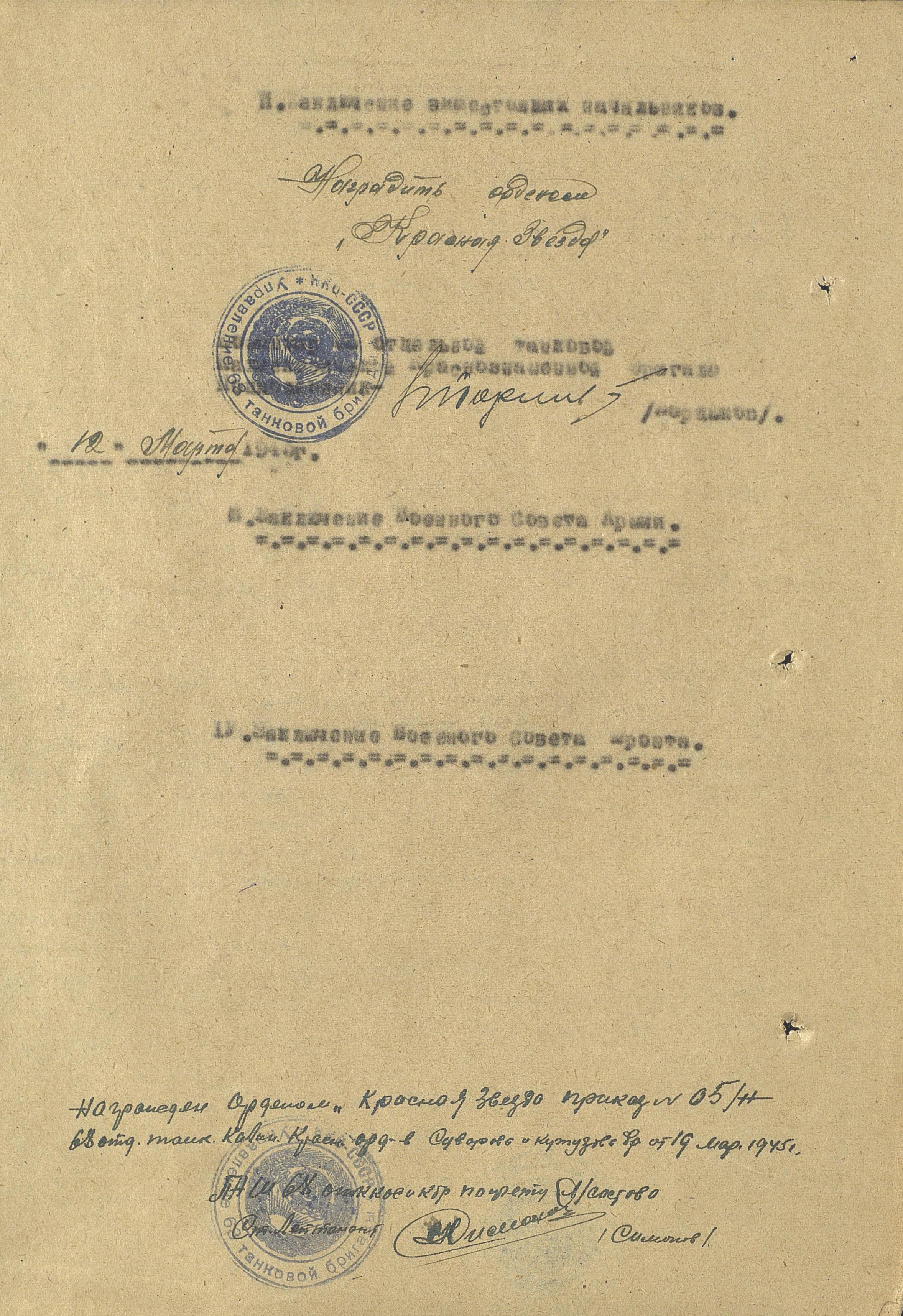 Награды: орден Красного Знамени, орден Красной Звезды, медали «За отвагу», «За освобождение Варшавы», «За взятие Берлина», «За победу над Германией в Великой Отечественной войне 1941-1945 гг.».