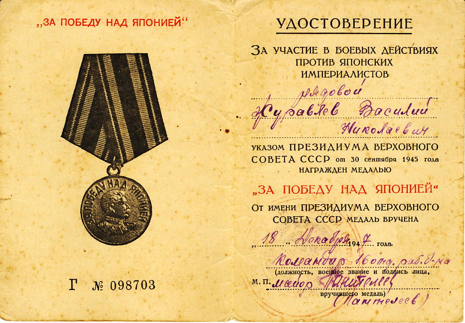 Родился 27 августа 1925 г. в с. Михайловка Ново-Буянского района Куйбышевской области. Василий Николаевич перед войной работал извозчиком в колхозе «15 лет Октября» в с. Новый Буян. Призван в ряды РККА в 1943 г. Служил на Дальнем Востоке, где защищал границы Родины от боевых действий японских империалистов. Затем участвовал в боевых действиях в войне с Японией в августе-сентябре 1945 г. Часть, где служил Василий Николаевич, первой вступила в бои с японцами. Демобилизовался осенью 1950 г., вернулся на родину, трудился в колхозе. После выхода на пенсию 2 года работал конюхом. Умер 15 августа 1987 г. Награды: медаль «За победу над Японией».