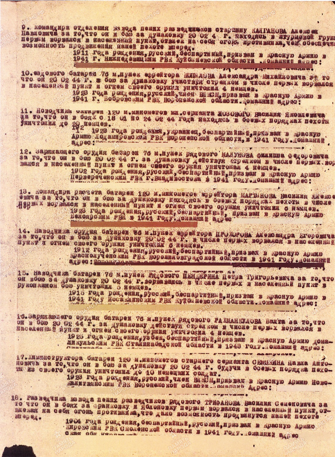 Призван по мобилизации Новодевическим РВК в первые дни войны. 3 года он служил в разведывательной роте 335-го стрелкового полка 58-й стрелковой дивизии. По заданию командования часто ходил в тыл врага, попадал в сложные ситуации. Состав разведроты постоянно обновлялся, так как не все возвращались с задания. Он вспоминал, как разведгруппу в 25 человек послали взять «языка». Бойцы выполнили задание, но, когда по полю возвращались в часть, были обнаружены противником и попали под шквальный минометный огонь. Разведчики пытались спрятаться за копнами хлеба и отстреливаться, но это была слабая защита. Почти вся группа полегла на том поле, в том числе был убит и «язык». В часть вернулись 3 человека. Как опытного разведчика, гвардии старшину Колганова А.П. назначили командиром отделения взвода. В январе 1944 г. 58-я дивизия входила в состав 6-й танковой армии 1-го Украинского фронта и участвовала в Корсунь-Шевченковской наступательной операции. «20 февраля 1944 г. в бою за Душаковку, находясь в штурмовой группе, первым ворвался в населенный пункт, отвлекая на себя огонь противника, чем обеспечил возможность продвижения пешей пехоте вперед», - из приказа о награждении медалью «За отвагу». Имеет ранения. После очередного ранения был переведен в хозблок. Он выпекал хлеб для бойцов. Тогда наша армия освобождала страны Европы. Алексей Павлович вспоминал, как однажды, работая в походной пекарне, на них вдруг вышла группа немецких солдат, отставших от своих частей. Не растерявшись, бывший разведчик схватился за винтовку и вступил с ними в бой. Алексей Павлович прошел всю войну, победу встретил в Праге. Демобилизовавшись, он вернулся в свою родную Дальнюю Поляну, где его ждала жена и трое детей. Работал бригадиром, председателем колхоза. Всего у него было 7 детей. Умер в 1982 г.