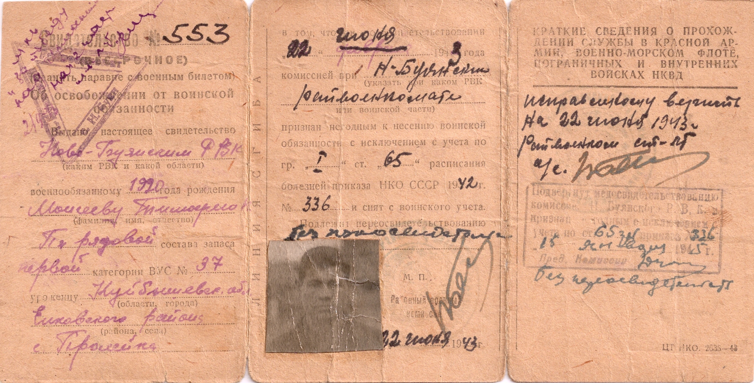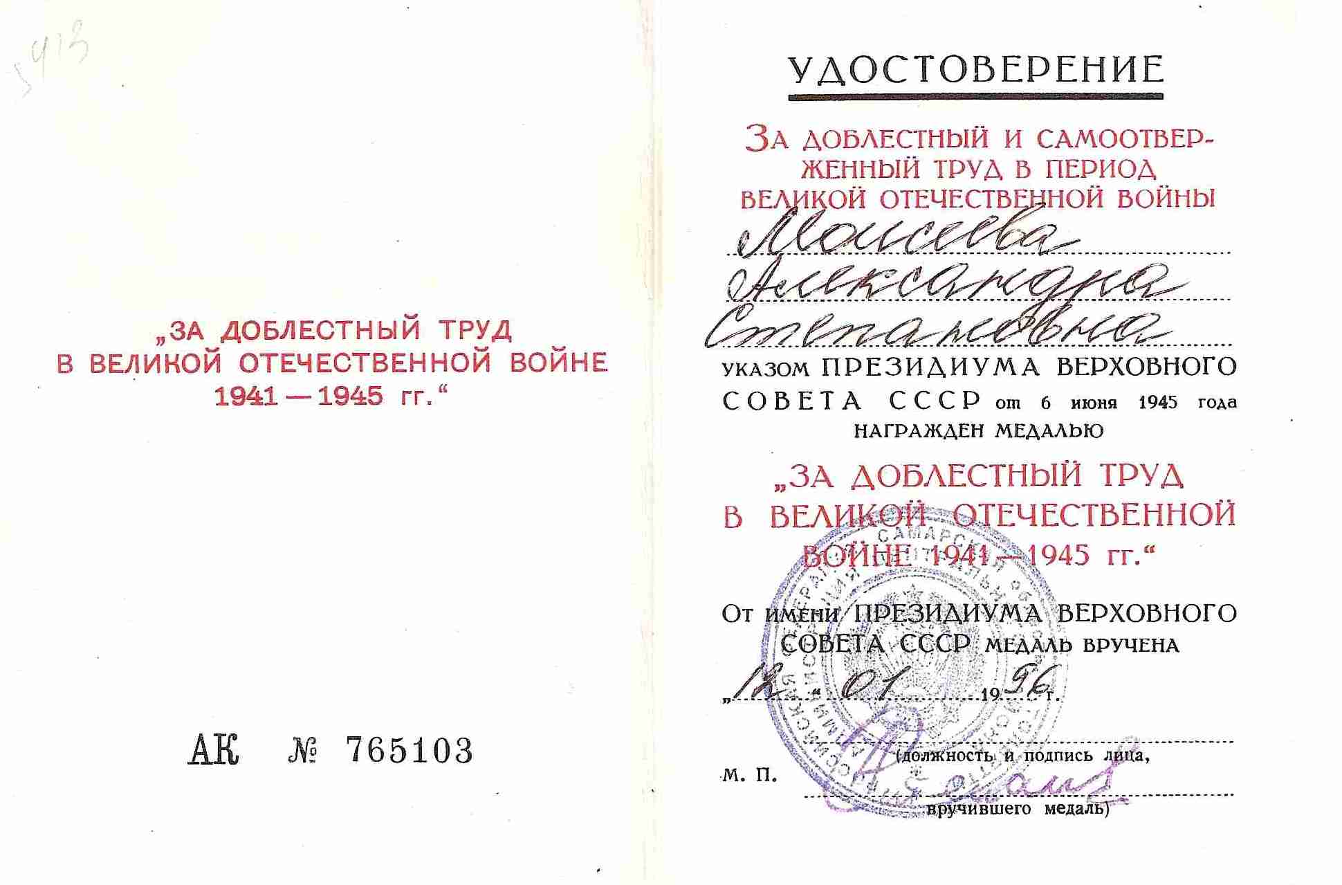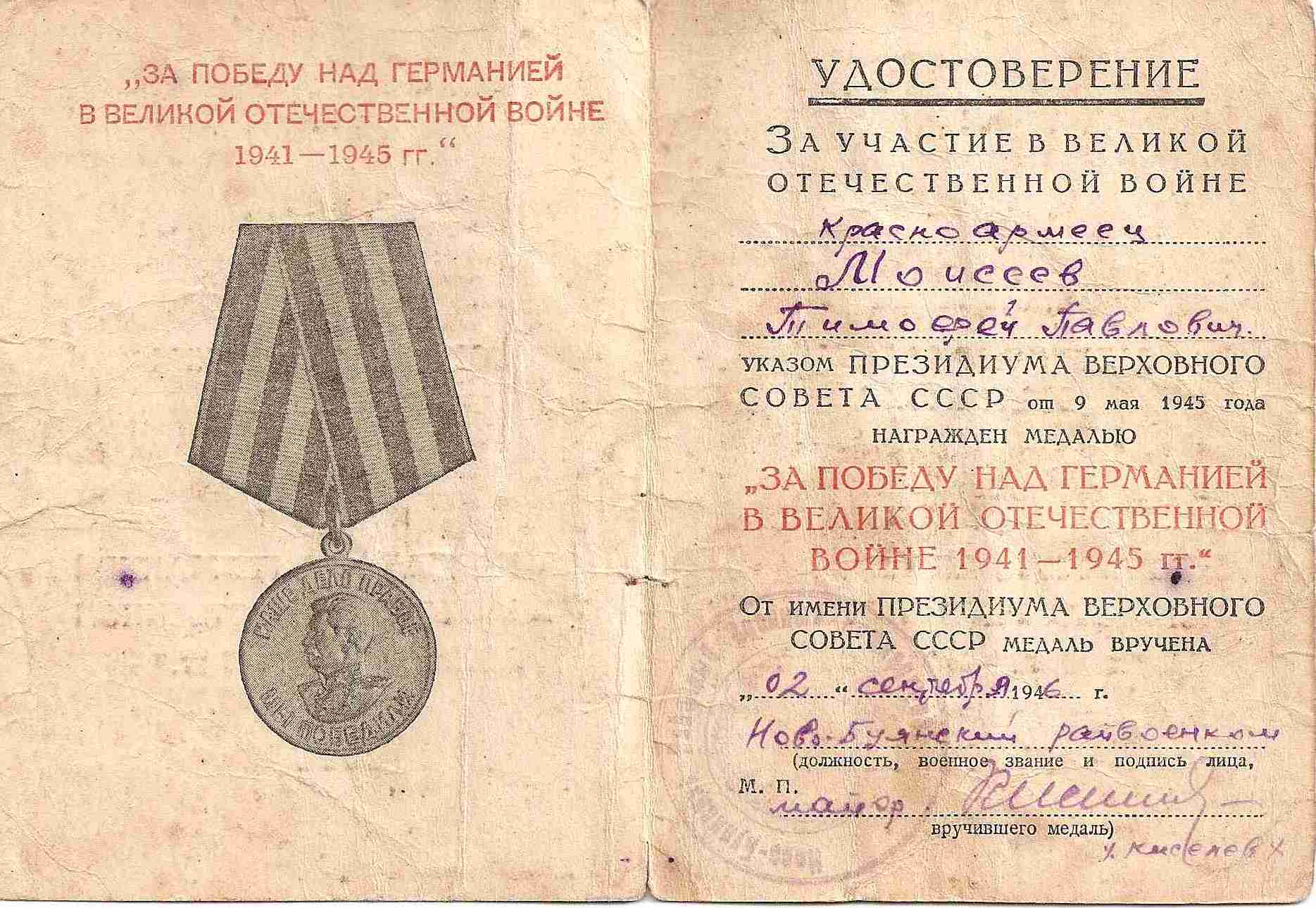 Родился 16 января 1920 г. в с. Пролейка Елховского района Куйбышевской области. Будучи ещё в несовершеннолетнем возрасте, остался круглым сиротой, проживал у тётки в г. Москве. Перед призывом на срочную военную службу работал в железнодорожном депо. В 1940 г. Октябрьским РВК г. Москвы был призван на срочную службу в ряды РККА. Служил в звании рядовой в должности механика-водителя бронемашины 58-го мотострелкового полка в составе 30-го механизированного корпуса, дислоцировавшегося тогда в Дальневосточном военном округе. Оттуда в октябре 1941 г. его мотострелковый полк был в срочном порядке переброшен на защиту Москвы. В то время Подмосковье подвергалось массированной бомбардировке немецко-фашистской авиацией. Отец нам рассказывал, что их часть находилась под городом Клин, с 23 ноября по 15 декабря 1941 г. оккупированный немецкими войсками. 4 ноября 1941 г., возвратившись из разведки на бронемашине, он вместе с экипажем зашел в какую-то постройку в прифронтовой полосе погреться и прислонился спиной к печке. В это время началась бомбардировка. Одна из бомб угодила в постройку, при этом её осколком отец был ранен в правую руку (был выбит локоть). В сознание пришёл только тогда, когда санитарка перематывала раненую руку полотенцем. Далее началась эвакуация в госпиталь в открытом кузове грузовика. Было очень холодно. Лечился в эвакогоспитале №3887 в 3-м хирургическом отделении с 27 ноября по 20 декабря 1941 г. Там правую руку ампутировали. Тогда отцу шёл всего лишь 22 год. 22 июня 1943 г. комиссией при Ново-Буянском РВК признан негодным к несению воинской обязанности. Война продолжалась ещё долгих 4 года, в Москву тогда не пускали, и Тимофей Павлович отправился к сводной сестре в Мелекесский район Ульяновской области. Отец окончил ускоренные курсы ветеринаров и стал работать в колхозе им. Н. Крупской Ульяновской области. Там познакомился с Малакановой Александрой Степановной. Они поженились, построили дом в с. Ташла. Воспитали четверых детей. До мая 1969 г. жили и работали в колхозе «Заря» Ставропольского района. В феврале 1945 г. Ново-Буянский РВК подал наградной лист в Верховный Совет СССР с ходатайством о представлении Тимофея Павловича к ордену Красной Звезды. В августе 1946 г. вышел Указ Верховного Совета СССР о награждении бойца орденом Славы III степени. Затем родители переехали в г. Тольятти, отец трудился в грузовом автотранспортном предприятии работником гаражной службы. Последние годы своей жизни родители жили вместе с моей семьёй в с. Тимофеевка Ставропольского района Самарской области. Александра Степановна прожила 87 лет, Тимофей Павлович - 92 года (умер в 2012 г.). Похоронены на кладбище в с. Ташла. Моисеева (Малаканова) Александра Степановна – труженица тыла, награждена медалью «За доблестный труд в Великой Отечественной войне 1941-1945 гг.» в 1996 г.