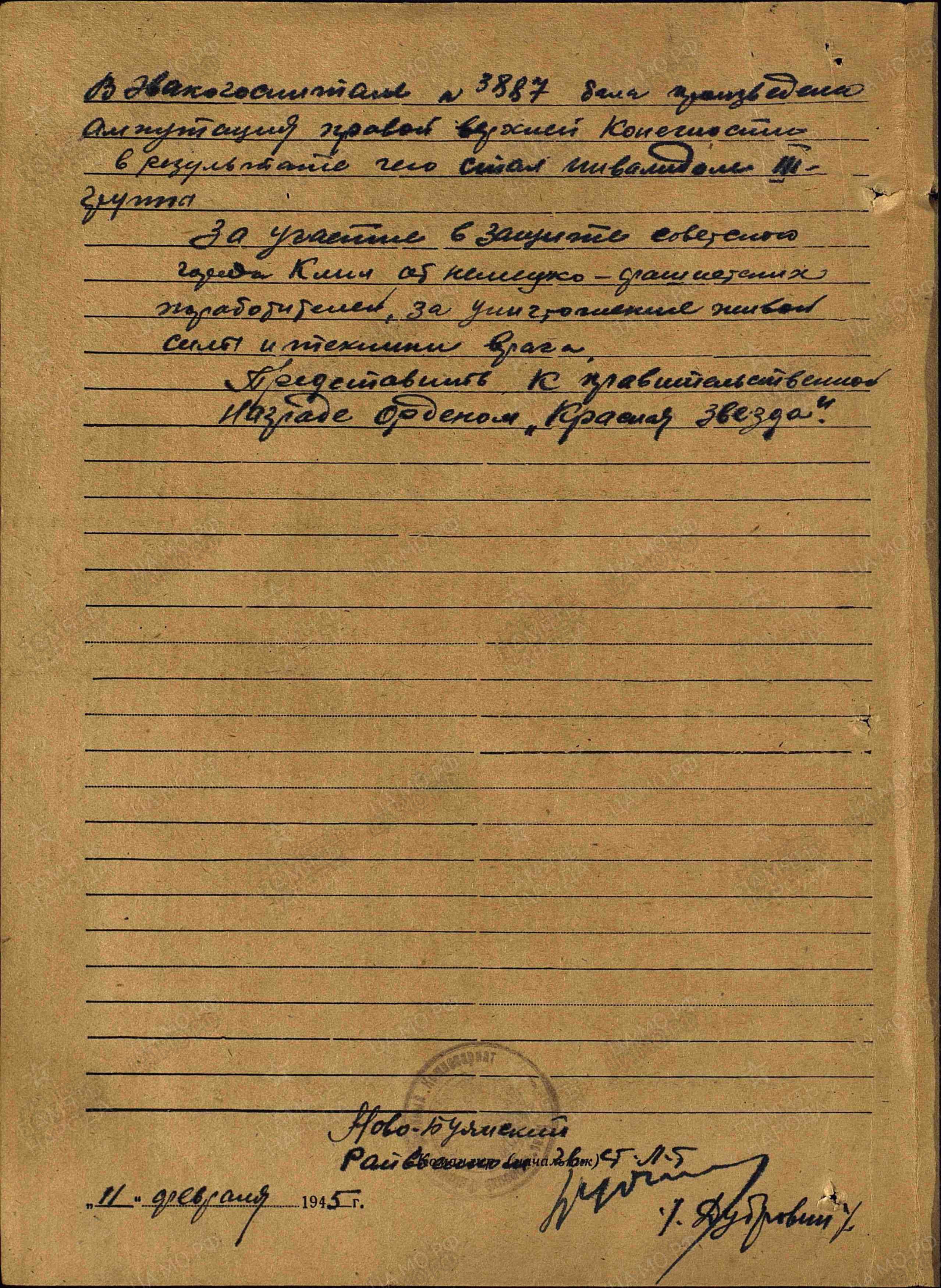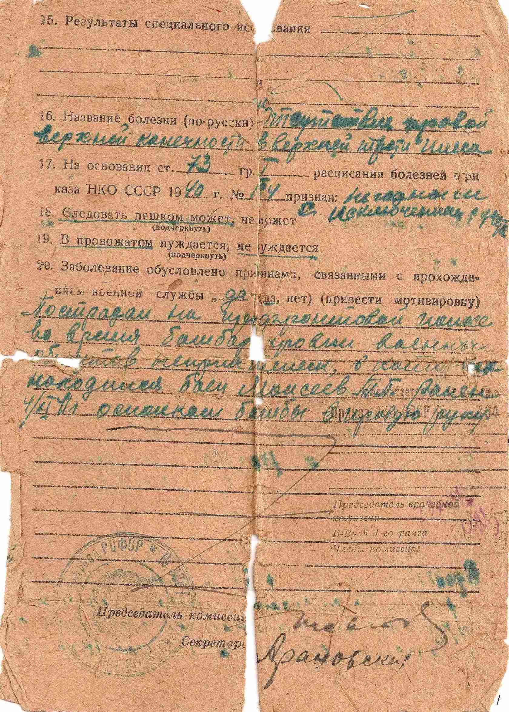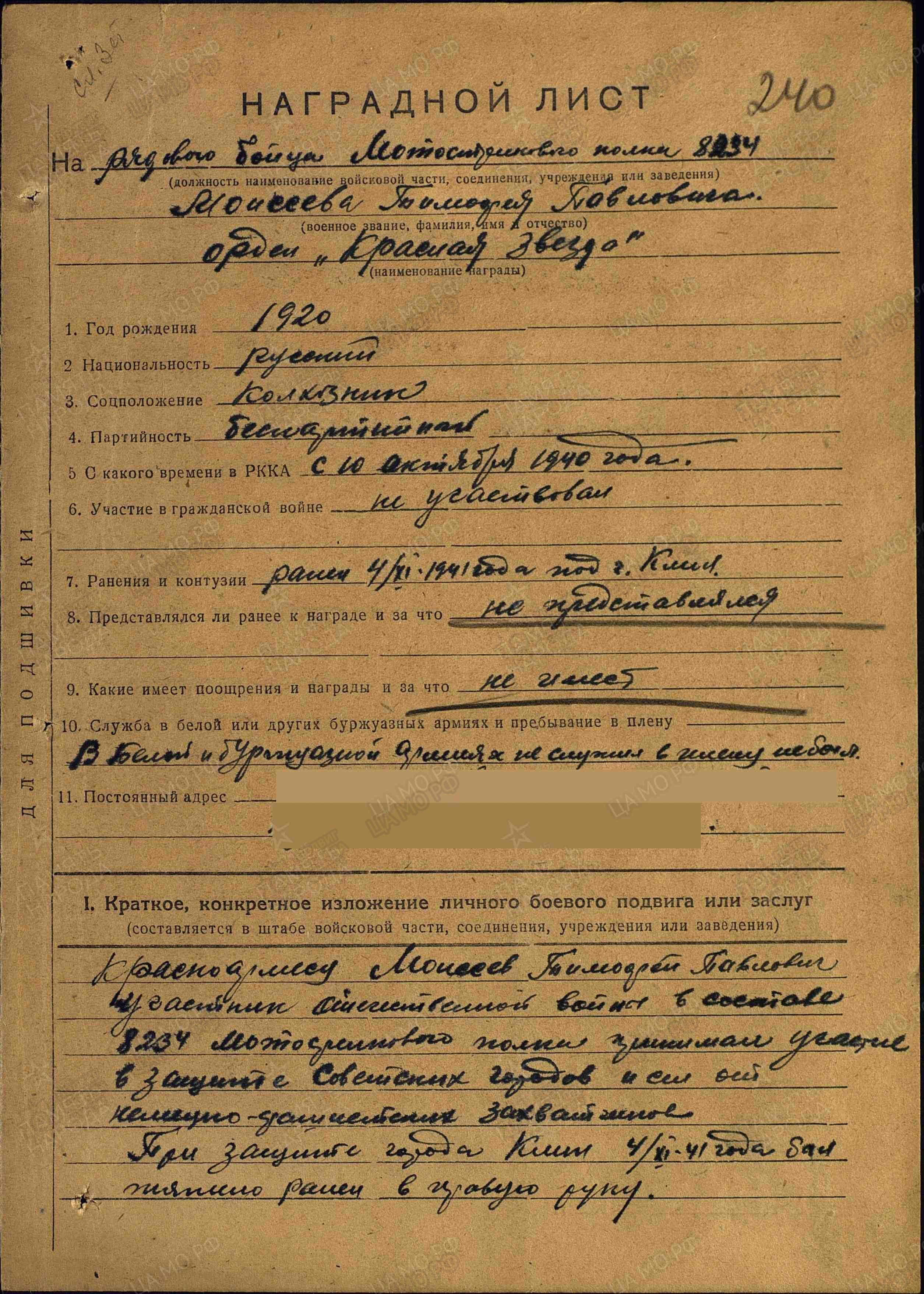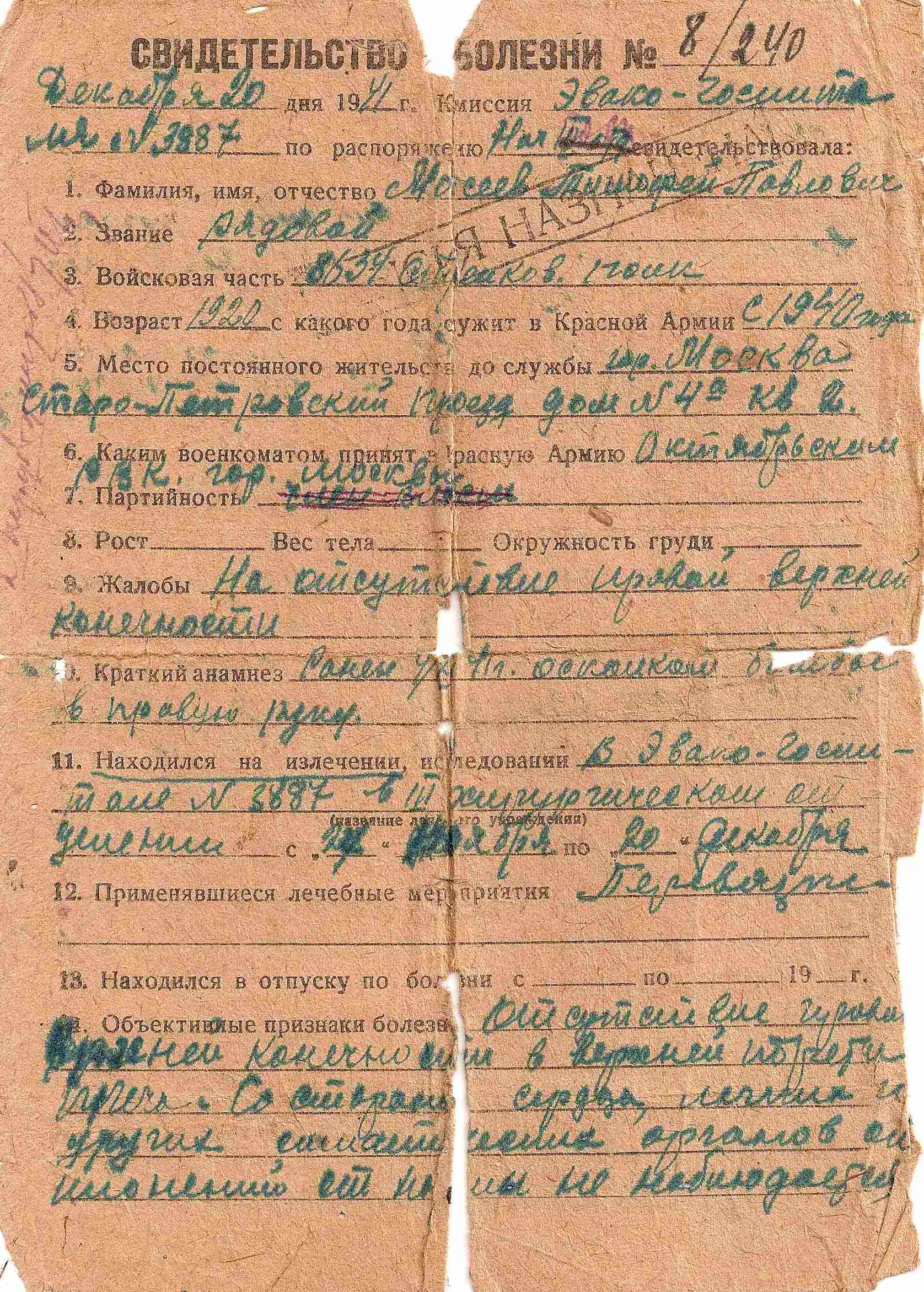 Родился 16 января 1920 г. в с. Пролейка Елховского района Куйбышевской области. Будучи ещё в несовершеннолетнем возрасте, остался круглым сиротой, проживал у тётки в г. Москве. Перед призывом на срочную военную службу работал в железнодорожном депо. В 1940 г. Октябрьским РВК г. Москвы был призван на срочную службу в ряды РККА. Служил в звании рядовой в должности механика-водителя бронемашины 58-го мотострелкового полка в составе 30-го механизированного корпуса, дислоцировавшегося тогда в Дальневосточном военном округе. Оттуда в октябре 1941 г. его мотострелковый полк был в срочном порядке переброшен на защиту Москвы. В то время Подмосковье подвергалось массированной бомбардировке немецко-фашистской авиацией. Отец нам рассказывал, что их часть находилась под городом Клин, с 23 ноября по 15 декабря 1941 г. оккупированный немецкими войсками. 4 ноября 1941 г., возвратившись из разведки на бронемашине, он вместе с экипажем зашел в какую-то постройку в прифронтовой полосе погреться и прислонился спиной к печке. В это время началась бомбардировка. Одна из бомб угодила в постройку, при этом её осколком отец был ранен в правую руку (был выбит локоть). В сознание пришёл только тогда, когда санитарка перематывала раненую руку полотенцем. Далее началась эвакуация в госпиталь в открытом кузове грузовика. Было очень холодно. Лечился в эвакогоспитале №3887 в 3-м хирургическом отделении с 27 ноября по 20 декабря 1941 г. Там правую руку ампутировали. Тогда отцу шёл всего лишь 22 год. 22 июня 1943 г. комиссией при Ново-Буянском РВК признан негодным к несению воинской обязанности. Война продолжалась ещё долгих 4 года, в Москву тогда не пускали, и Тимофей Павлович отправился к сводной сестре в Мелекесский район Ульяновской области. Отец окончил ускоренные курсы ветеринаров и стал работать в колхозе им. Н. Крупской Ульяновской области. Там познакомился с Малакановой Александрой Степановной. Они поженились, построили дом в с. Ташла. Воспитали четверых детей. До мая 1969 г. жили и работали в колхозе «Заря» Ставропольского района. В феврале 1945 г. Ново-Буянский РВК подал наградной лист в Верховный Совет СССР с ходатайством о представлении Тимофея Павловича к ордену Красной Звезды. В августе 1946 г. вышел Указ Верховного Совета СССР о награждении бойца орденом Славы III степени. Затем родители переехали в г. Тольятти, отец трудился в грузовом автотранспортном предприятии работником гаражной службы. Последние годы своей жизни родители жили вместе с моей семьёй в с. Тимофеевка Ставропольского района Самарской области. Александра Степановна прожила 87 лет, Тимофей Павлович - 92 года (умер в 2012 г.). Похоронены на кладбище в с. Ташла. Моисеева (Малаканова) Александра Степановна – труженица тыла, награждена медалью «За доблестный труд в Великой Отечественной войне 1941-1945 гг.» в 1996 г.