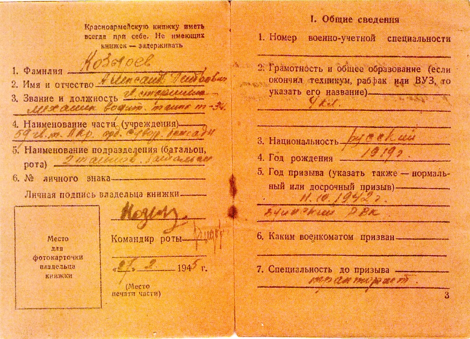 Родился в 1919 г. в с. Хрящевка Ставропольского района Куйбышевской области в многодетной семье – 7 сыновей и 2 дочери. До войны Александр окончил 4 класса школы, работал трактористом. В 1939 г. призван на срочную службу в ряды РККА. Когда началась Великая Отечественная война, его старший брат Иван призван на фронт в первые дни мобилизации, погиб в первых боях. Александр Петрович на фронт призван по мобилизации Ставропольским РВК в октябре 1942 г. Воевал на Северо-Западном фронте в 151-й отдельной стрелковой бригаде в разведывательной роте красноармейцем, с февраля 1943 г. – в 26-й Сталинской стрелковой дивизии командиром отделения. Был ранен. После госпиталя в марте 1943 г. Александр Петрович направлен в 29-й учебный танковый полк курсантом. В сентябре 1943 г. окончил курсы, получил звание гвардии младший сержант, был направлен механиком-водителем Т-34 в 99-ю гвардейскую танковую бригаду 8-го гвардейского танкового корпуса. Воевал на 1-м и 2-м Украинском фронте, участвовал в освобождении от гитлеровцев Сумской и Полтавской областей, других населенных пунктов Украины. «В борьбе с немецкими захватчиками показал образцы мужества, смелости и отваги. В боях за с. Вел. Букрин 28-29 сентября 1943 г. при отражении контратак противника умело маневрировал на поле боя своим танком, этим самым способствовал экипажу в ведении беспрерывного прицельного огня по врагу. В этом бою экипаж уничтожил 2 противотанковые пушки, 1 миномет, 1 автомашину и до 50 гитлеровцев», - из наградного листа на представление к медали «За отвагу». Александр Петрович переведен во 2-й танковый батальон 59-й гвардейской танковой Люблинской Краснознаменной ордена Суворова бригады 8-го гвардейского танко-вого корпуса, ему присвоили звание сержанта, затем старшего сержанта. Воевал на Воронежском, 1-м Белорусском фронтах, освобождал города и села Белоруссии, Молдавии, Польши. «В боях за г. Люблин (на востоке Польши) 24 июля 1944 г. танк Козырева одним из первых ворвался в город, раздавив на подступах 2 автомашины, 9 немцев. Благодаря мужеству и высокой боевой выучке в уличных боях танком было уничтожено: противотанковая пушка, миномет, 3 огневые точки в зданиях, 5 автомашин, 3 повозки с лошадьми и свыше 20 солдат. Продолжая преследование противника под сильным обстрелом, его танк ворвался в местечко Парасув, уничтожив при этом транспортер с пушкой и свыше 25 гитлеровцев», - из наградного листа на представление к ордену Отечественной войны II степени. Летом Александру Петровичу присвоено звание старшина. Отважный механик-водитель «в боях за овладение г. Прага 14 сентября 1944 года, смело и бесстрашно ведя свой Т-34 по городу во время уличных боев под сильным огнем противника, разбил баррикаду, пролетел противоположный ров, раздавил пушку с расчетом и уничтожил свыше 15 гитлеровцев», - из наградного листа на представление в ордену Красной Звезды. Александр Петрович воевал в Восточной Пруссии. За боевые подвиги в освобождении городов Европы, в захвате прусских населенных пунктов имеет 6 благодарностей от Верховного главнокомандующего. В 1945 г. он назначен старшим моторегулировщиком. Ему приходилось ремонтировать танки. «С 21 марта 1945 г. оказывал техническую помощь непосредственно на поле боя, устранил 6 неисправностей у Т-34, после чего танки продолжили выполнять боевую задачу. 29 марта 1945 г. в ожесточенном бою в районе с. Эм