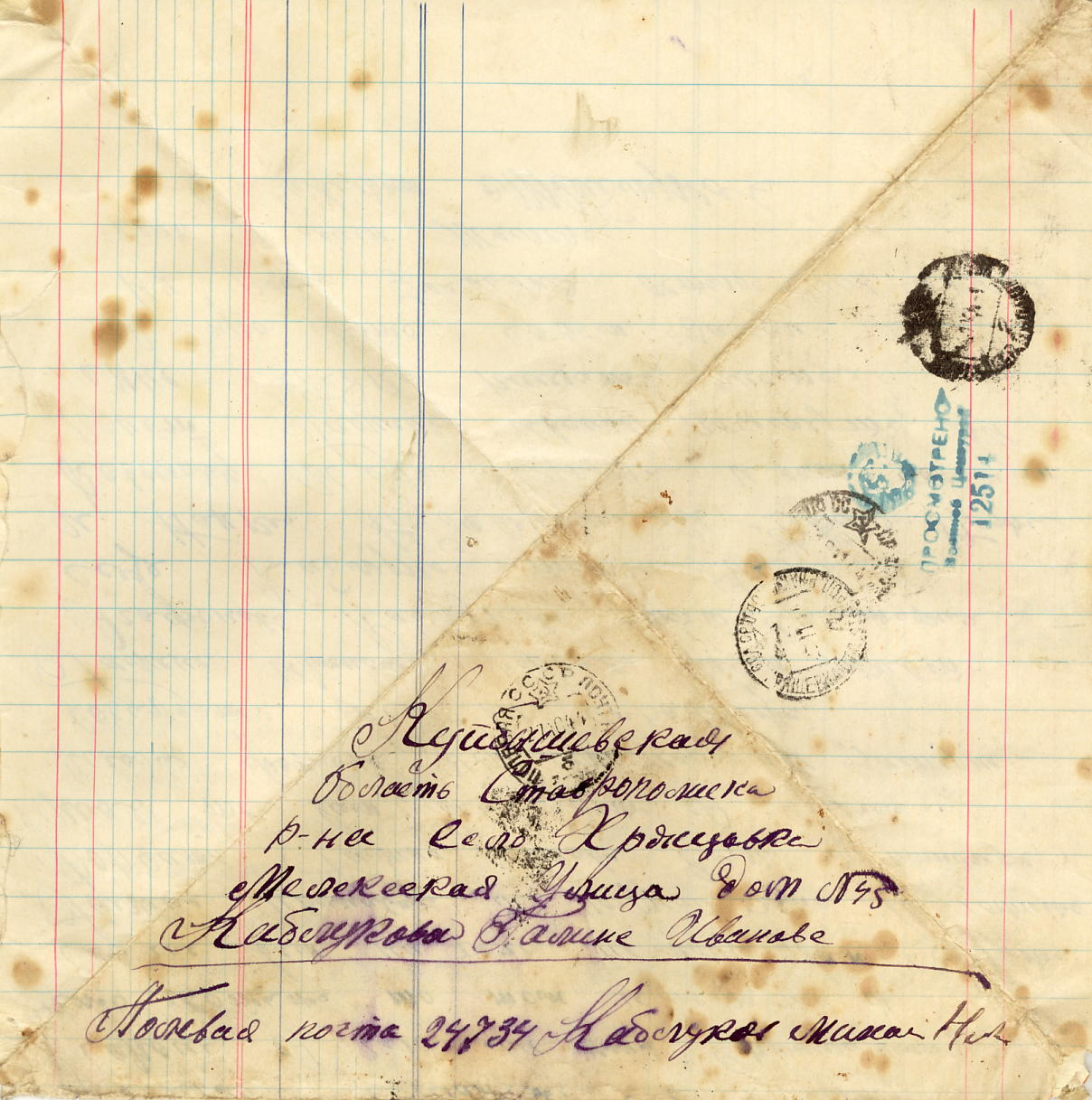 Каблуков М.Н. Письмо жене, 27 октября 1944 г. (2 стр.). Текст: Здравствуй, дорогая семья. Спешу я к вам с большим приветом горячим поцелуем и желаю всего хорошего в вашей настоящей жизни. Затем я вам сообщаю, что вашу открытку получил, за которую сердечно благодарю. Галина Ивановна, вы пишите в своей открытке, что вы просили у мамаши сшить себе хромовые сапоги. А чего вы меня спрашиваете, что хотите, то так и делайте. Я сейчас вам ничего не могу сделать. Галина Ивановна, я не знаю, что вы хотите форсить. Галина Ивановна, если я останусь жив, то вам все будет. А сейчас погоди форсить, или, может, вы замуж собираетесь, все вы (неразборчиво). Галина Ивановна, передавай всем привет Агафоновым, Каблуковым тете Екатерине, еще Каблуковым тете Дуне и Панке Нудовкиной и дяде Пете Ковшову и его супруге и всем соседям привет. Галина Ивановна, почему-то вы мне редко пишите письме. А про фото совсем забыли. Ну, пока до свидания, остаюсь жив и здоров, чего и вам желаю. С приветом, подпись.