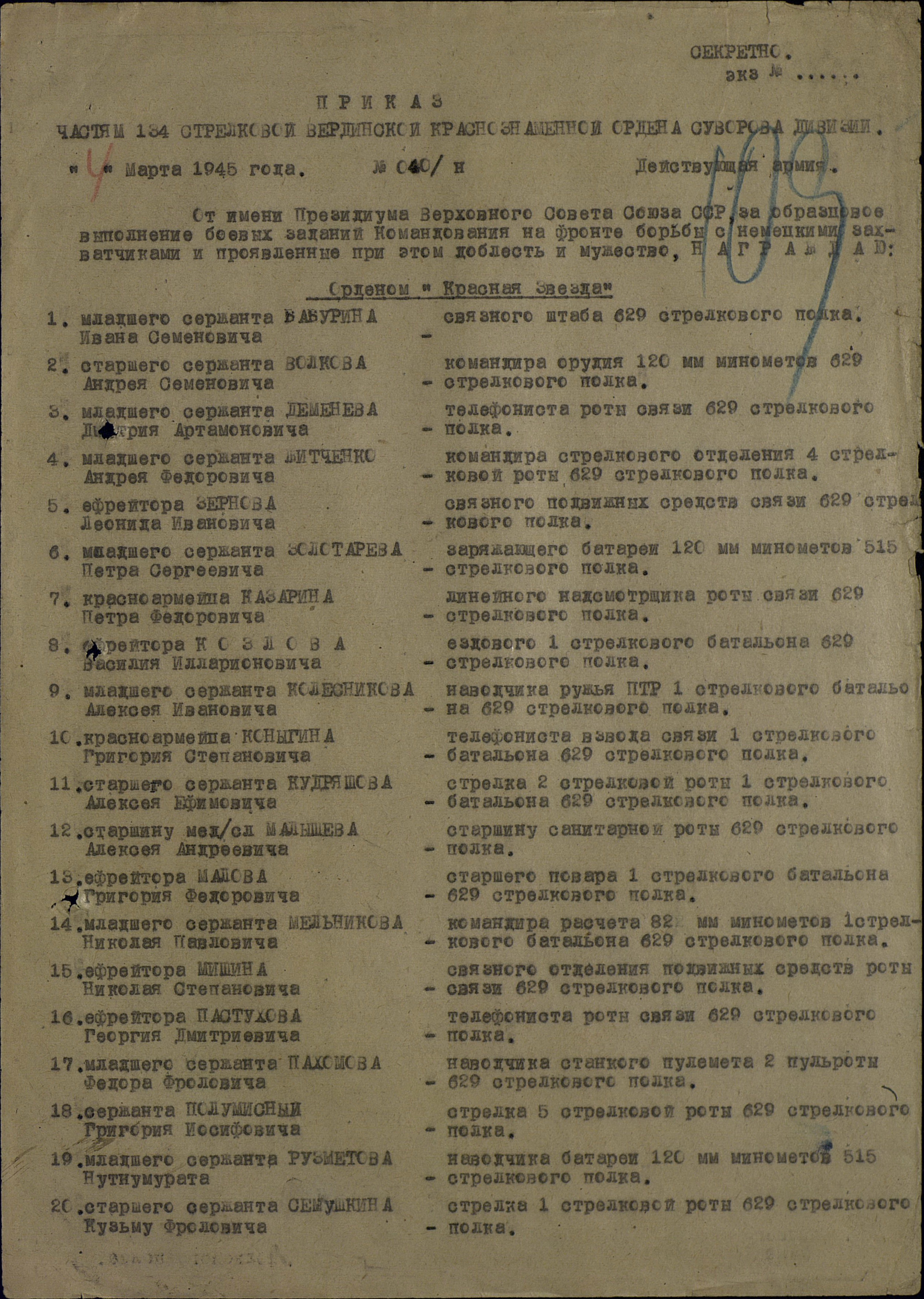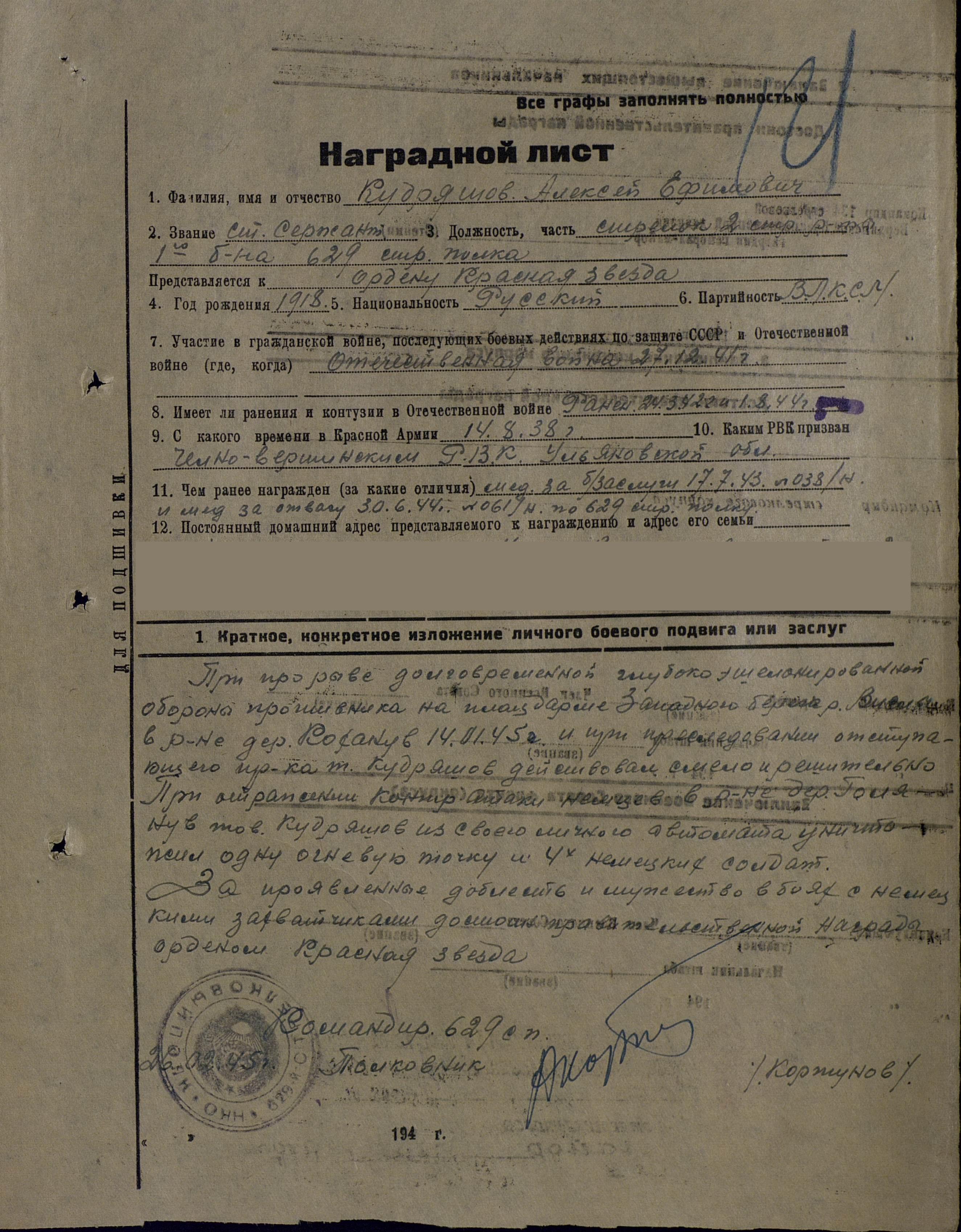 Кудряшов Алексей Ефимович родился 30.03.1918 года в с. Ново-Аделяково Челно-Вершинского района. Алексей Ефимович был призван в армию в 1938 году. Началась Великая Отечественная война, и старший сержант Кудряшов в составе 134 стрелковой Вердинской Краснознаменной ордена Суворова дивизии 629 стрелкового полка встал на защиту Отечества. Начал боевой путь в 1941 году на Ленинградском фронте. Долго воевал Кудряшов под Ленинградом. С 1941 по 24 марта 1942 года. В этот день его ранили. На излечение Алексея Ефимовича отправили в госпиталь на Урал, где и пролежал 5 месяцев. Дальше его фронтовая судьба отправила на Калининский фронт. Тяжело было, шли жестокие кровопролитные бои. Наступали фашисты очень уверенно, так как они обладали большой технической силой. Пришлось Алексею Ефимовичу воевать и на 1 Белорусском фронте, где за проявленную храбрость получил награду. Нелегкая солдатская дорога довела его до Одра. Форсировал и Вислу. «14 января 1945 года при прорыве долговременной, глубоко эшелонированной обороны противника на плацдарме западного берега реки Висла в районе деревни Коханув и при преследовании отступающего противника комсомолец Кудряшов действовал смело и решительно. При контратаке немцев в районе деревни Голянув товарищ Кудряшов из своего личного автомата уничтожил одну огневую точку и 4 гитлеровцев» (из наградного листа). В конце марта 1945 года его вернули на Родину, в Ростов на учебу. Здесь находилась офицерская школа. При школе имелось училище самоходных артиллерий. Там он проучился восемь месяцев и отсюда демобилизовался по указу Верховного Совета СССР. Умер Алексей Ефимович 01.09.1997 года. Награды: орден «Красной звезды» (26.02.1945), медали «За отвагу» (30.06.1944), «За боевые заслуги» (17.07.1943).