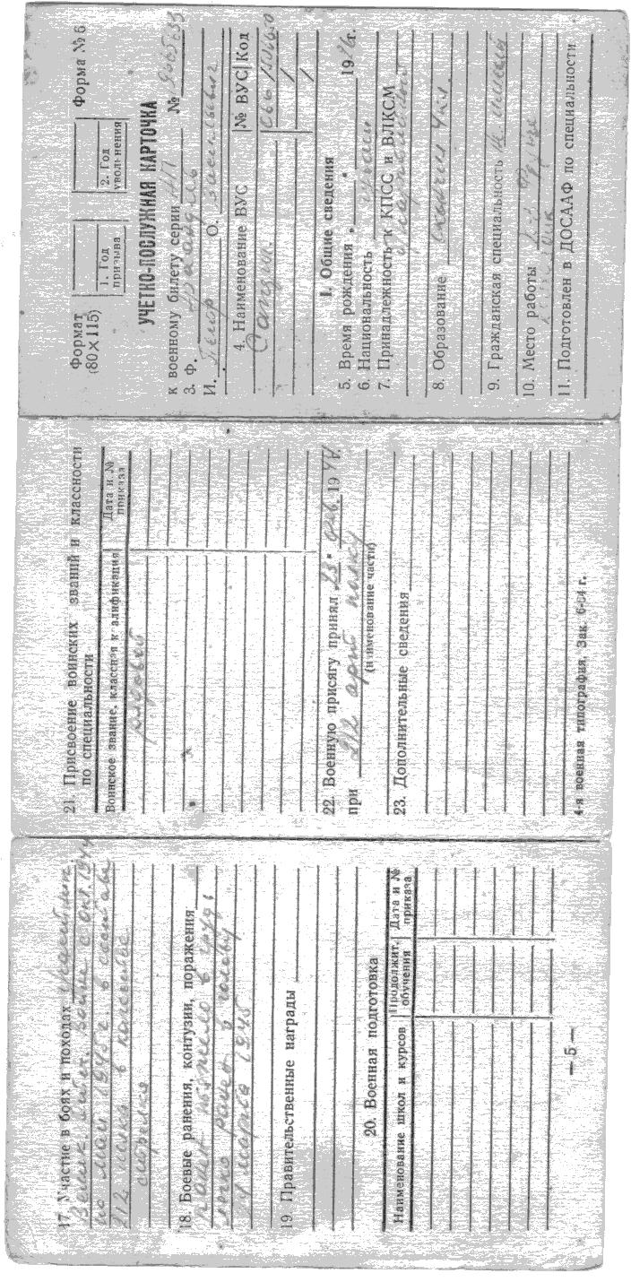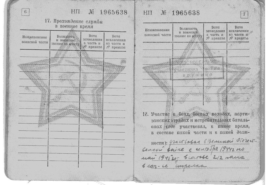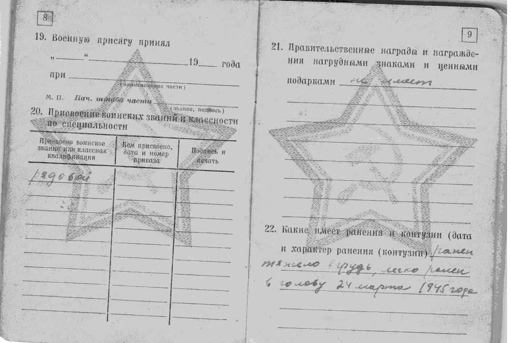 В наступательном бою за г. Кенигсберг в марте 1945 г. был тяжело ранен в грудь и голову. Раненого и без сознания, его посчитали погибшим и отправили домой похоронку. Он оказался жив, медсестра в морге нащупала пульс и отправила его в госпиталь. Победу встретил там же. Родные через три месяца после похоронки получили известие, что он жив и здоров. Демобилизован в марте 1950 г.