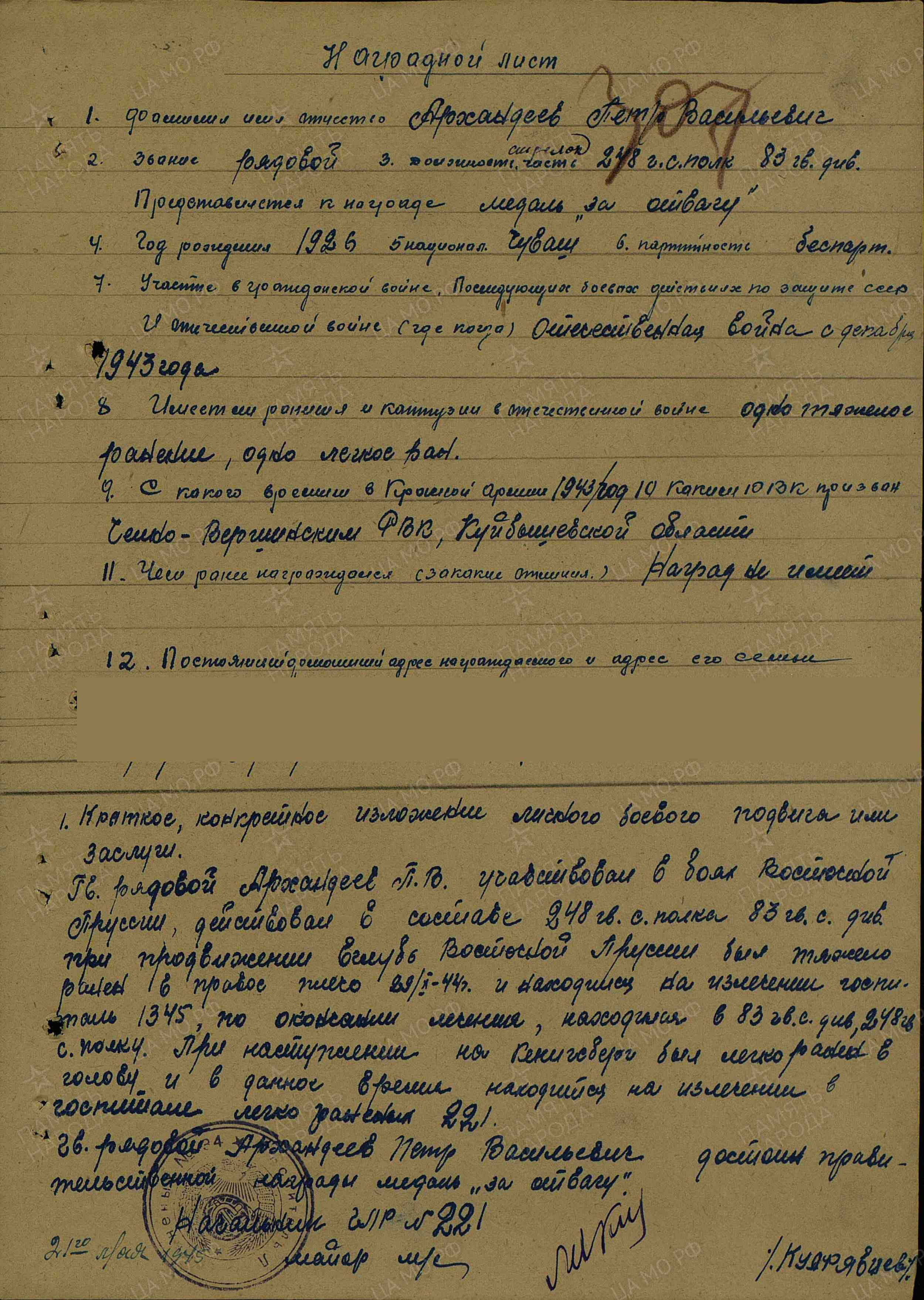 Гвардии рядовой Архандеев П.В. участвовал в боях в Восточной Пруссии, действовал в составе 248-го гвардейского стрелкового полка 83-й гвардейской стрелковой дивизии. При продвижении вглубь Восточной Пруссии 29 октября 1944 г. был тяжело ранен в правое плечо, находился на излечении в госпитале №1345. По окончанию лечения находился в 248-м гвардейском стрелковом полку 83-й гвардейской стрелковой дивизии. При наступлении на Кенигсберг был легко ранен в голову и в данное время находится на излечении в госпитале легкораненых №221. Гвардии рядовой Архандеев П.В. достоин правительственной награды - медали "За отвагу" (наградной лист от 21.05.1945 г.).