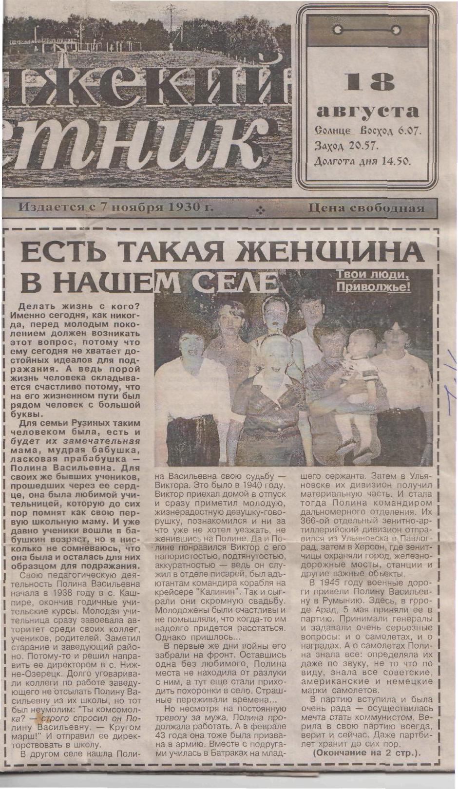 Свою трудовую педагогическую деятельность начала в с. Кашпир, после окончания годичных учительских курсов. Молодая учительница сразу завоевала авторитет среди коллег, учеников и родителей. Заметил старания зав. районо, решил направить её директором Н-Озерецкой школы. В 1940 г. встретила свою судьбу, Виктора Рузина. Сыграли свадьбу. В первые дни войны его забрали на фронт. Оставшись одна, без любимого, Полина места не находила от разлуки с ним. А тут еще похоронки стали приходить в село. Страшные переживали времена… А в феврале 1943 г. она сама была призвана в армию. Училась в Батраках (возле Сызрани) на младшего сержанта. В Ульяновске их дивизион получил материальную часть, и стала Полина командиром дальномерного отделения. Их 366-й отдельный зенитно-артиллерийский дивизион отправился из Ульяновска сначала в Павлоград, затем в Херсон. Зенитчицы охраняли город, железнодо-рожные мосты, станции и другие важные объекты. В 1945 г. военные дороги привели её в Румынию. Полина знала все марки советских, американских и немецких самолетов. Отличала их не только по виду, но и по звуку. Здесь и встретила день Победы. С 1954 г. переехала с мужем жить в Приволжье. И все годы была учителем начальных классов. Прожила более 90 лет. Умерла 29 марта 2013 г. Похоронена в Приволжье.