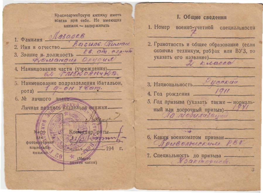 Родился 27 февраля 1911 г. в с. Софьино Приволжского района Куйбышевской области, в многодетной семье 11-м ребенком. Закончил 2 класса местной школы, работал трактористом. В 1939 г. шесть месяцев воевал с финнами. В декабре 1940 г. женился. В июне 1941 г. призван по мобилизации. В апреле 1942 г. прибыл с формировочного пункта г. Москвы и назначен командиром орудия. Всю войну воевал на «Катюше» в составе Западного, Воронежского, 3-го Украинского, 1-го и 2-го Белорусских фронтов. Демобилизован 25 сентября 1945 г. Вернулся домой, в Софьино. Работал трактори-стом, завхозом, объезчиком полей, потом ушел в животноводство. Работал свина-рём, а в последнее время зимой скотником у овец, а летом пастухом – пас овец. В 1960-70-е гг. прошлого столетия был заслуженным колхозником колхоза им. Кирова (с. Софьино) Приволжского района. Все эти годы на дому висела табличка «Здесь живет почетный колхозник, Лазарев Василий Пименович, колхоза имени Кирова». Был коммунистом, и всю сознательную жизнь являлся членом райкома партии – в то время это было очень почетно. За добросовестный и честный труд награждался грамотами, ценными подарками и путевками в санатории и курорты. Неоднократно бывал за границей по путевкам от райкома партии. Умер 8 августа 2003 г. Похоронен на кладбище с. Софьино.