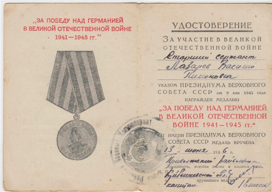 Информация сайта podvignaroda.ru: В боях с немецкими оккупантами тов. Лазарев проявляет исключительную отвагу и мужество. В бою 17 сентября 1943 г., когда противник яростно контратаковал наши части, дивизион стоял на огневой позиции и ждал команды открытия огня. На огневую позицию дивизиона произвела налет вражеская авиация. Бомбы рвались вокруг. Раздалась команда «Огонь». Тов. Лазарев, пренебрегая смертью, своевременно открыл огонь. После залпа противник два огневых налета на огневые позиции дивизиона. Был дан приказ произвести второй залп. Осколками разорвавшейся мины был ранен наводчик и два орудийных номера. Под сильным артиллерийским огнем противника тов. Лазарев, невзирая на трудность боя, своевременно зарядил установку и навел ее на цель. Был дан 2-й залп, в результате которого контратака противника была отбита – подбито 2 танка, подавлен огонь минометной батареи, рассеяно и частью уничтожено до роты противника. В бою под Украинкой тов. Лазарев под сильным артиллерийским и минометным огнем противника вывел свою боевую машину на открытую огневую позицию и произвел залп прямой наводкой по контратакующей пехоте и танкам противника, в результате чего контратака противника была отбита с большими для него потерями. За мужество и героизм, за умелое руководство своим расчетом в бою тов. Лазарев достоин правительственной награды – ордена Отечественной войны I степени (наградной лист от 25.09.1943 г.).
