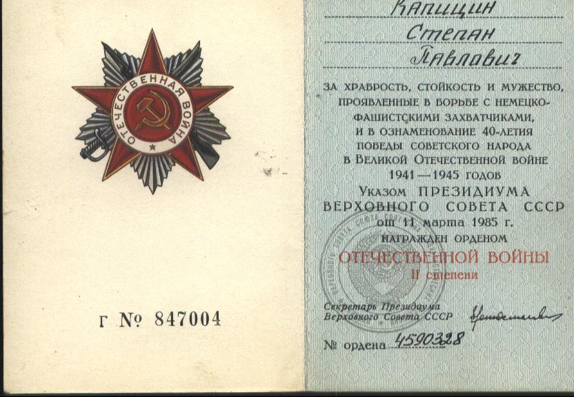 Родился в 1916 г. в с. Дураковка Духовницкого района Саратовской области. Рядовой партизанского отряда №755, 12-й бригады им. Сталина Минской области, с 28 августа 1942 по июль 1944 гг. За время пребывания в отряде принимал активное участие в тринадцати различных боевых операциях. При его содействии разгромлено два немецко-полицейских гарнизона. Он участник подрыва железнодорожного моста в местечке Талька и пяти боев с карательными экспедициями немцев, а также уничтожении телефонно-телеграфной связи. Путем засад разбито и сожжено семь автомашин противника. Всего при содействии Капицина уничтожено 118 гитлеровцев. В бою показал себя в храбрости и стойкости. За заслуги перед Родиной награжден орденом Отечественной войны II степени, медалью «Партизану Отечественной войны» II степени, медалью «За победу над Германией в Великой Отечественной войне 1941-1945 гг.», а также юбилейными медалями. Демобилизовался в июле 1944 г. После войны работал разнорабочим. Умер в 1995 г. Похоронен на кладбище с. Екатериновка.