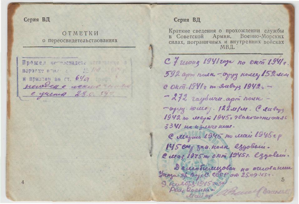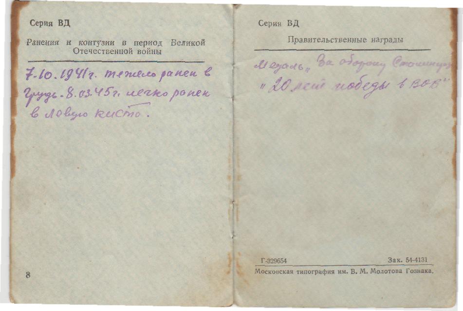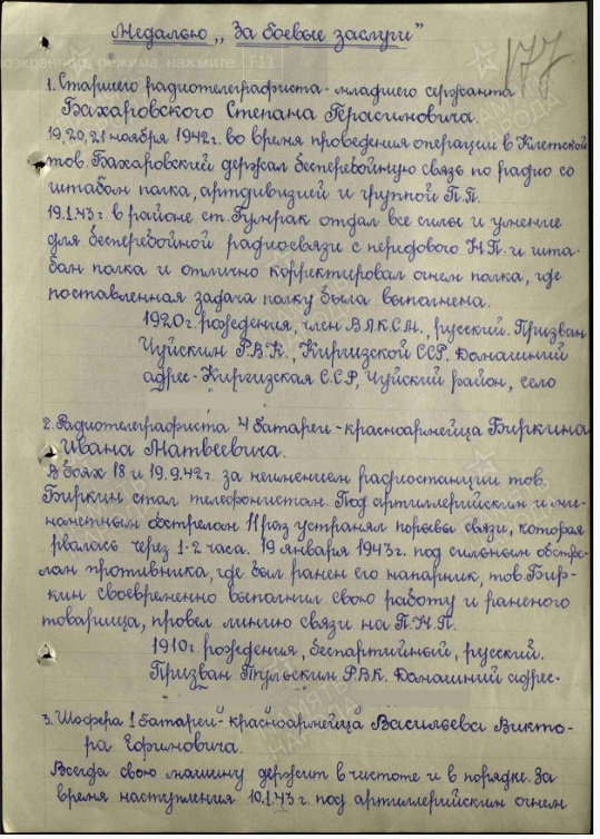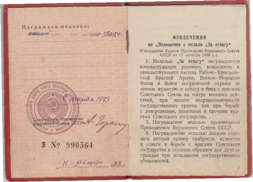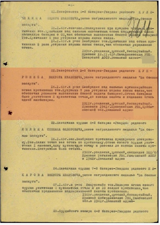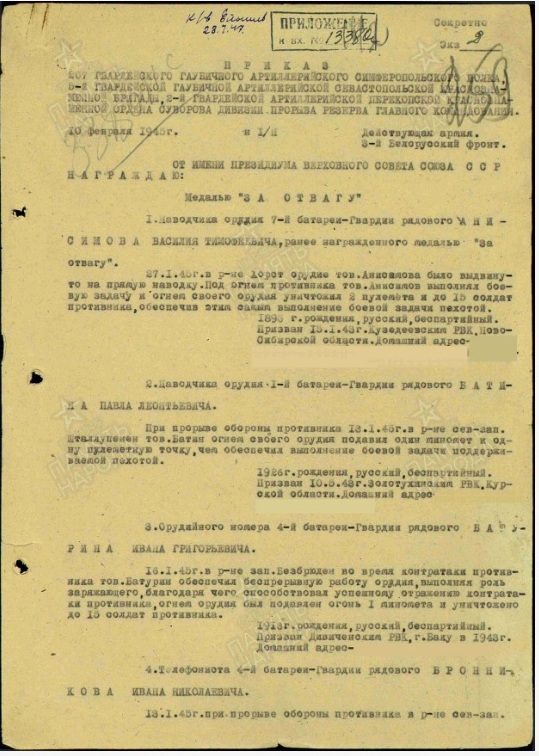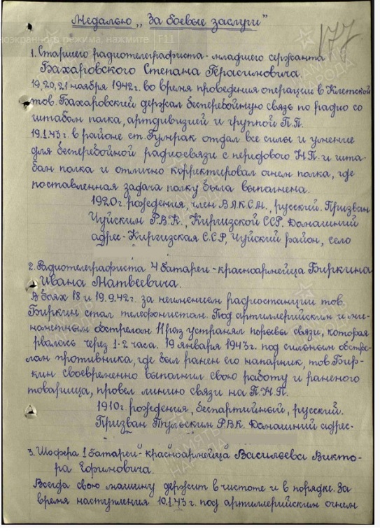 Информация сайта podvignaroda.ru: 10 января 1943 г. во время артнаступления давал большой темп огня. В результате уничтожено 2 пулеметные точки, 1 орудие и рассеяно до взвода пехоты противника. Наградить медалью «За боевые заслуги».