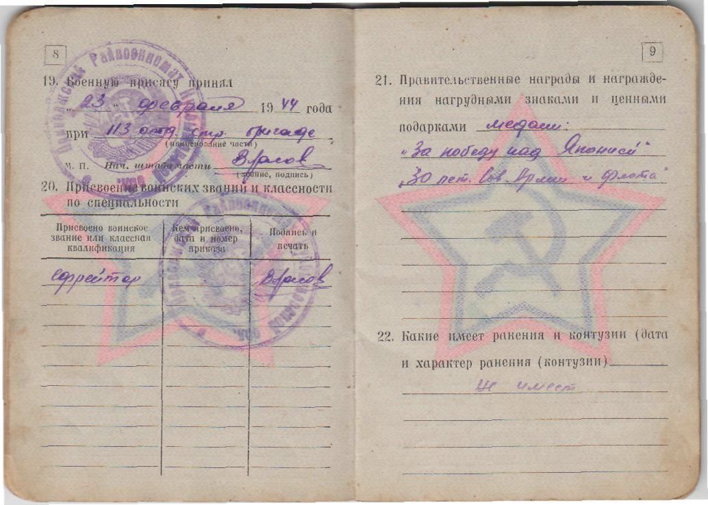 Родился 19 ноября 1926 г. в с. Федоровка Приволжского района Куйбышевской области. Закончил 4 класса местной школы. Получил специальность электросварщика. 18 ноября 1943 г. призван в ряды Красной армии. Действительную военную службу проходил в 113-й отдельной стрелковой бригаде наводчиком 45 мм пушки. С 10 августа по 3 сентября 1945 г. участвовал в войне с Японией. После войны жил и работал в родном селе Федоровка. Имеет звание «Ветеран труда». Награды: медаль «За победу над Японией», медаль Жукова, знаком «Фронтовик – 1941-1945 гг.», благодарность Сталина «За отличные боевые действия в боях с Японцами на Дальнем Востоке», орденом Отечественной войны II степени, 8 юби-лейных медалей.