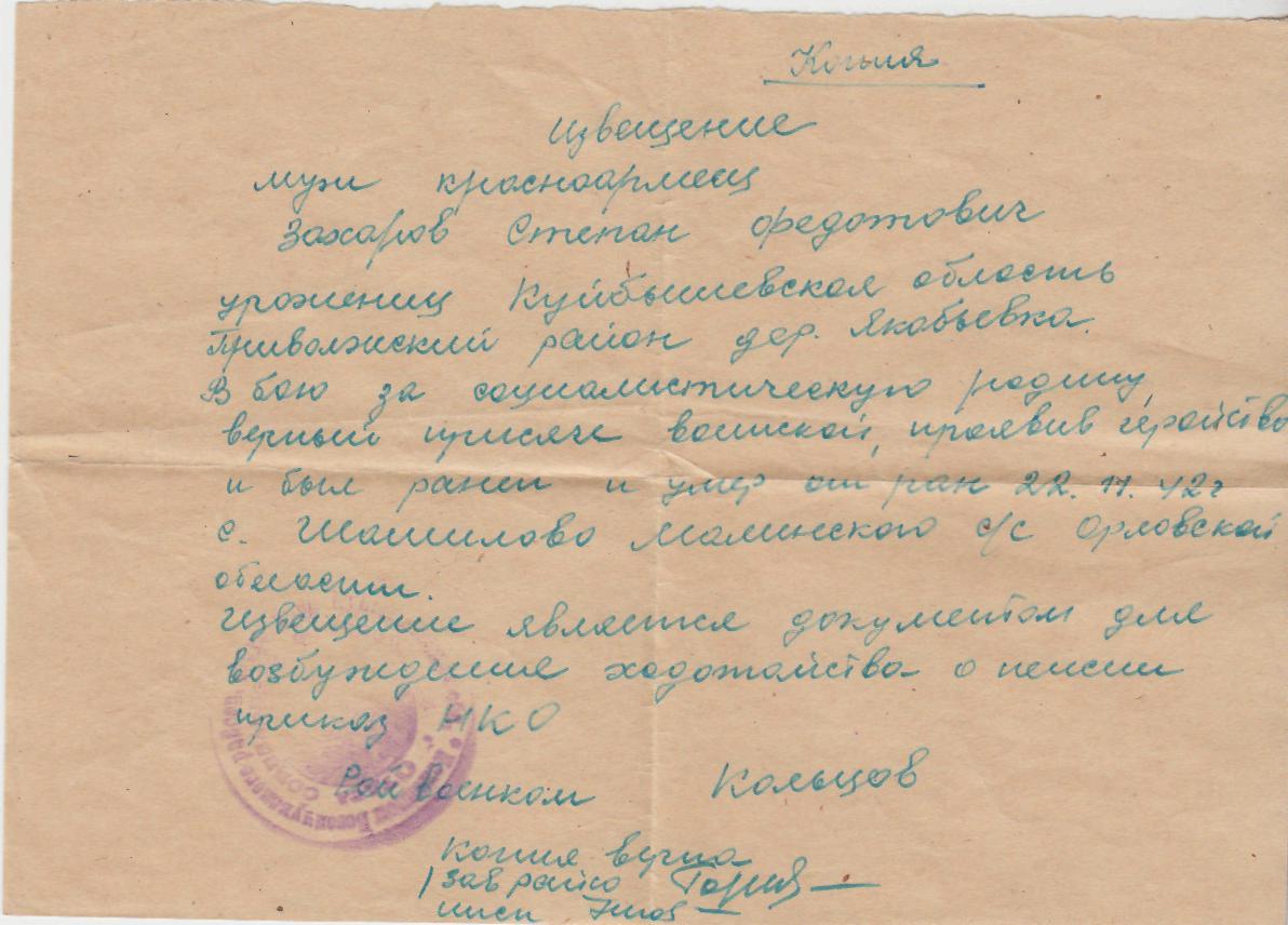 Родился в 1910 г. в д. Якобьевка Приволжского Куйбышевской области. Как многие мужчины из деревни того времени, работал в Октябрьске, станция Батраки, на асфальтовом заводе. Когда началось война, был призван на фронт, оставив дома двух дочерей и долгожданного сыночка, родившегося в 1941 г. С фронта писал домой письма, в которых писал своей супруге о том, чтобы она берегла его сына, которого он очень любил. Однажды, когда он с группой сослуживцев в очередной раз пошел в разведку, он подорвался на мине, получив ранение, не совместимое с жизнью, от которого вскоре умер 2 ноября 1942 г. Похоронен в с. Шатилово Малинского сельсовета Орловской области.