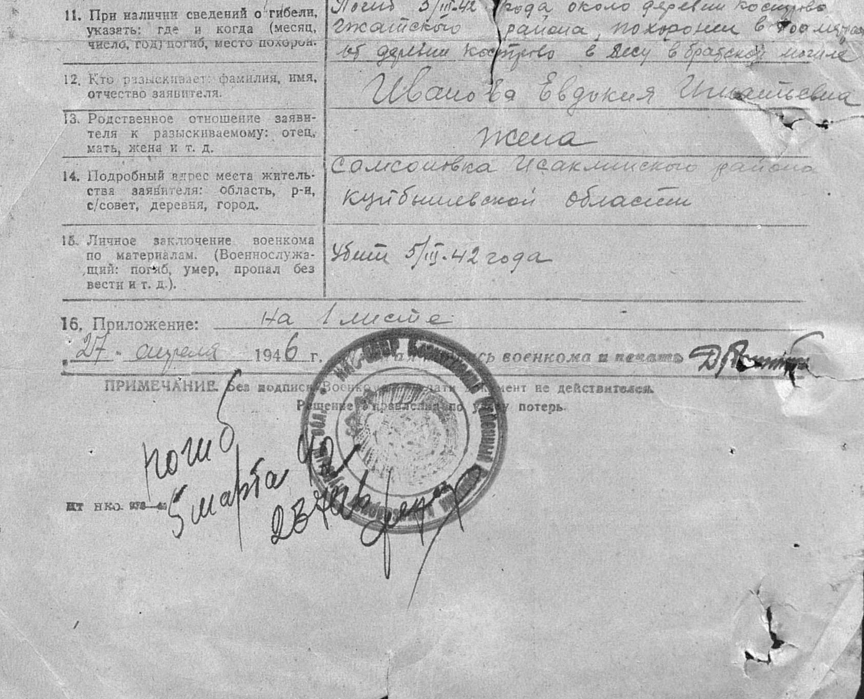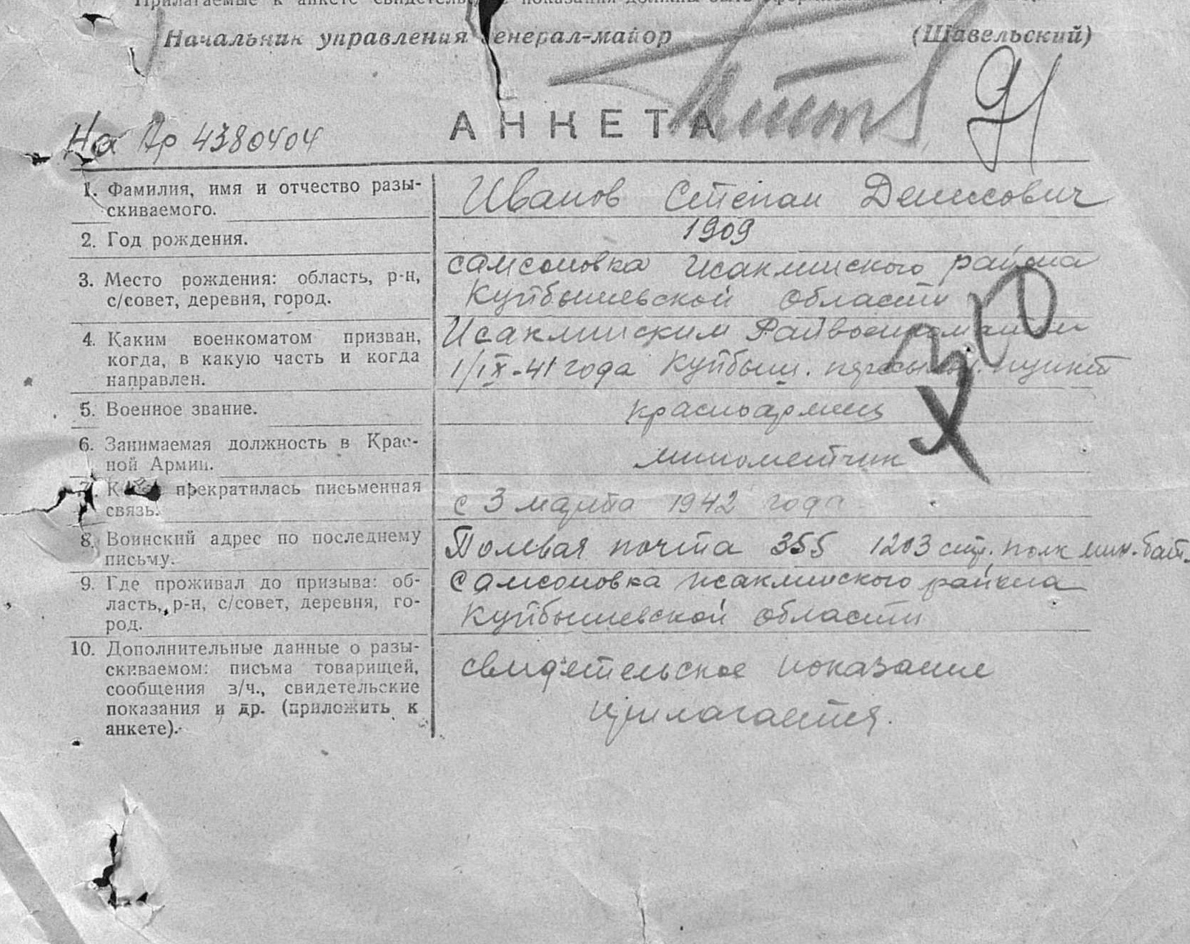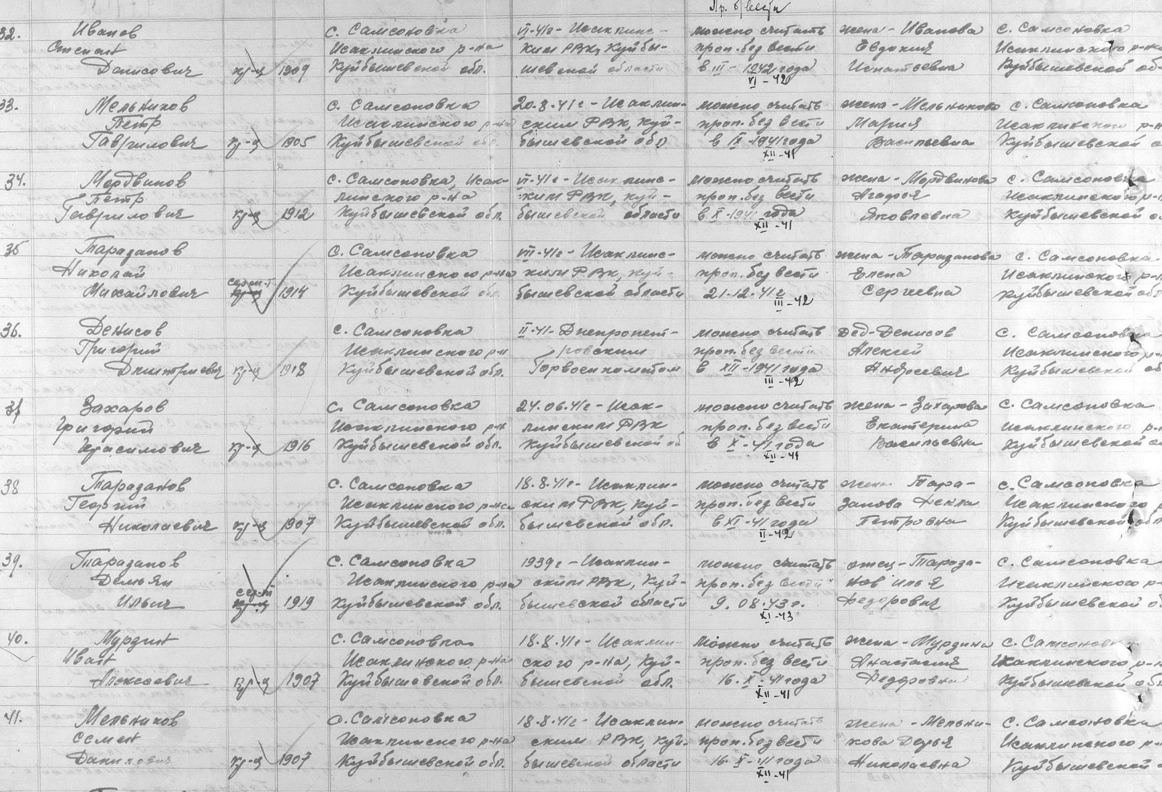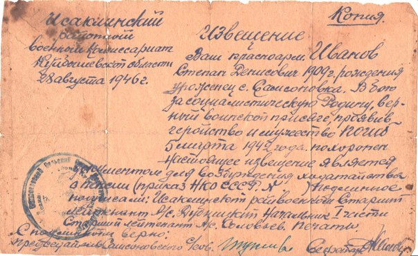 Иванов Степан Денисович, 1909 года рождения, уроженец села Самсоновка Исаклинского района. Призван 01.09.1941 г. Участвовал в битве под Москвой.
