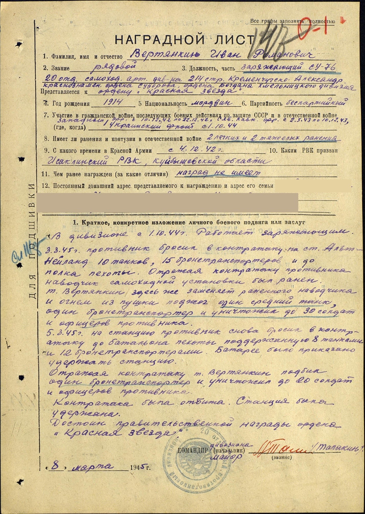 Звание: рядовой, в РККА с 04.12.1942 года. Место призыва: Исаклинский РВК, Куйбышевская обл., Исаклинский р-н. Место службы: 214 сд 52 А 1 УкрФ. В дивизионе с 01.10.1944 работал заряжающим. 03.03.1945 г. противник бросил в контратаку на ст. Альт-Нейланд 10 танков, 15 бронетранспортеров и до полка пехоты. Отражая атаку противника наводчик самоходной установки был ранен. Вертянкин быстро заменил раненого наводчика и огнем из пушки поджег один средний танк, один бронетранспортер и уничтожил 30 солдат и офицеров противника. 05.03.1945 г. на станцию противник снова бросил контратаку до батальона пехоты, поддержанную 8 танками и 12 бронетранспартерами. Батарее было приказано удержать станцию. Отражая контратаку танкист Вертянкин подбил один бронетранспортер и уничтожил до 20 солдат и офицеров противника. Контратака была отбита. Станция была удержана.