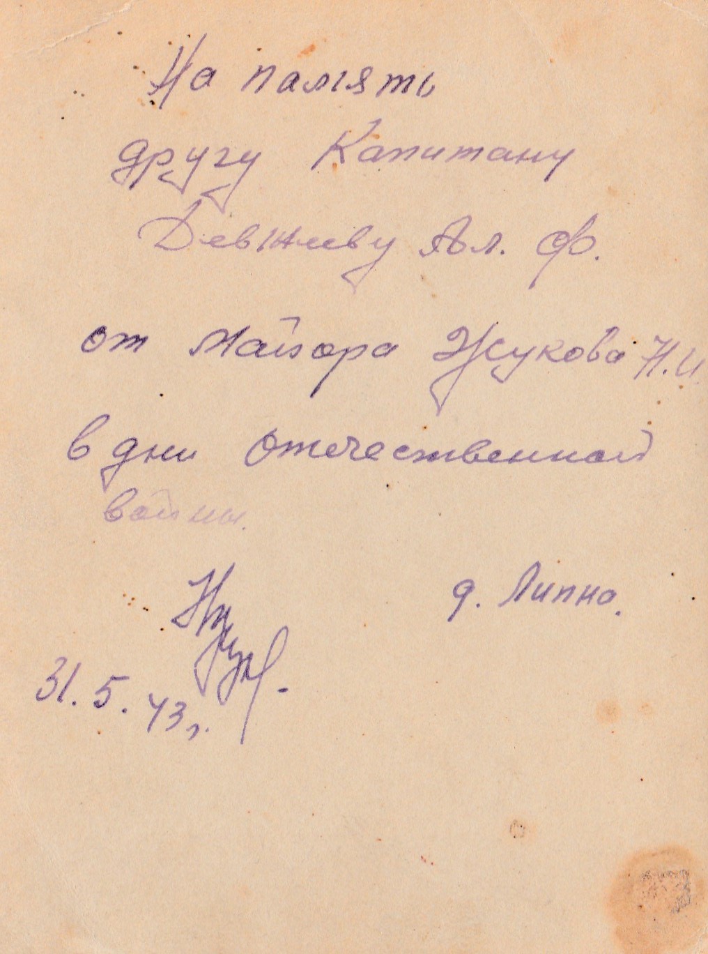 Майор Жуков Н.И. был фронтовым другом капитана Девжеева Алексея Федоровича. Сохранилась фотография майора Жукова Н.И., сделанная 31.05.1943 г. в военно-полевых условиях в деревне Липно и подаренная капитану Девжееву А.Ф.