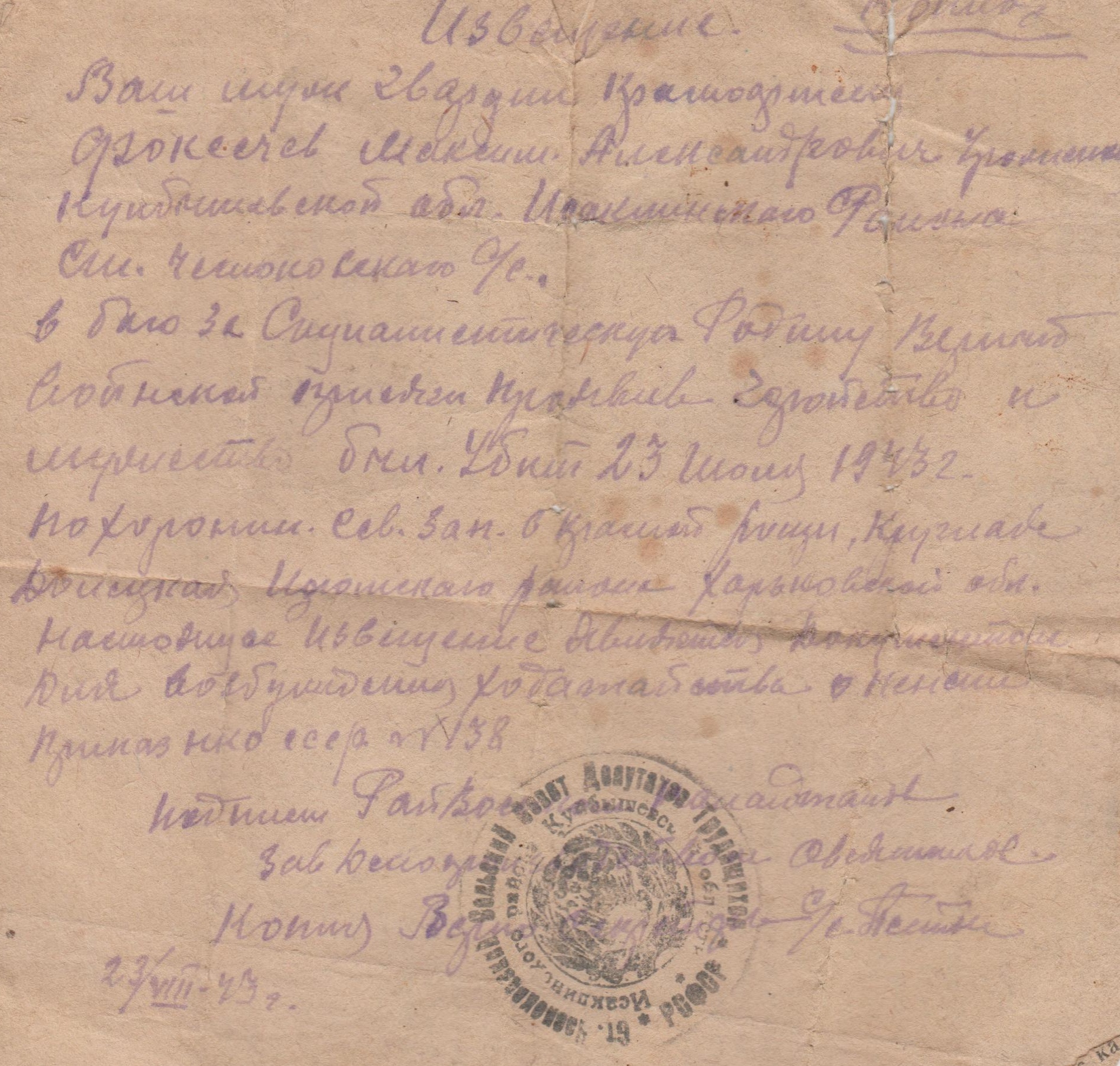 Максим Александрович Фокейчев был убит 29.07.1943 г. (в Извещении о смерти указано 23 июля 1943 г.). В Донесении о потерях указано его первичное место захоронения: Украинская ССР, Харьковская обл., Изюмский р-н, х. Донецкий, рядом, северо-западная окраина рощи Круглая.