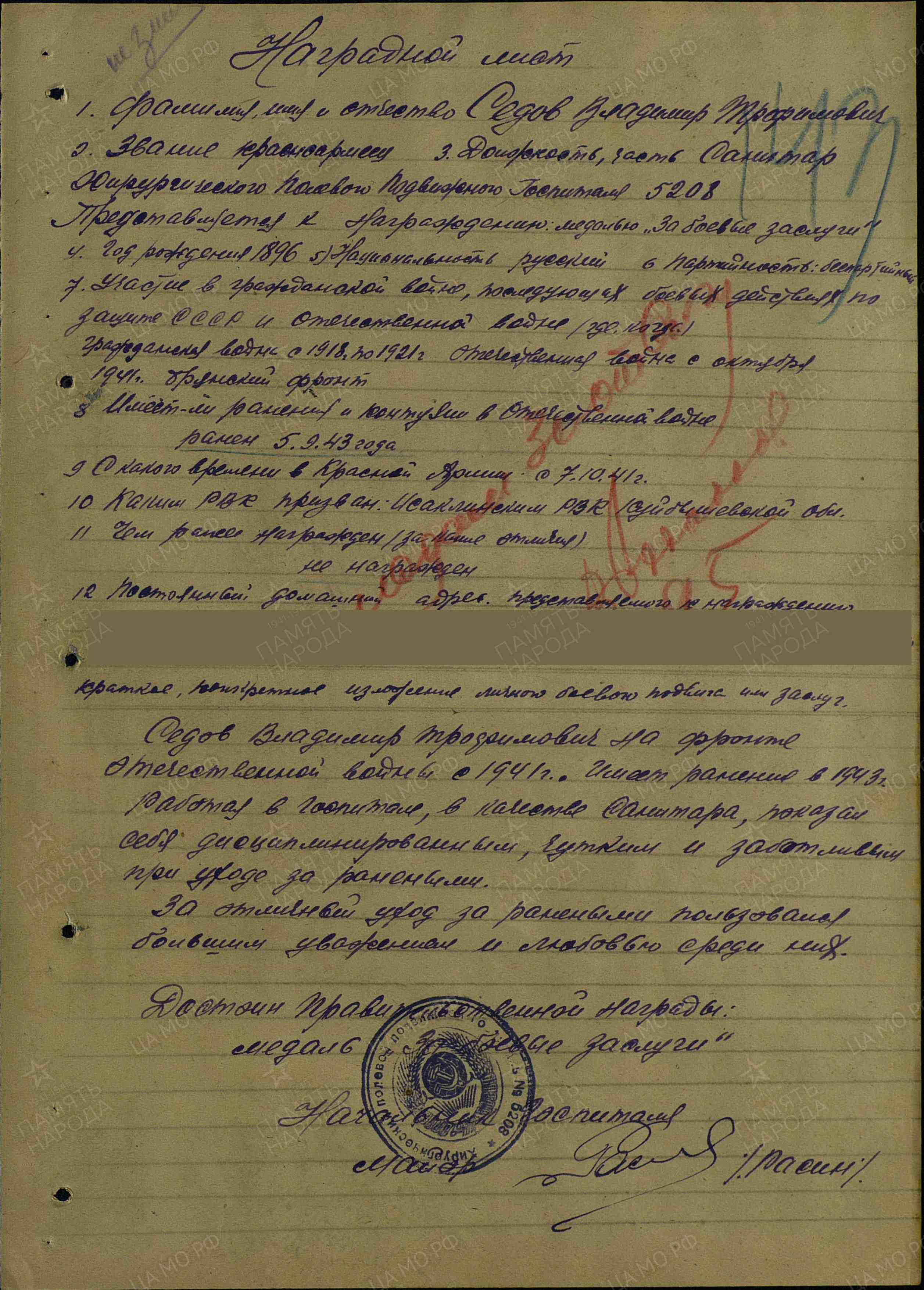 Седов Владимир Трофимович на фронте Отечественной войны с 1941 г. Имеет ранение в 1943 г. Работая в госпитале в качестве санитара, показал себя дисциплинированным, чутким и заботливым при уходе за ранеными. За отличный уход за ранеными пользовался большим уважением и любовью среди них. Достоин правительственной награды – медали «За боевые заслуги» (награжден медалью «За отвагу»; наградной лист от 14.05.1945 г.).