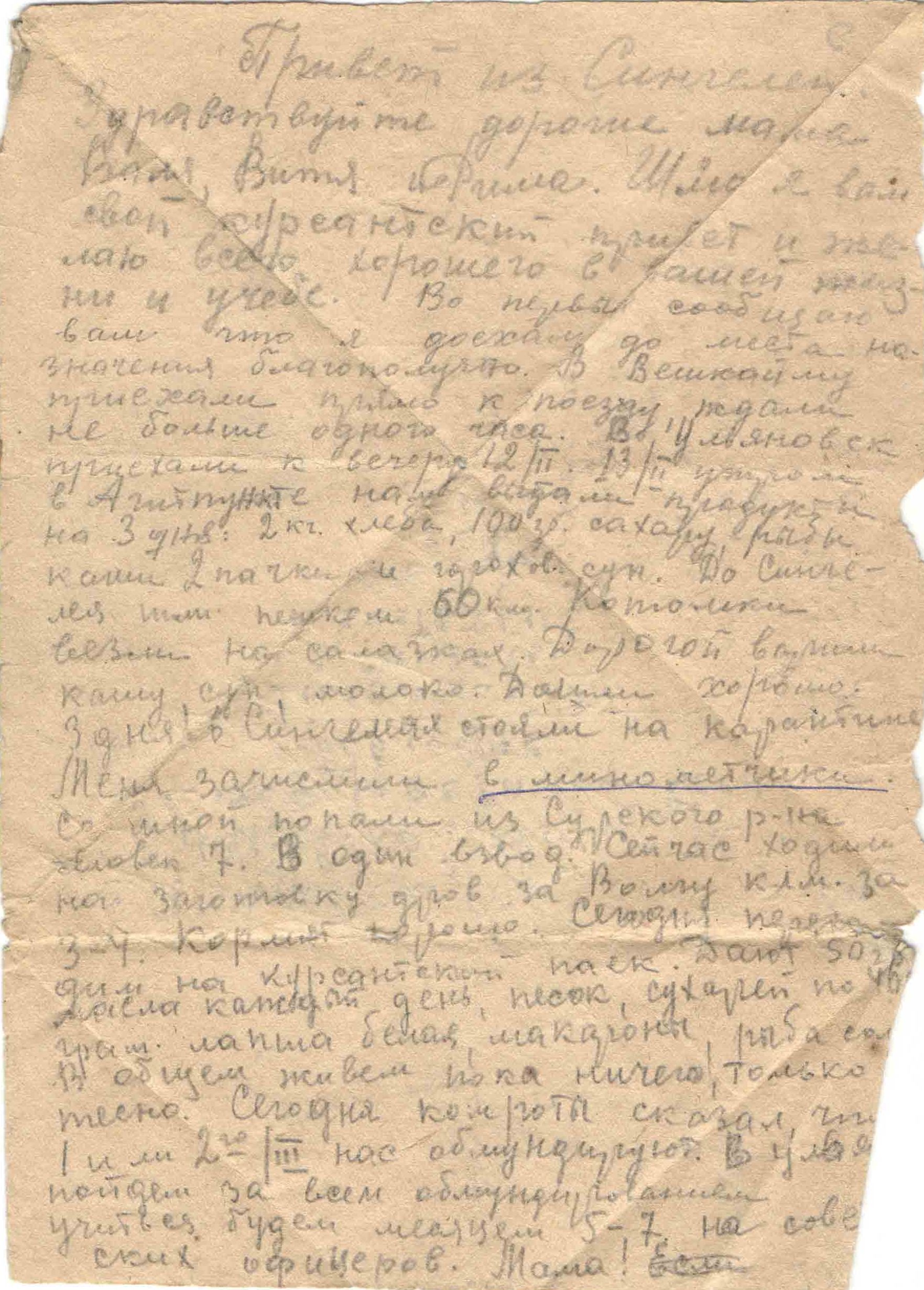 16.06.1943 г. Письмо из Ряжска. Дали первый раз горячую пищу.