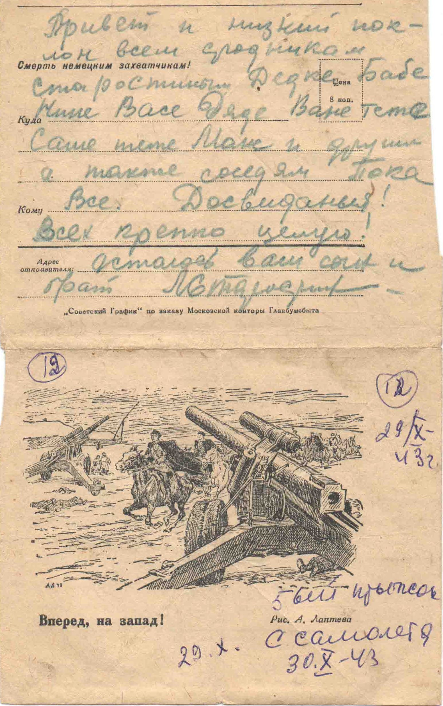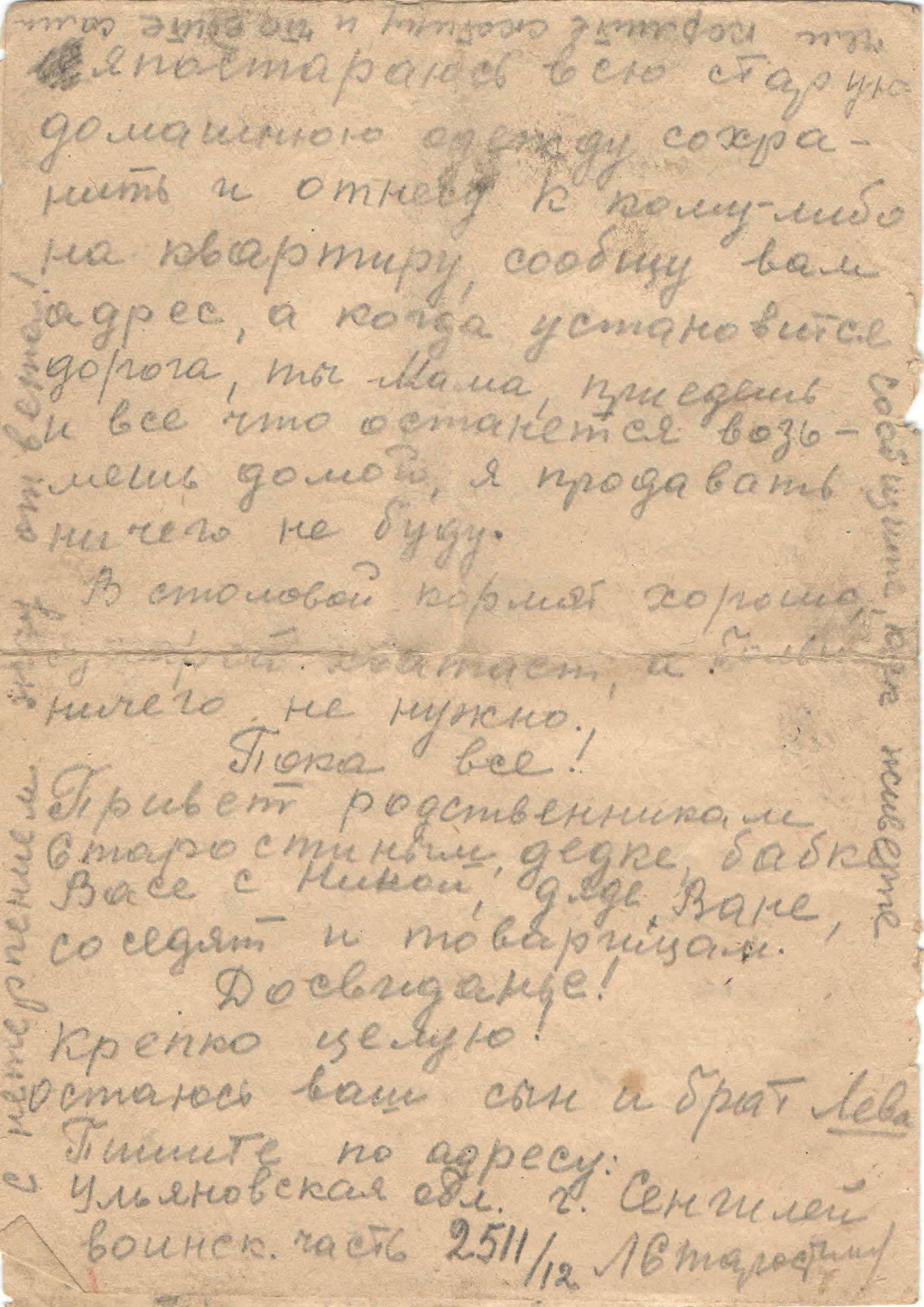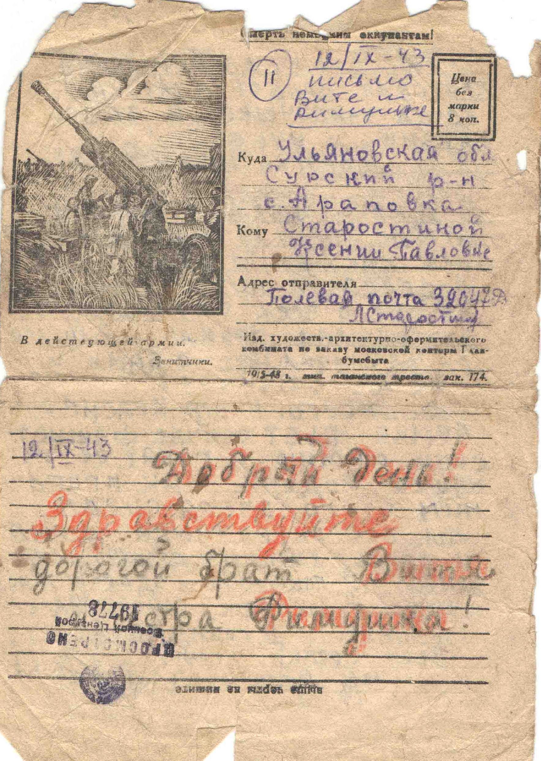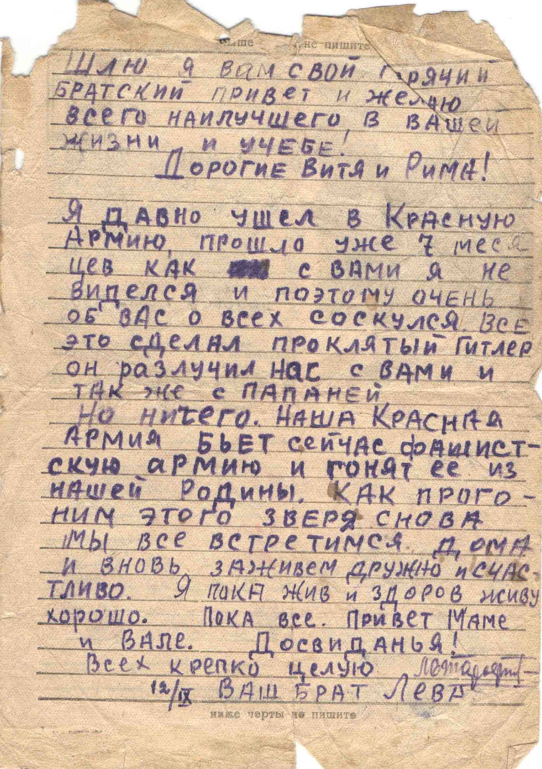 12.09.1943 г. Письмо брату Вите и сестре Римушке. Скучает, надеется на сорок возвращение с победой.