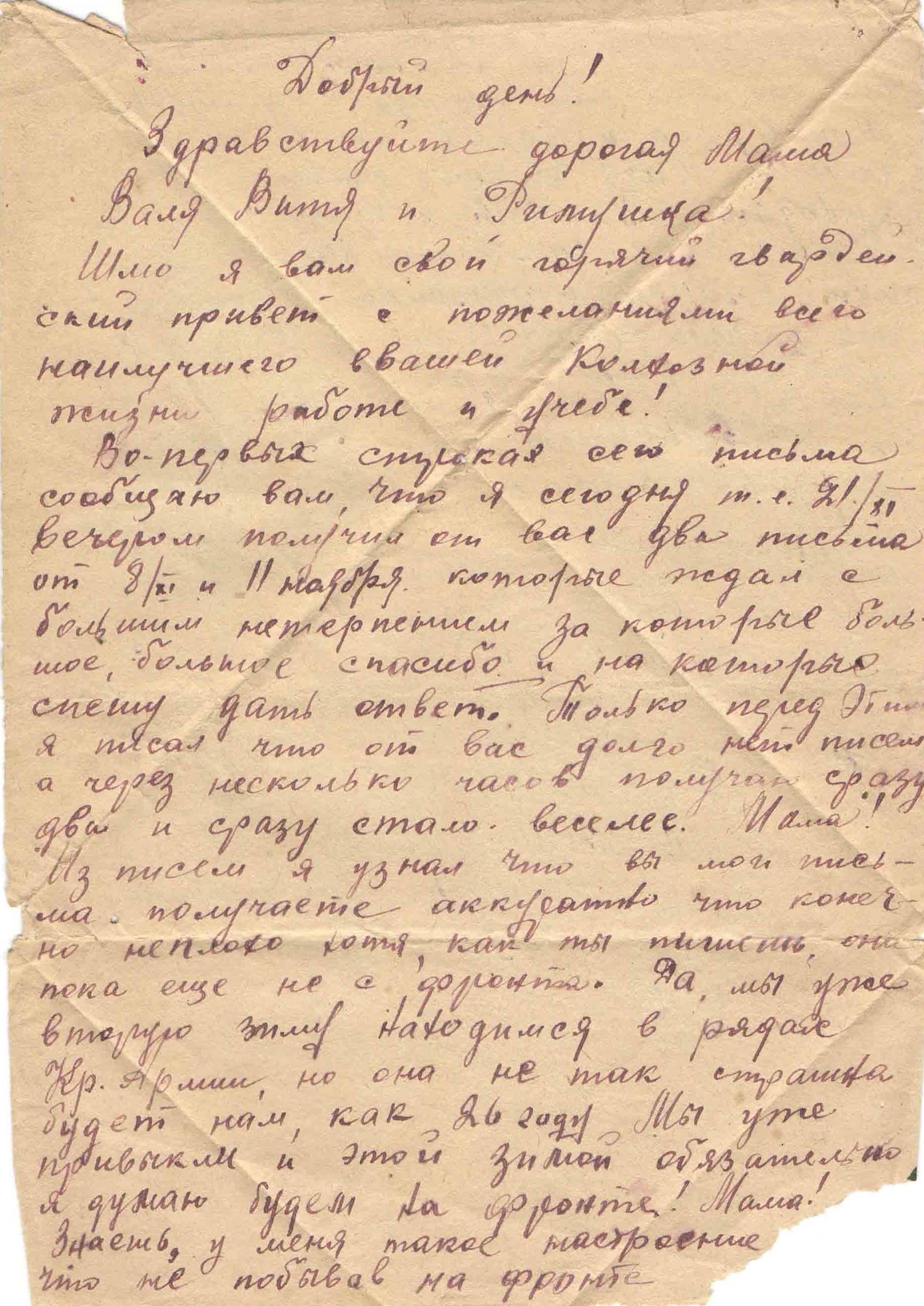 21.11.1943 г. Привык к военной службе. Скоро на фронт. «Я должен обязательно побыть на фронте, а то как-то стыдно показаться на глаза своим односельчанам». Вот такое ощущение долга.