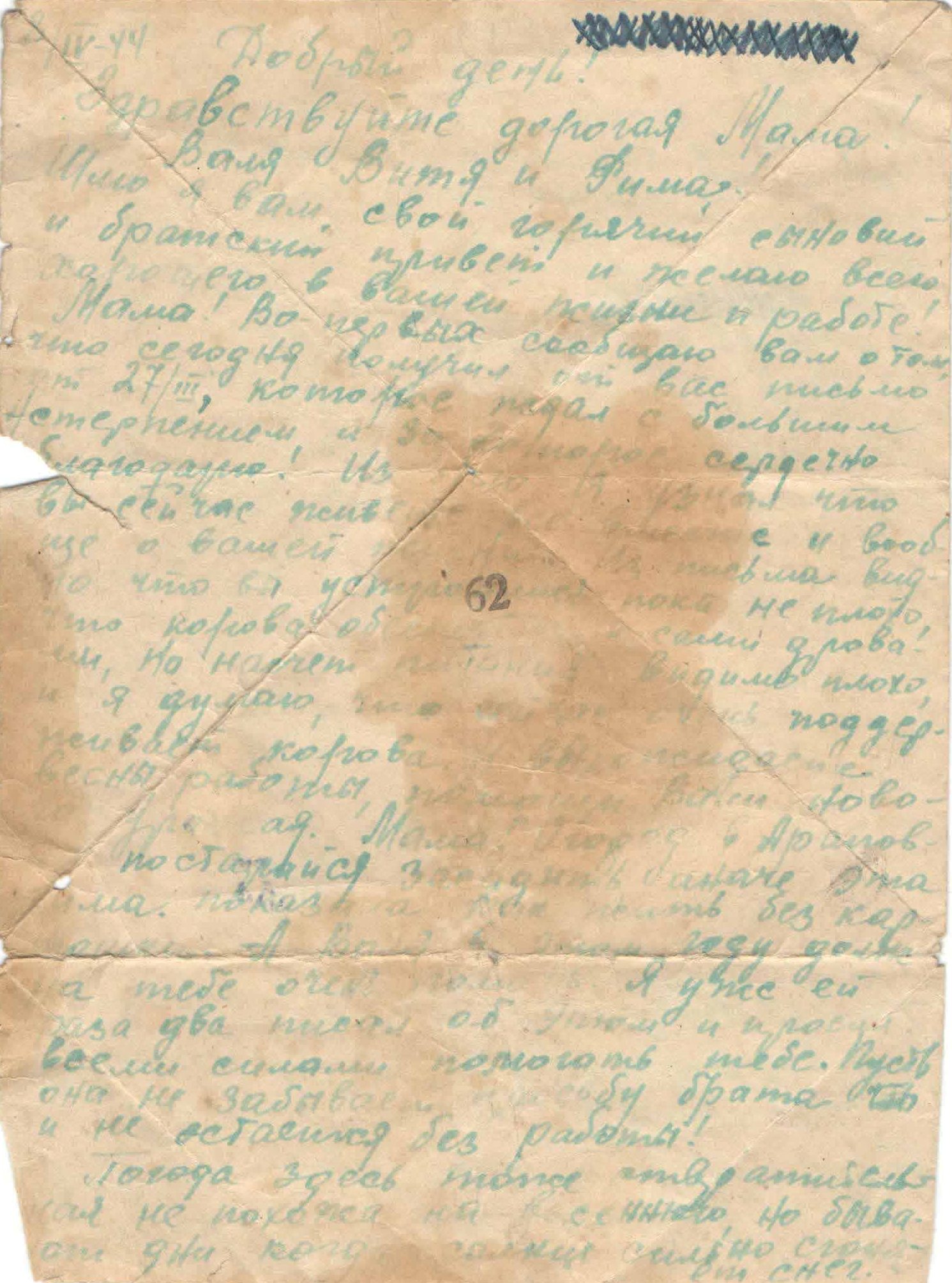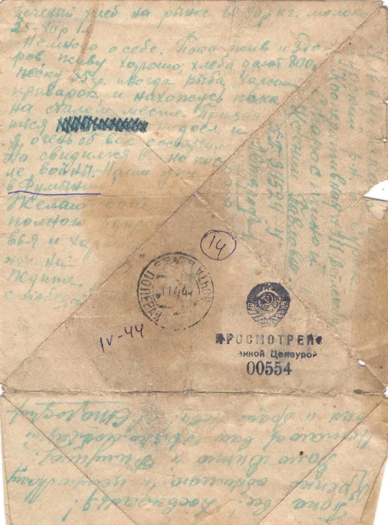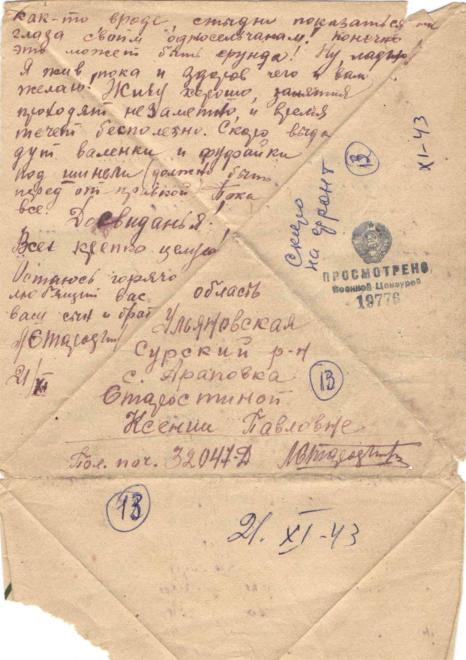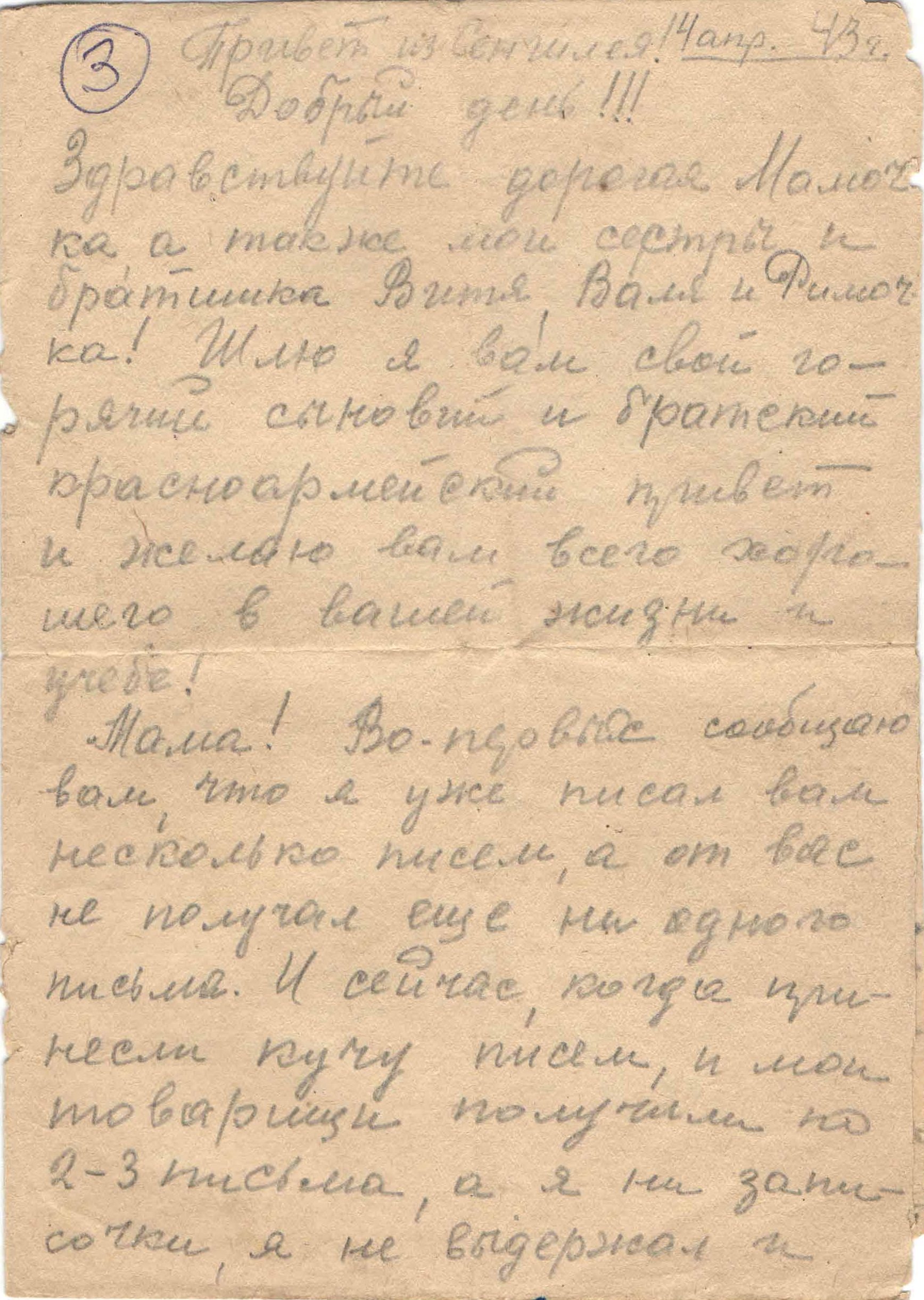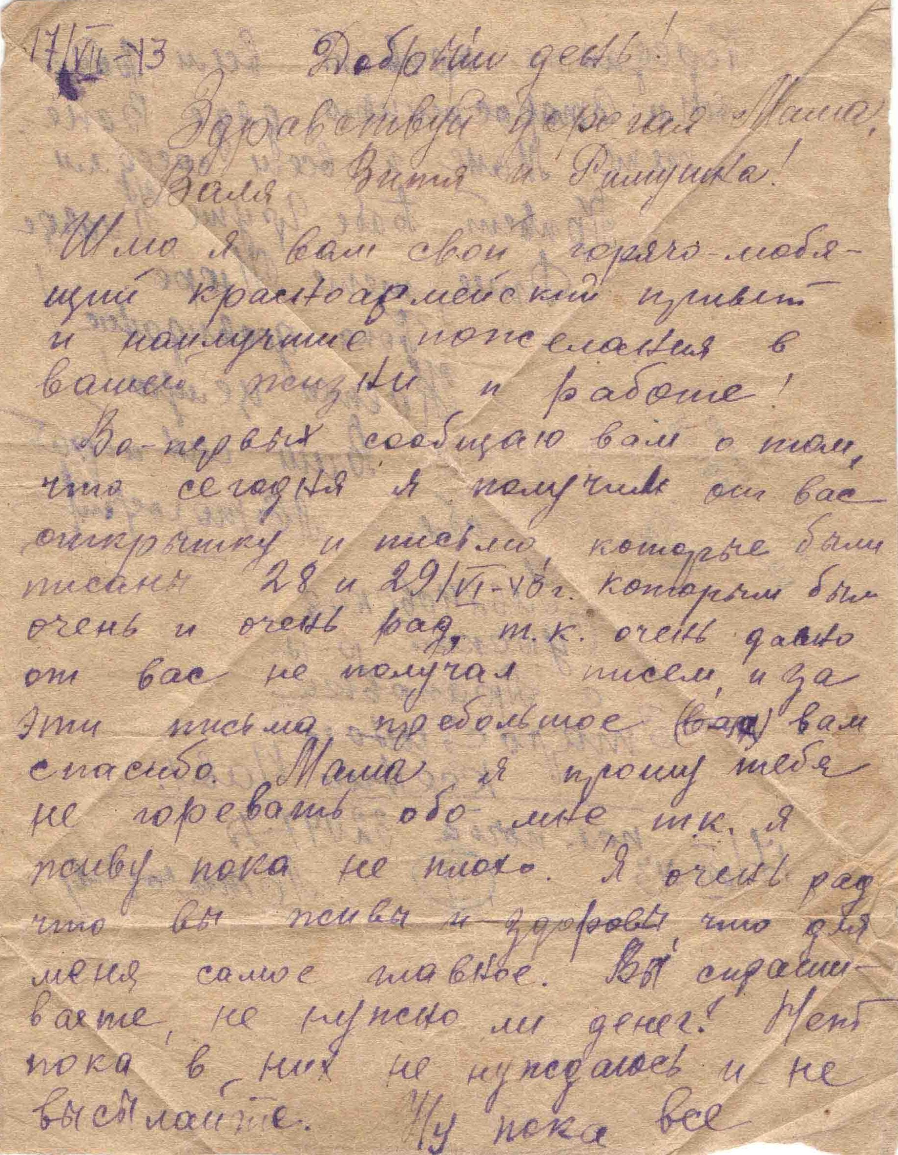17.07.1943 г. Получил письмо из дома. Благодарен, скучает.