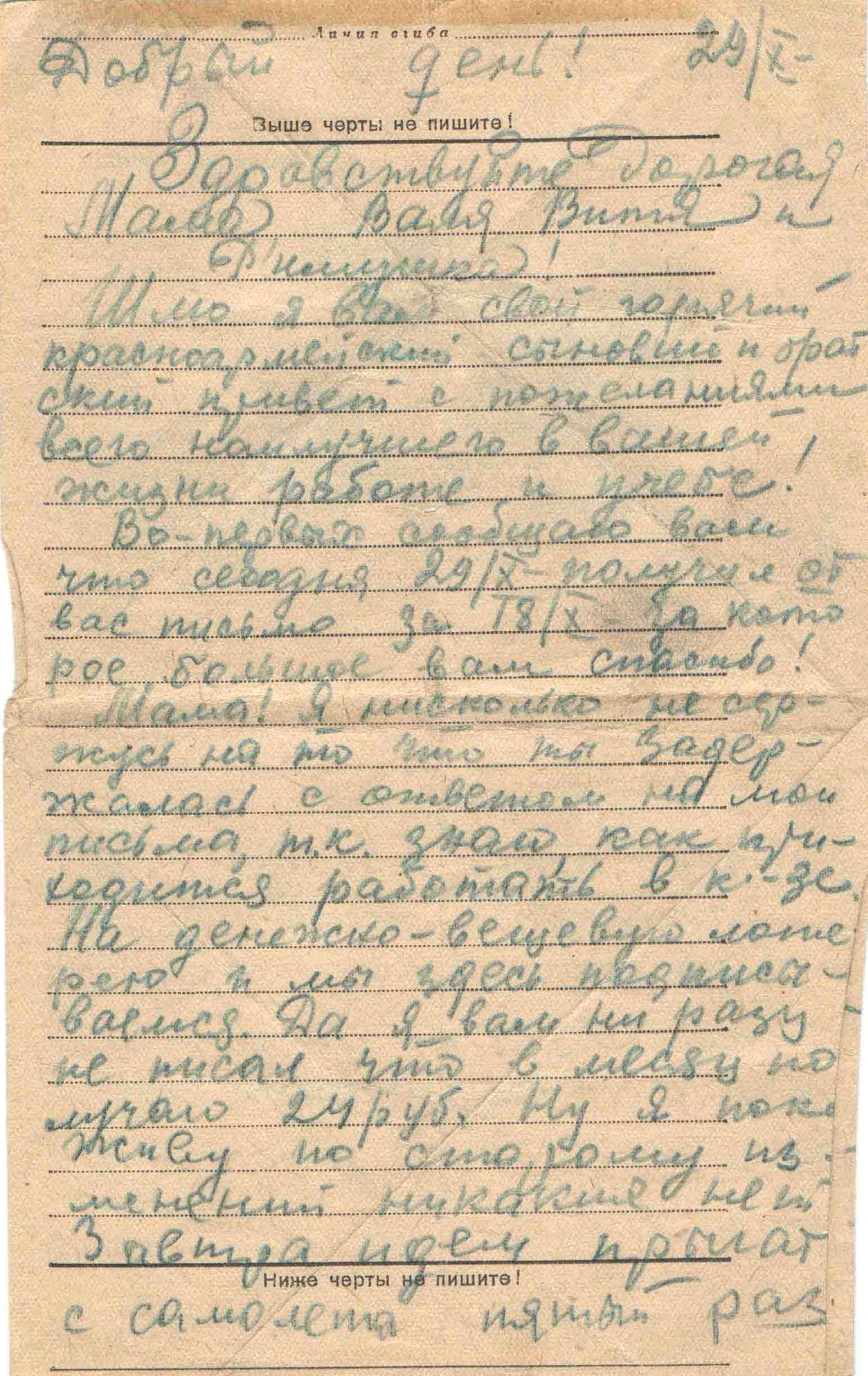 29.10.1943 г. О службе. Получает 24 р. В месяц. Завтра идет прыгать с самолета (прыгал 5 раз), парашютист.
