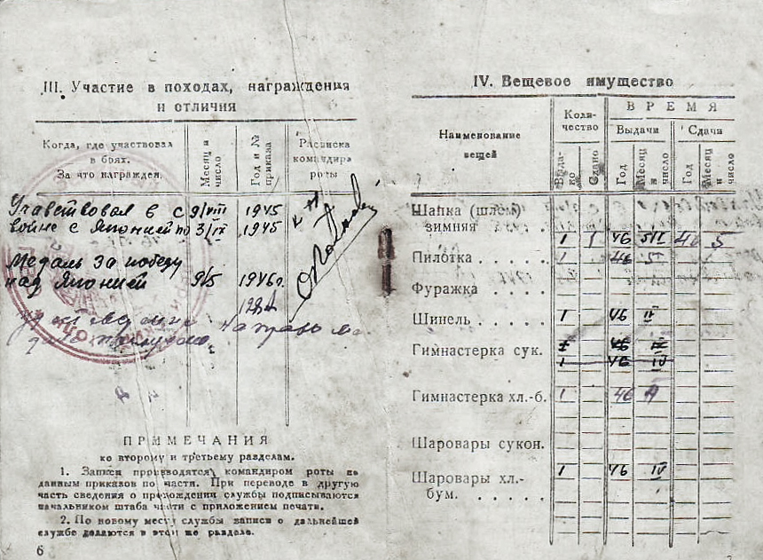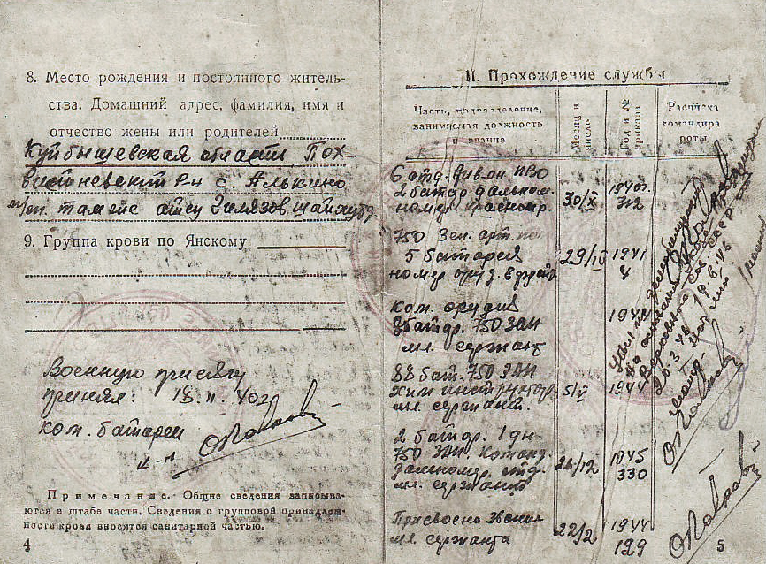 Родился в селе Алькино в 1920 году. Военную присягу принял 18 ноября 1940 года. Прохождение службы: 5-я батарея 750-го Зенитного артиллерийского полка – ефрейтор, 88-я батарея 750-го ЗАП – химический инструктор, младший сержант, 2-я батарея 750-го ЗАП – командир дальномерного отделения, младший сержант. Участвовал в войне с Японией с 9 августа 1945 года по 3 сентября 1945 года, за что получил медаль «За победу над Японией». Демобилизован 19 июня 1946 года.