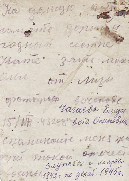 Чагаева Елизавета Иосифовна родилась в 1923 году в Сибири. В 1942 году ушла на фронт. Рядовая. Вернулась в село Большой Толкай в декабре 1945 года. После войны работала в колхозе. Вырастила и воспитала 3-х детей. Умерла 19 октября 2006 года. Награждена медалью «За отвагу».