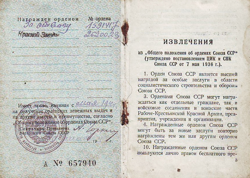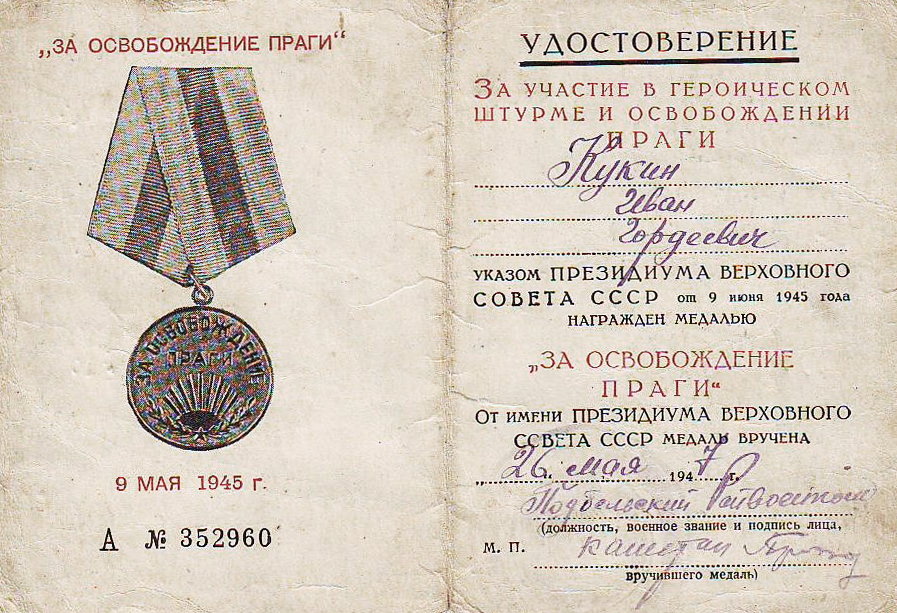 Наградить медалью "За отвагу" шофера боевой машины 4-й батареи рядового Кукина Ивана Гордеевича за то, что он в боях за с. Калясантувка Тарнопольской области Украинской ССР 14 апреля 1944 г. бесперебойно скрытными путями доставлял боеприпасы батарее, рискуя своей жизнью. Его машина всегда исправна, готова выполнить любую боевую задачу (наградной лист от 29.04.1944 г.).