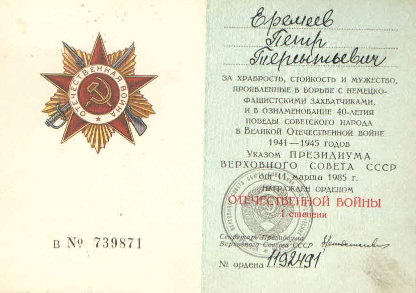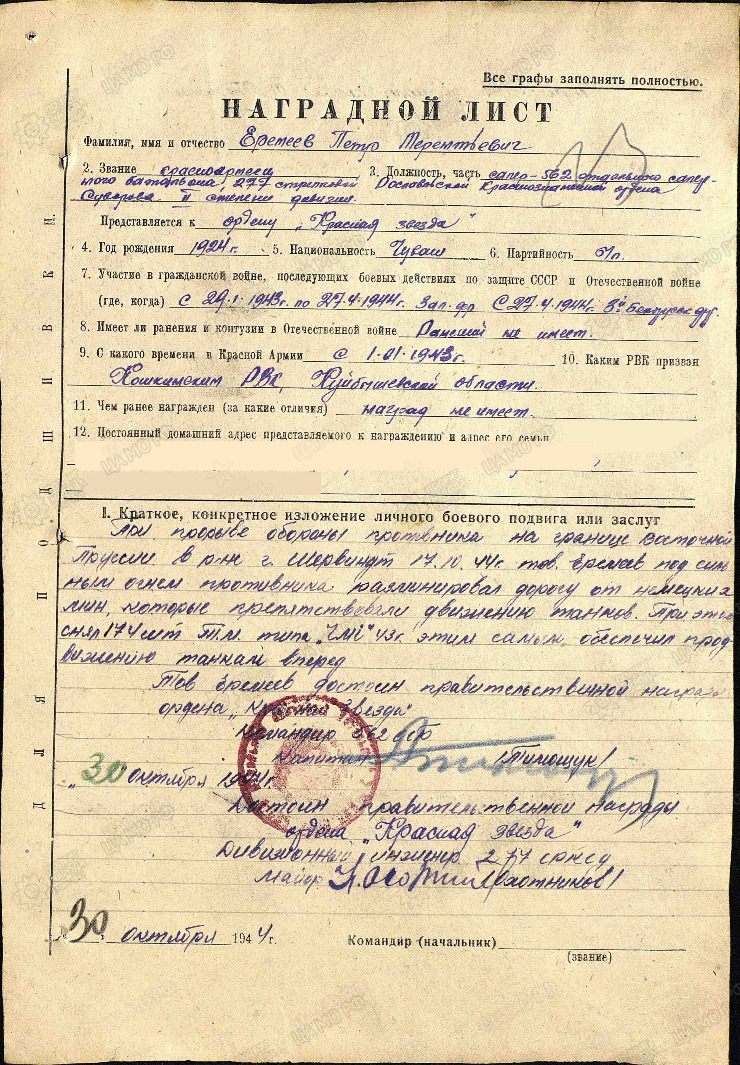 Родился 25 октября 1924 г. в д. Ерандаево Кошкинского района Куйбышевской области. Нелёгкая, но интересная жизнь за плечами этого человека. Мальчишкой познал тяжёлый труд. Возил для колхоза дрова, хлебные снопы. В январе 1943 г. его отправили в г. Кузнецк Пензенской области учиться на разведчика-сапёра. Воевал в составе войск 3-го Белорусского фронта в 277-й стрелковой дивизии. Немало огненных вёрст прошагал он. С оружием в руках участвовал в освобождении Польши, Латвии, Литвы, Восточной Пруссии. Несколько раз брал «языка». В одном из боёв в 1945 г., был тяжело ранен, госпитализирован и 8 месяцев находился на излечении. Раны были настолько тяжёлые, что пришлось ампутировать ногу. День Победы встретил в госпитале. Осенью 1945 г. вернулся домой. Вместе с женой Марией Игнатьевной они воспитали пятерых дочерей, всем дали образование. У него восемь внуков и три правнука. Всю свою жизнь Пётр Терентьевич трудился в колхозе. Уйдя на заслуженный отдых, оказывал колхозу посильную помощь. Он был инвалидом 1-й группы, но, несмотря на жизненные трудности, всегда оставался добрым, отзывчивым человеком. Похоронен в с. Ерандаево. Награды: орден Славы III степени, орден Отечественной войны I степени, орден Красной Звезды, юбилейные медали.