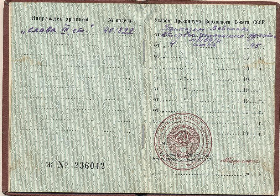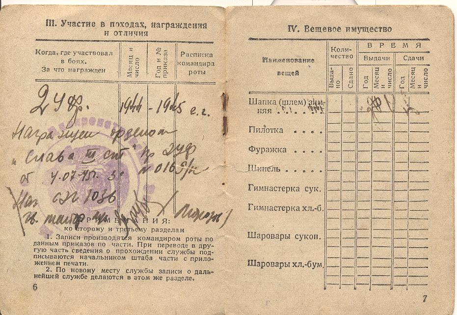 Награды: орден Славы III степени (наградной лист от 8.07.1944 г.); награжден за уничтожение 2-х немецких снайперов и уничтожение пулеметного дзота (2 пулемета и 8 пулеметчиков); орден Отечественной войны II степени; медаль «За победу над Германией в Великой Отечественной войне 1941-1945 гг.»; медаль «За отвагу».