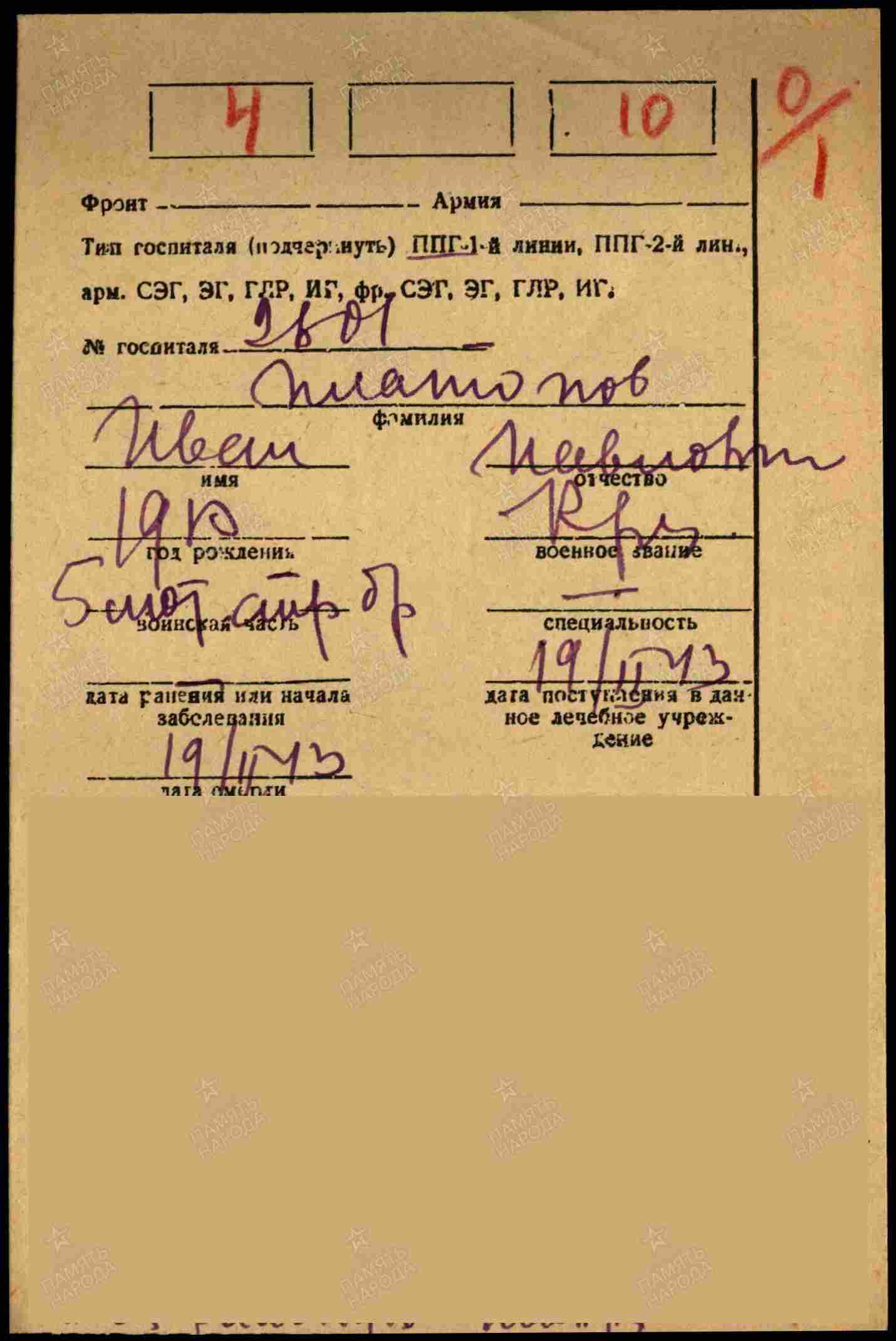Иван Платонов родился в 1910 году в селе Чубовка Кинельского района. Ушёл воевать в первые дни войны. Красноармеец. По информации из Донесения о безвозвратных потерях красноармеец Платонов Иван Павлович умер от отравления 19.02.1943 г. Первичное место захоронения Калининская обл., Погорельский р-н, с. Погорелое Городище, восточнее, 300 м, военное кладбище, братская могила № 2, ППГ-2601, могила № 6.