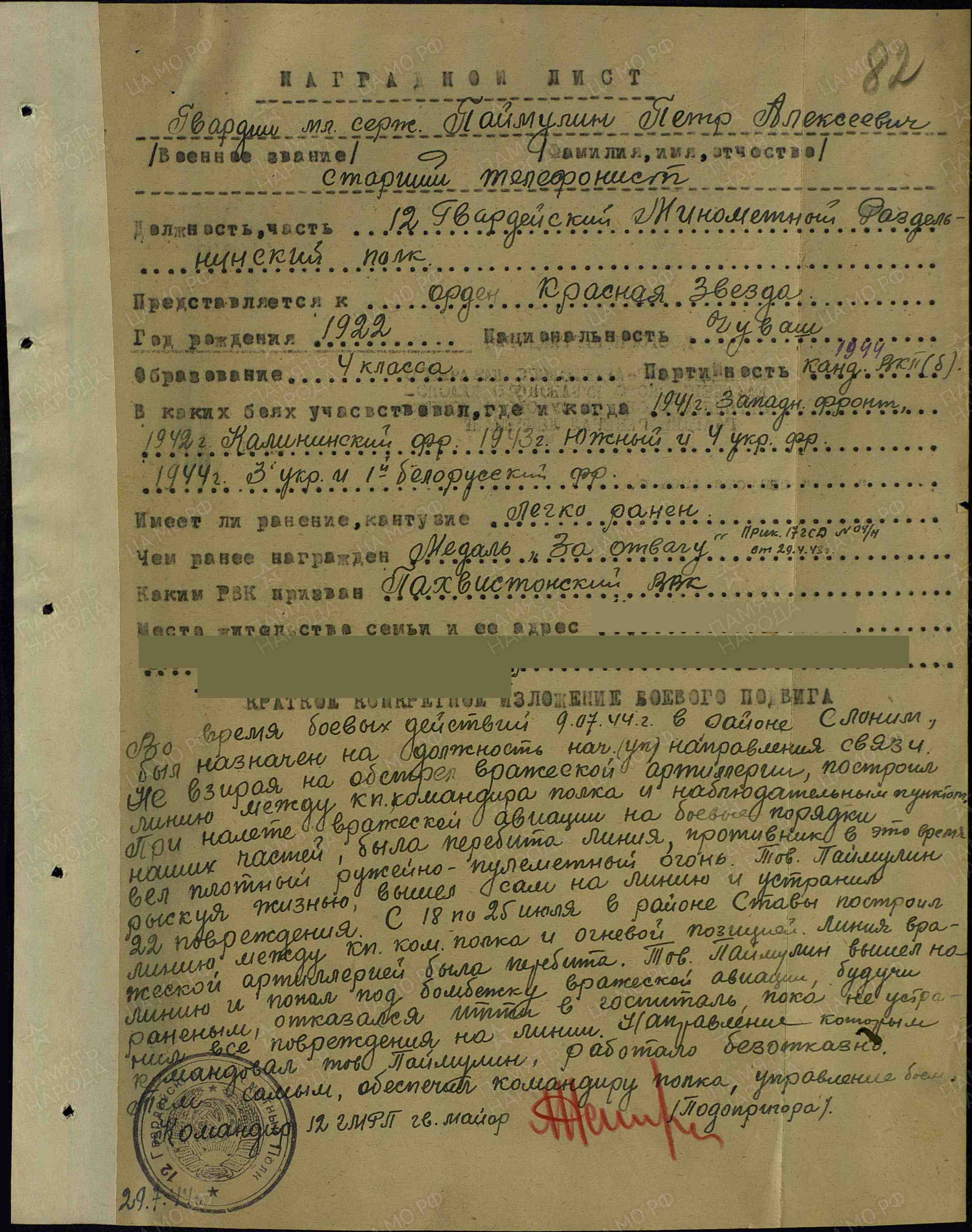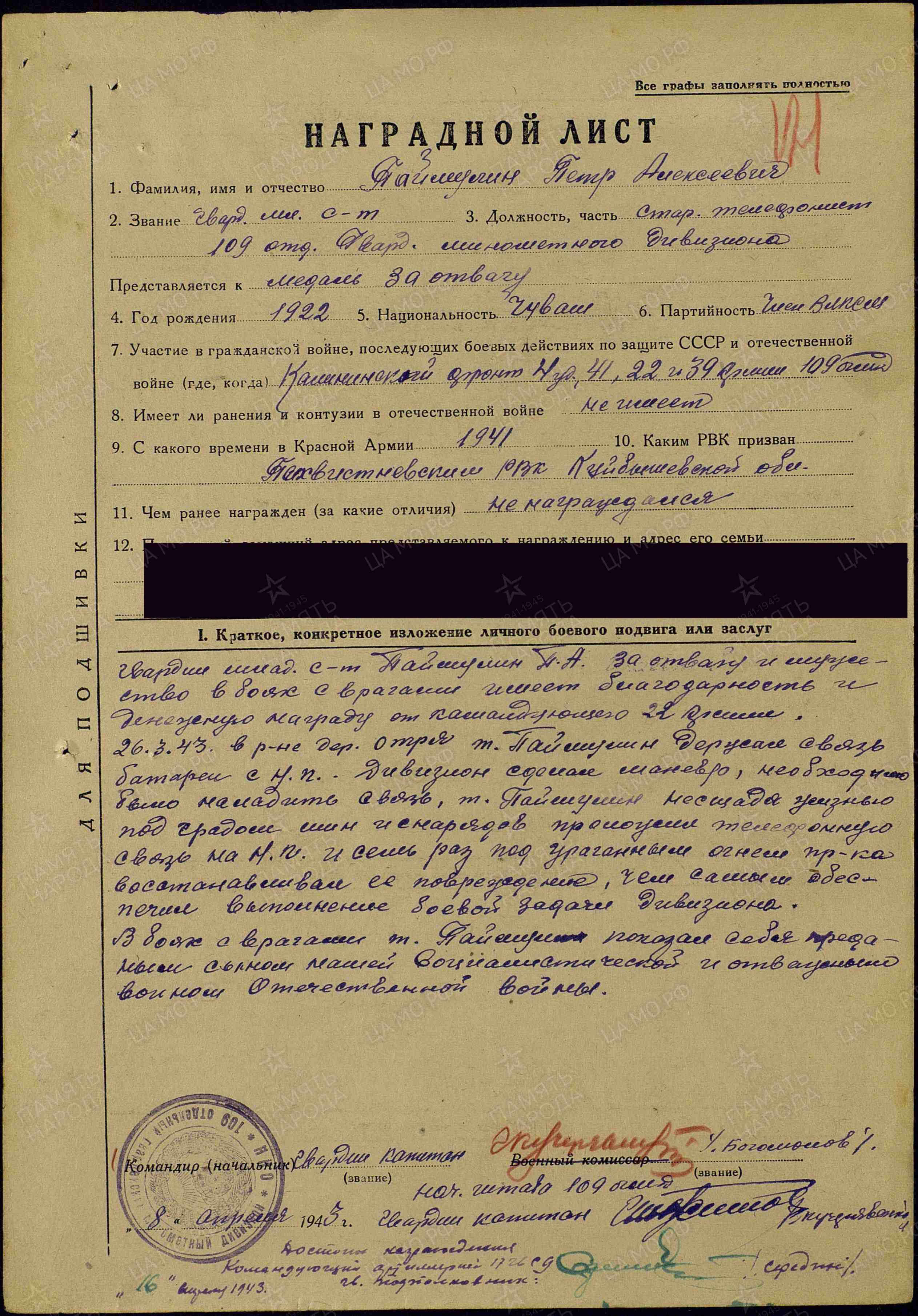 Гвардии младший сержант Паймулин П.А. за отвагу и мужество в боях с врагами имеет благодарность и денежную награду от командующего 22-й армии. 26 марта 1943 г. в районе д. Отря тов. Паймулин держал связь батареи с наблюдательным пунктом. Дивизион сделал маневр, необходимо было наладить связь. Тов. Паймулин, не щадя жизни, под градом мин и снарядов проложил телефонную связь на наблюдательный пункт и семь раз под ураганным огнем противника восстанавливал ее повреждения, чем обеспечил выполнение боевой задачи дивизиона. В боях с врагами тов. Паймулин показал себя преданным сыном нашей Социалистической Родины и отважным воином Отечественной войны. Достоин награждения медалью «За отвагу» (наградной лист от 8.04.1943 г.).