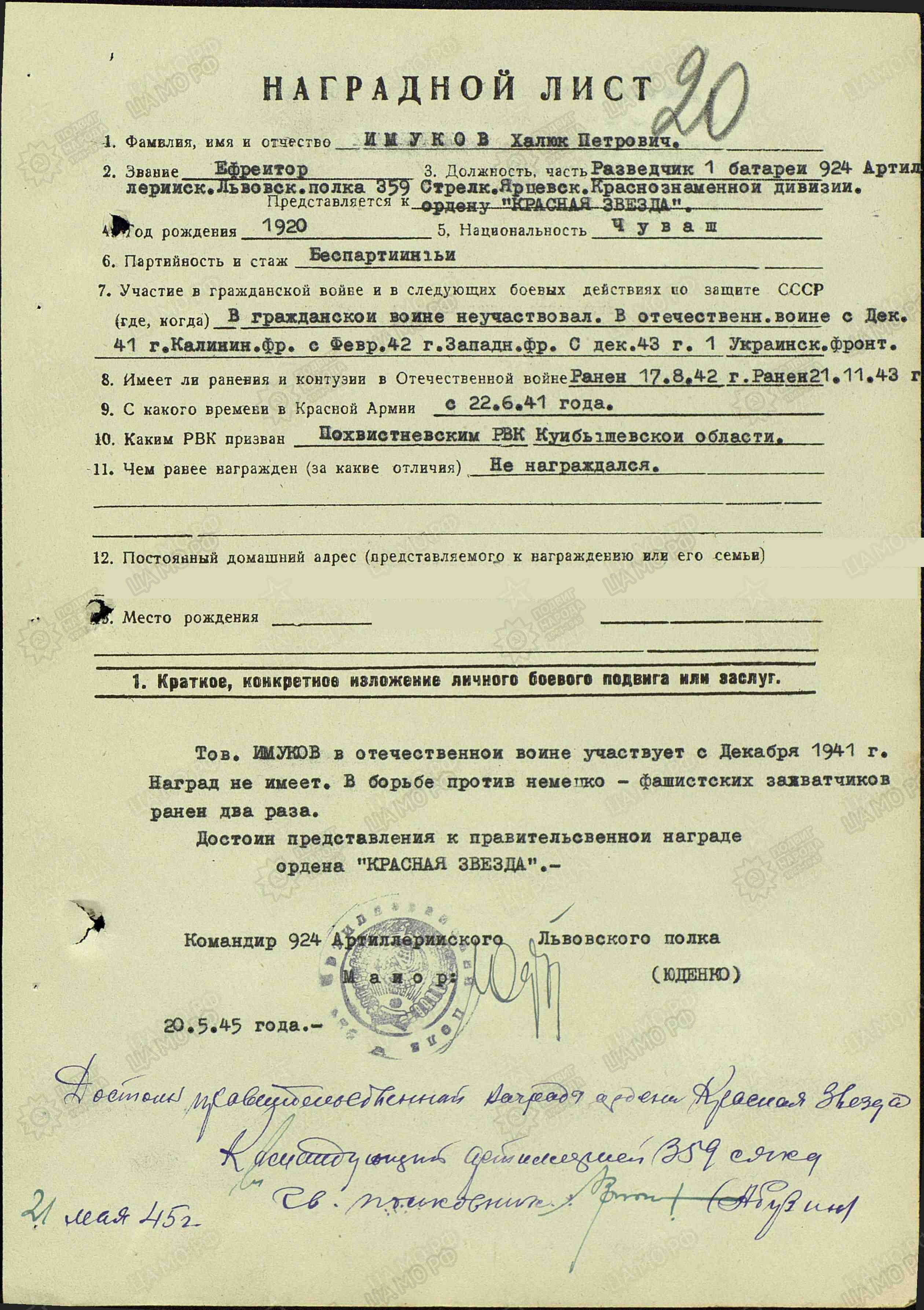 Информация сайта podvignaroda.ru: Тов. Имуков в Отечественной войне участвует с декабря 1941 г. Наград не имеет. В борьбе против немецко-фашистских захватчиков ранен два раза. Достоин представления к правительственной награде – ордену Красной Звезды (наградной лист от 20.05.1945 г.).