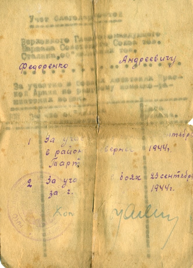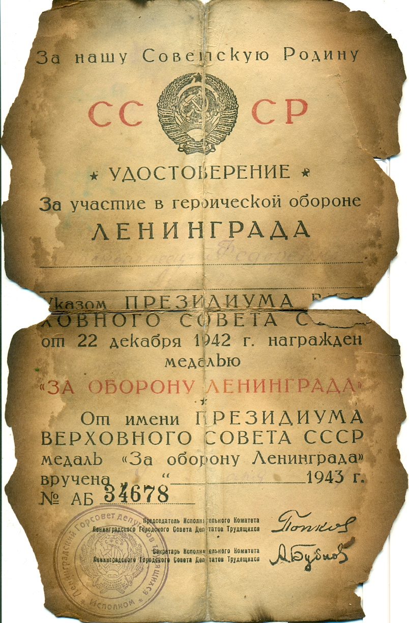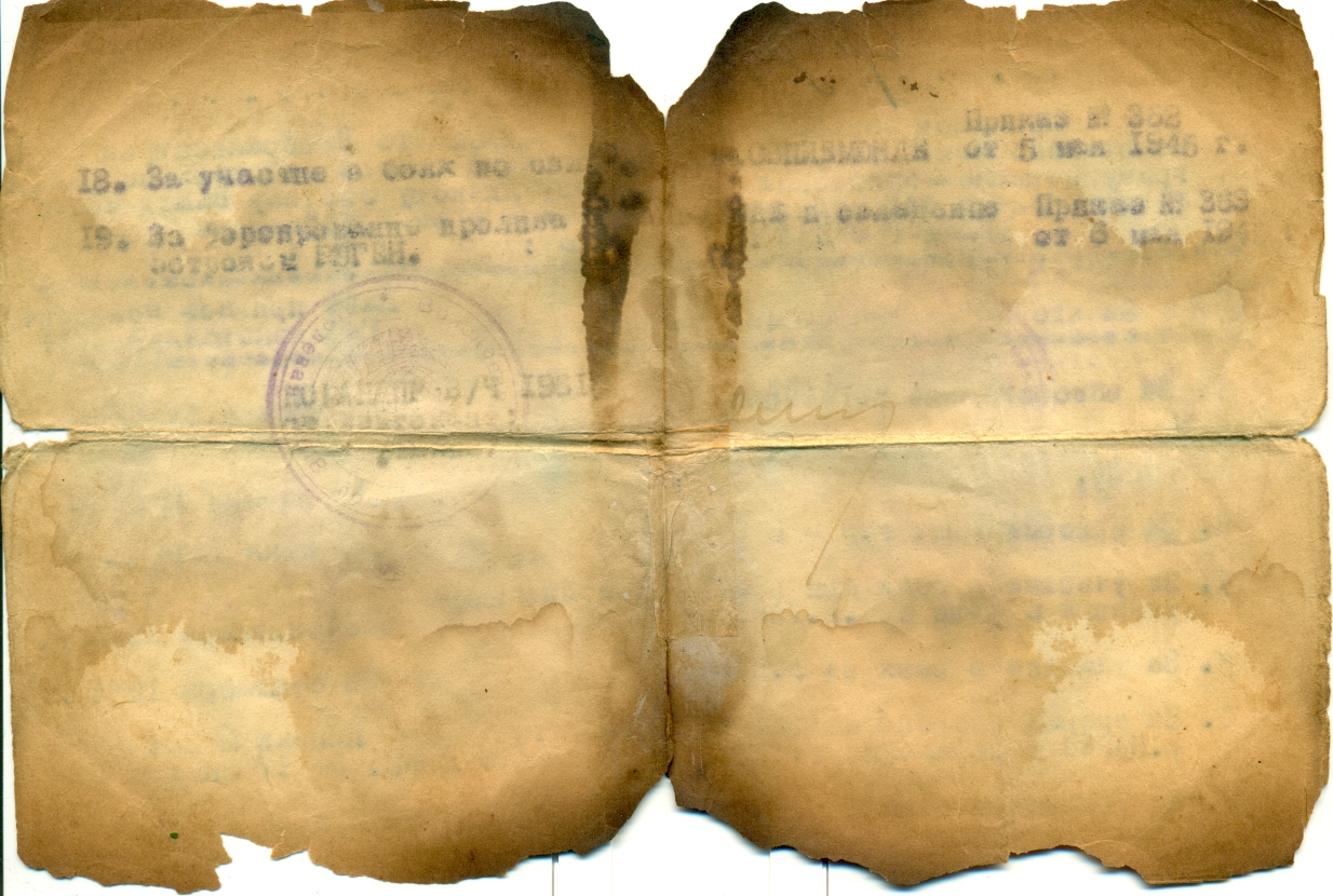 Документы предоставлены дочерью, Коноваловой Галиной Петровной, поселок Украинка Красноярского района Самарской области. Документы пострадали во время пожара, но по-прежнему бережно хранятся в семейном архиве