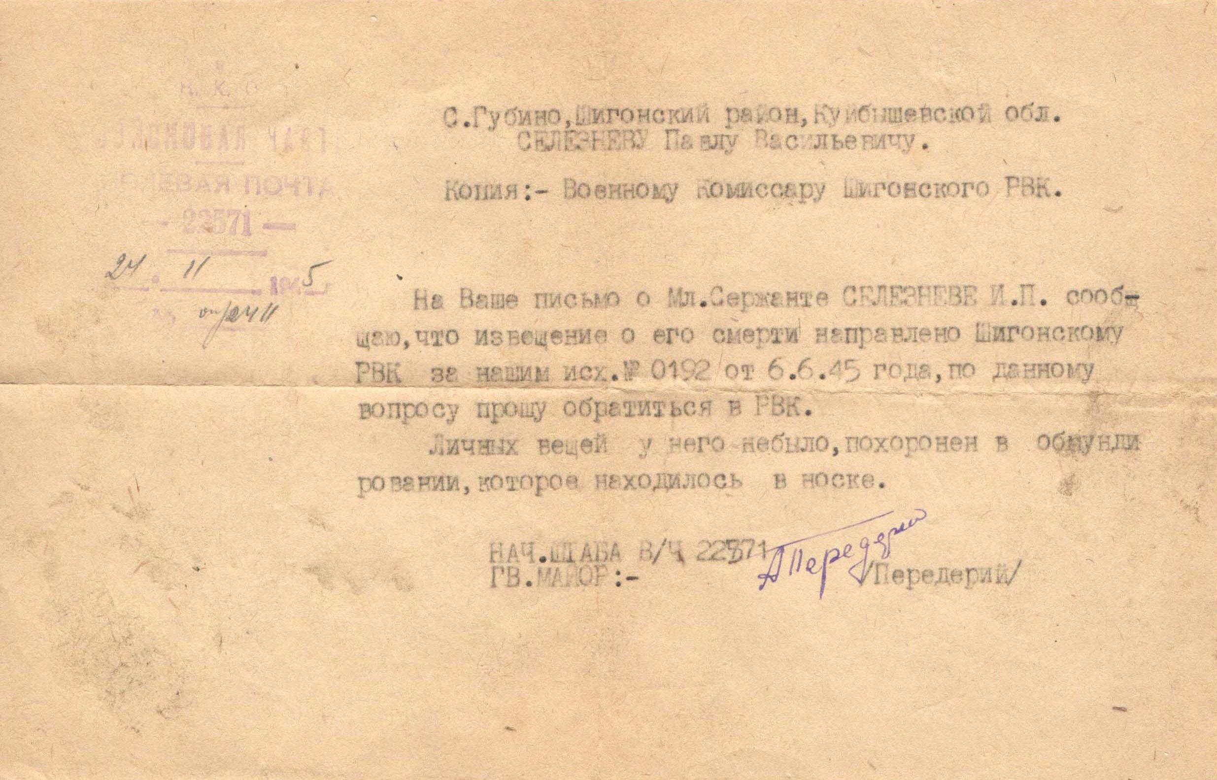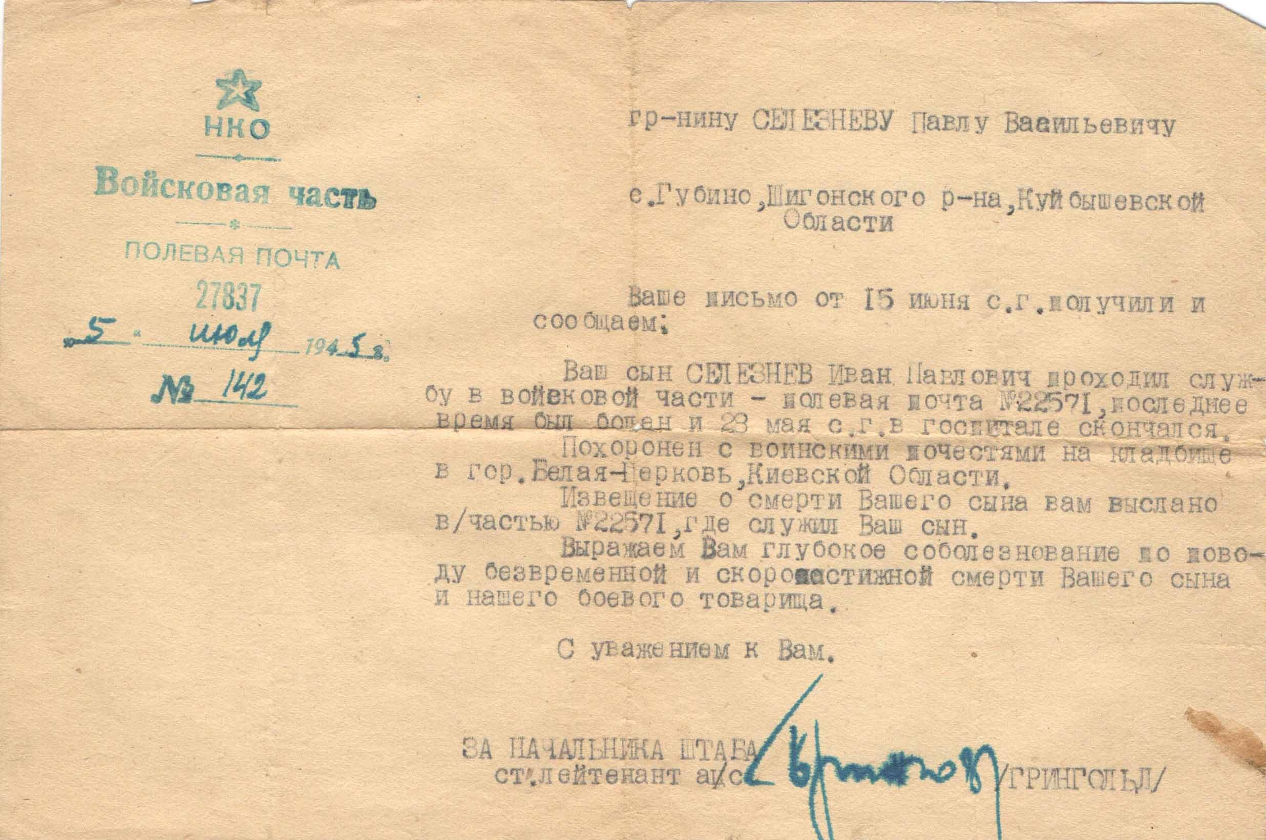 Иван Павлович Селезнев родился в селе Губино. В семье было три брата – Сергей, Василий и Иван. Вместе с братом Василием ушли на фронт.