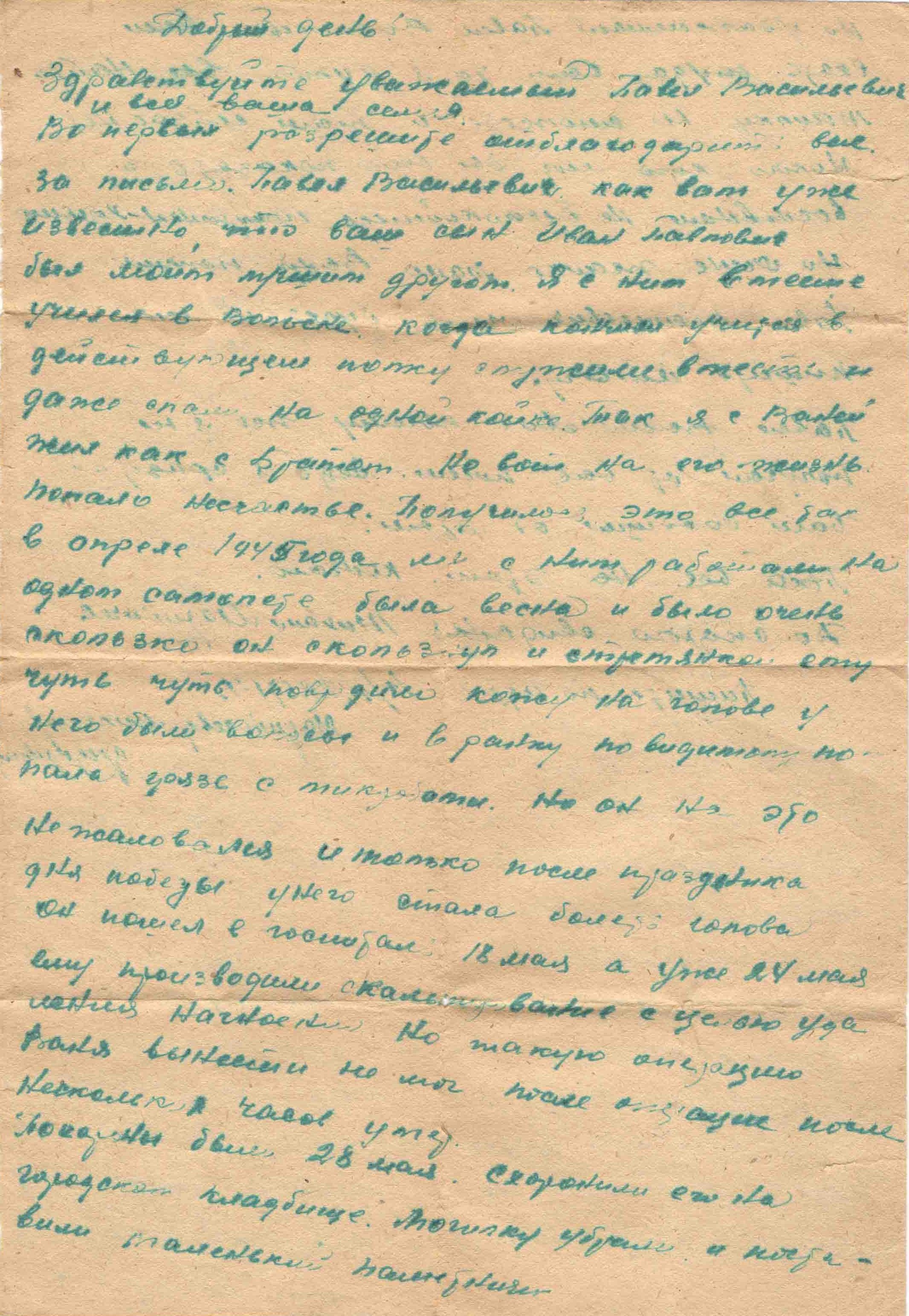 Отец с братом Сергеем посылали запрос командованию, в июне 1945 г. пришло извещение о смерти. Иван Павлович заболел и умер в госпитале 28 мая 1945 года, похоронен в г. Белая Церковь Киевской области.