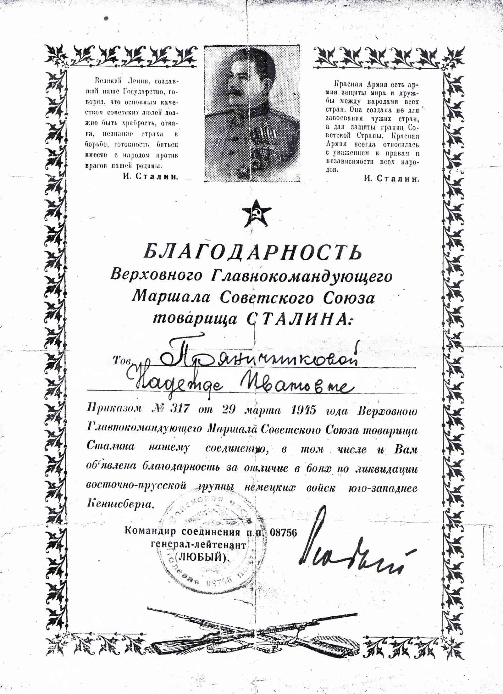 Когда подошли к г. Вильнюс, он ещё полностью был занят немцами. Их полк участвовал в освобождении города, и ему присвоили название – 13-й пограничный Вильненский имени Александра Невского полк. Со своей заставой Надежда Ивановна прошла Смоленскую область, Литву и Восточную Пруссию. 9 мая на берегу Балтийского моря палили из винтовок и автоматов в честь Победы!