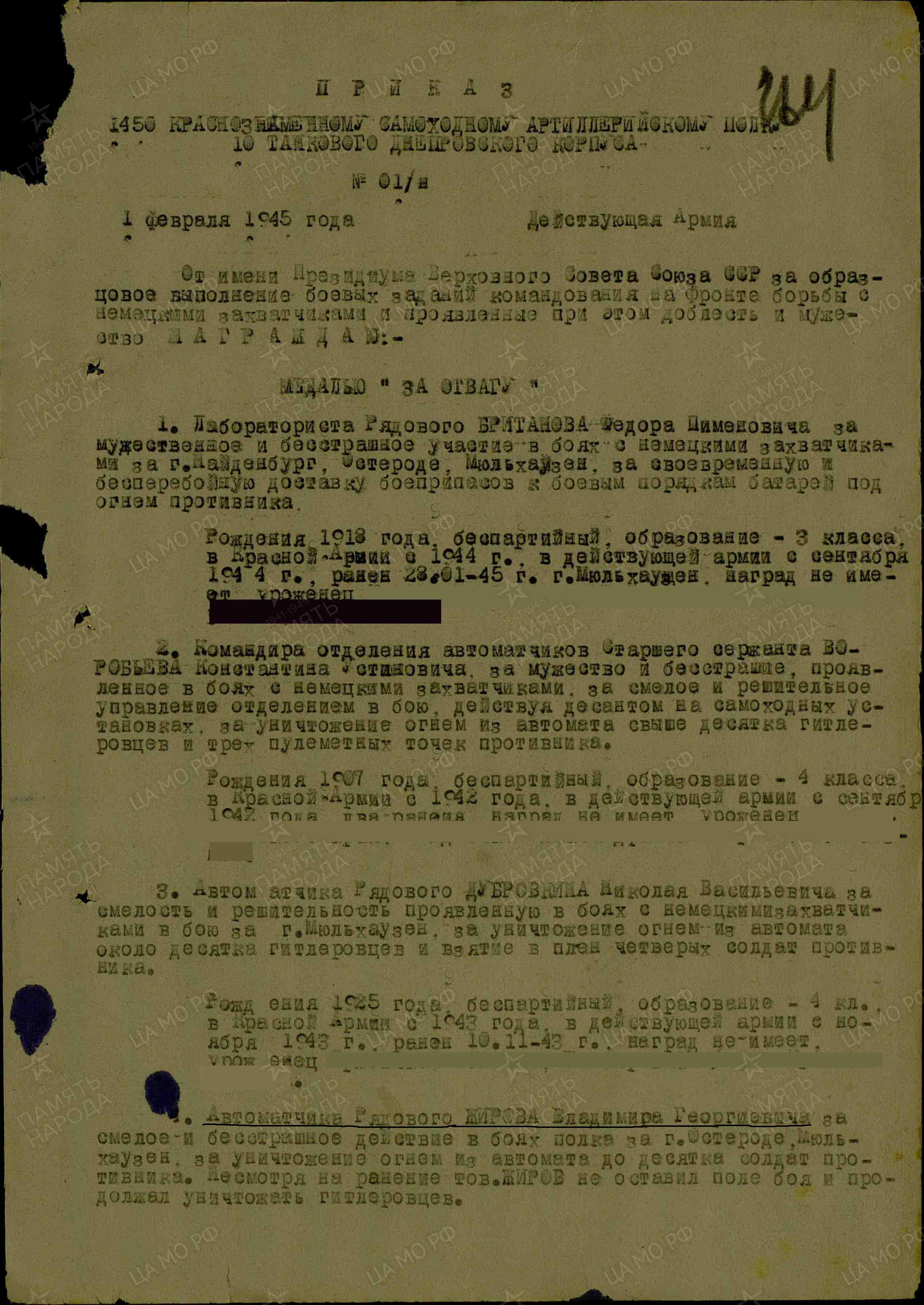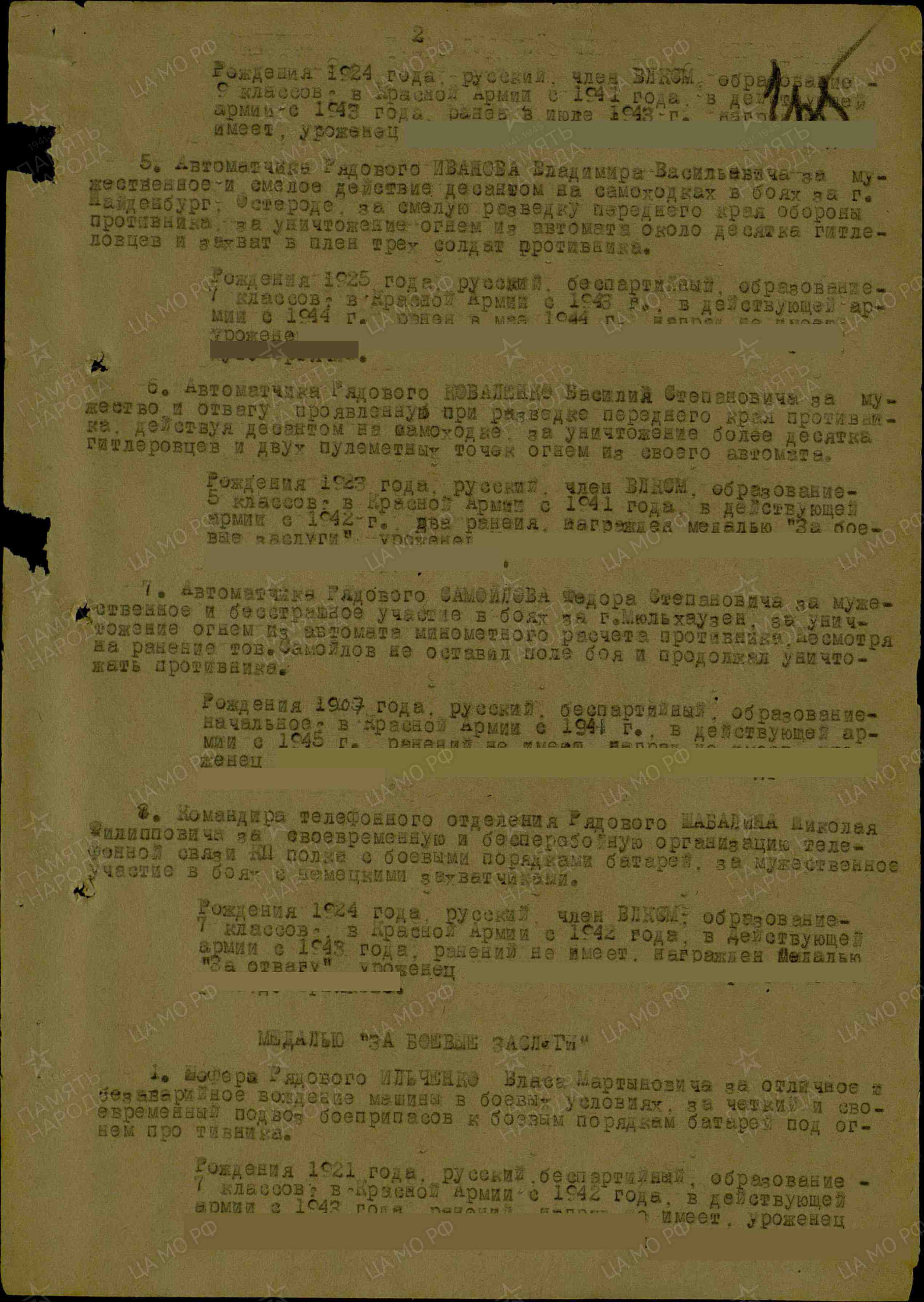 Информация сайта podvignaroda.ru: Наградить медалью «За отвагу» автоматчика, рядового Жирова Владимира Георгиевича за смелые и бесстрашные действия в боях полка за города Остероде, Мюльхаузен (Восточная Пруссия), за уничтожение огнем из автомата до десятка солдат противника. Несмотря на ранение, тов. Жиров не оставил поле боя и продолжал уничтожать гитлеровцев (наградной лист от 1.02.1945 г.).