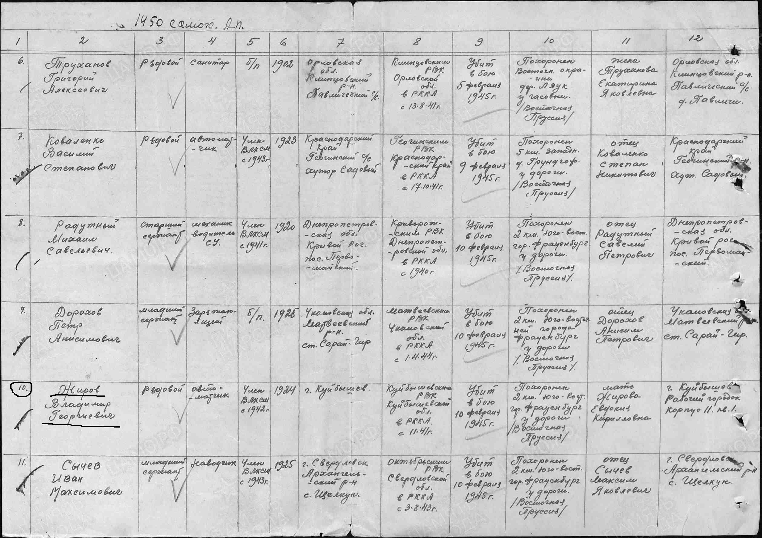 - Александр Георгиевич, 1912 г.р. Рядовой, стрелок 585-го стрелкового полка 213-й стрелковой дивизии. Убит в бою 10 сентября 1943 г. Похоронен на территории совхоза «Гигант» в Харьковской области.