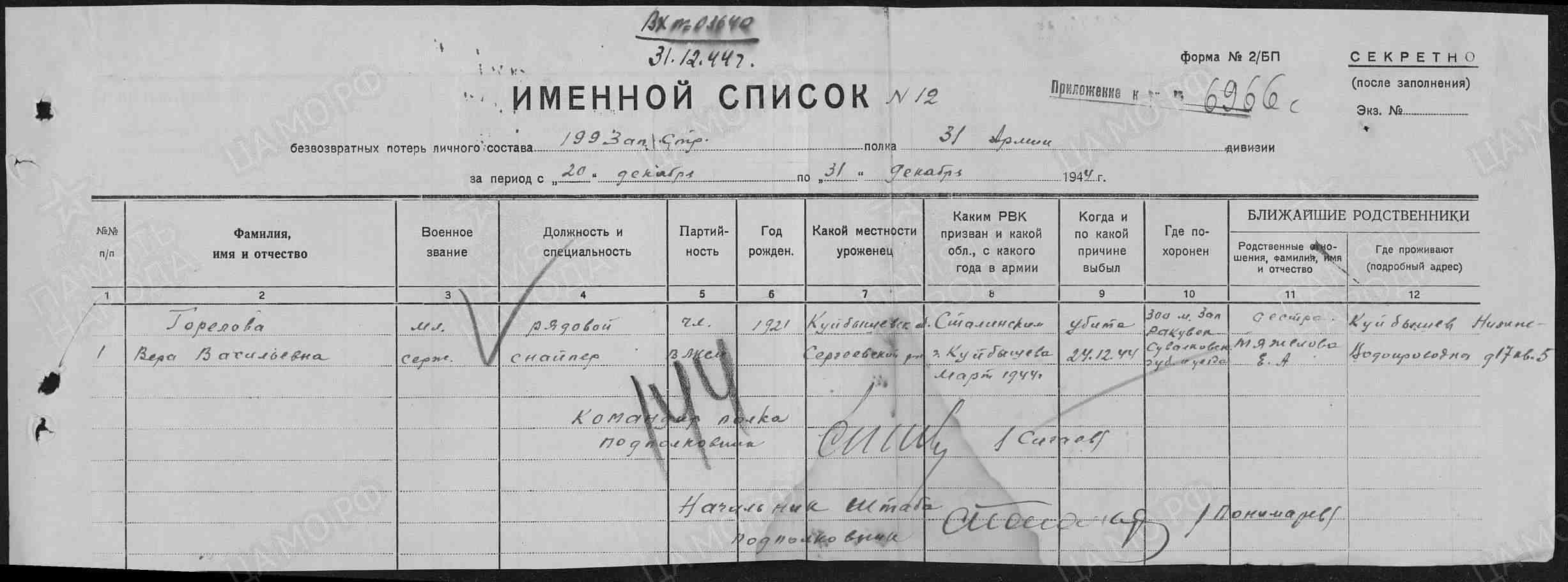 Родилась в 1921 г. в с. Боровка Сергиевского района Самарской области. Член ВЛКСМ. До войны жила в г. Куйбышев. Работала в часовом цехе завода им. Масленникова. Ушла на фронт добровольцем в 1943 г. Окончила Центральную женскую школу снайперской подготовки в г. Подольск. В боях с марта 1944 г. Служила в звании младший сержант, в должности снайпер 2-го стрелкового батальона 1108-го стрелкового полка 331-й стрелковой дивизии. Убита в бою 24 декабря 1944 г. в Польше. Похоронена в 300 м западнее Ракувск Сувалкской об-ласти (Польша).