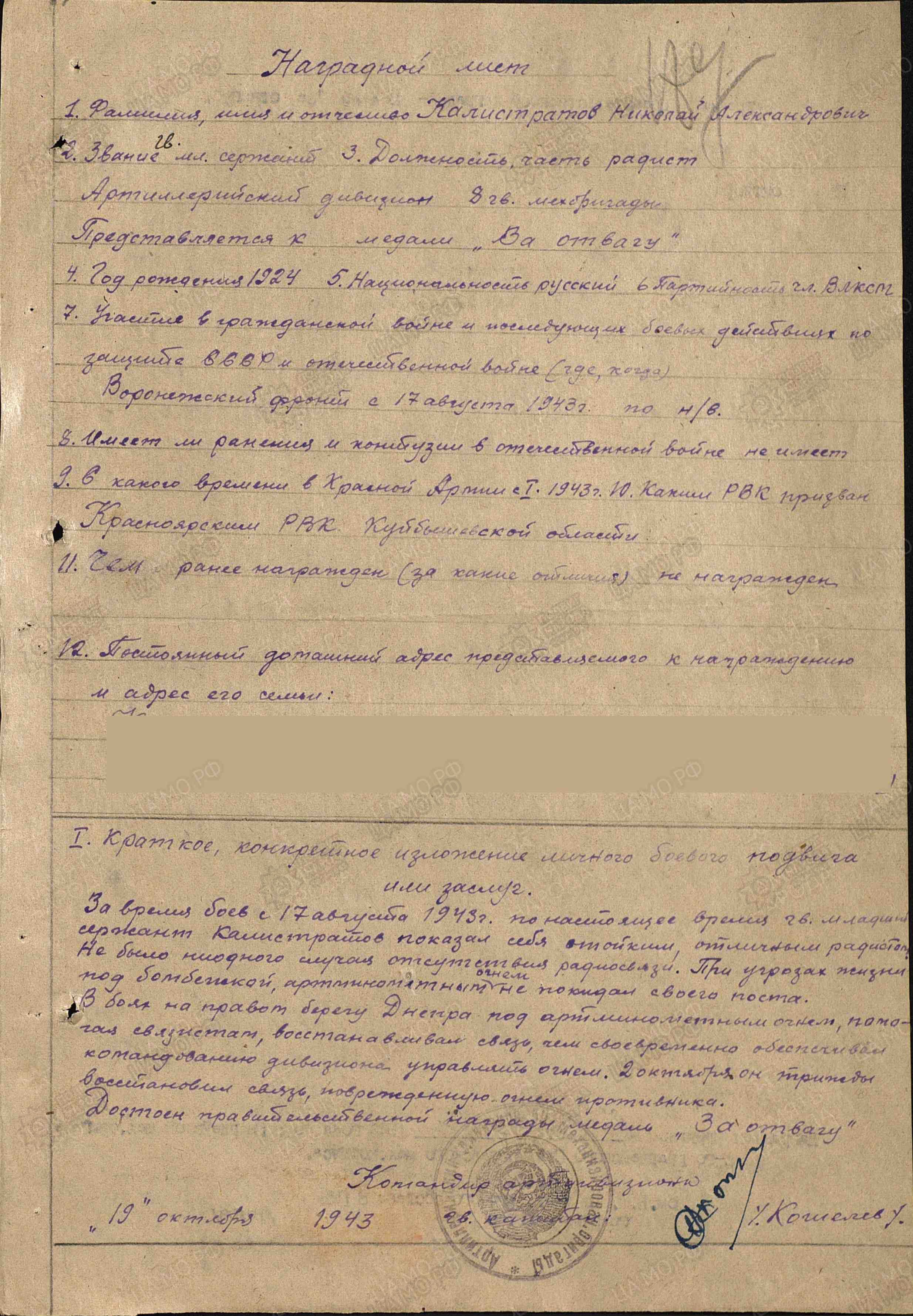 Информация сайта podvignaroda.ru: За время боев с 17 августа 1943 г. по настоящее время гвардии младший сержант Калистратов показал себя стойким, отличным радистом. Не было ни одного случая отсутствия радиосвязи. При угрозе жизни под бомбежкой и артминометным огнем не покидал своего поста. В боях на правом берегу Днепра, под артминометным огнем помогал связистам восстанавливать связь, чем своевременно обеспечивал командованию дивизиона управление огнем. 20 октября он трижды восстановил связь, поврежденную огнем противника. Достоин правительственной награды – медали «За отвагу» (наградной лист от 19.10.1943 г.).