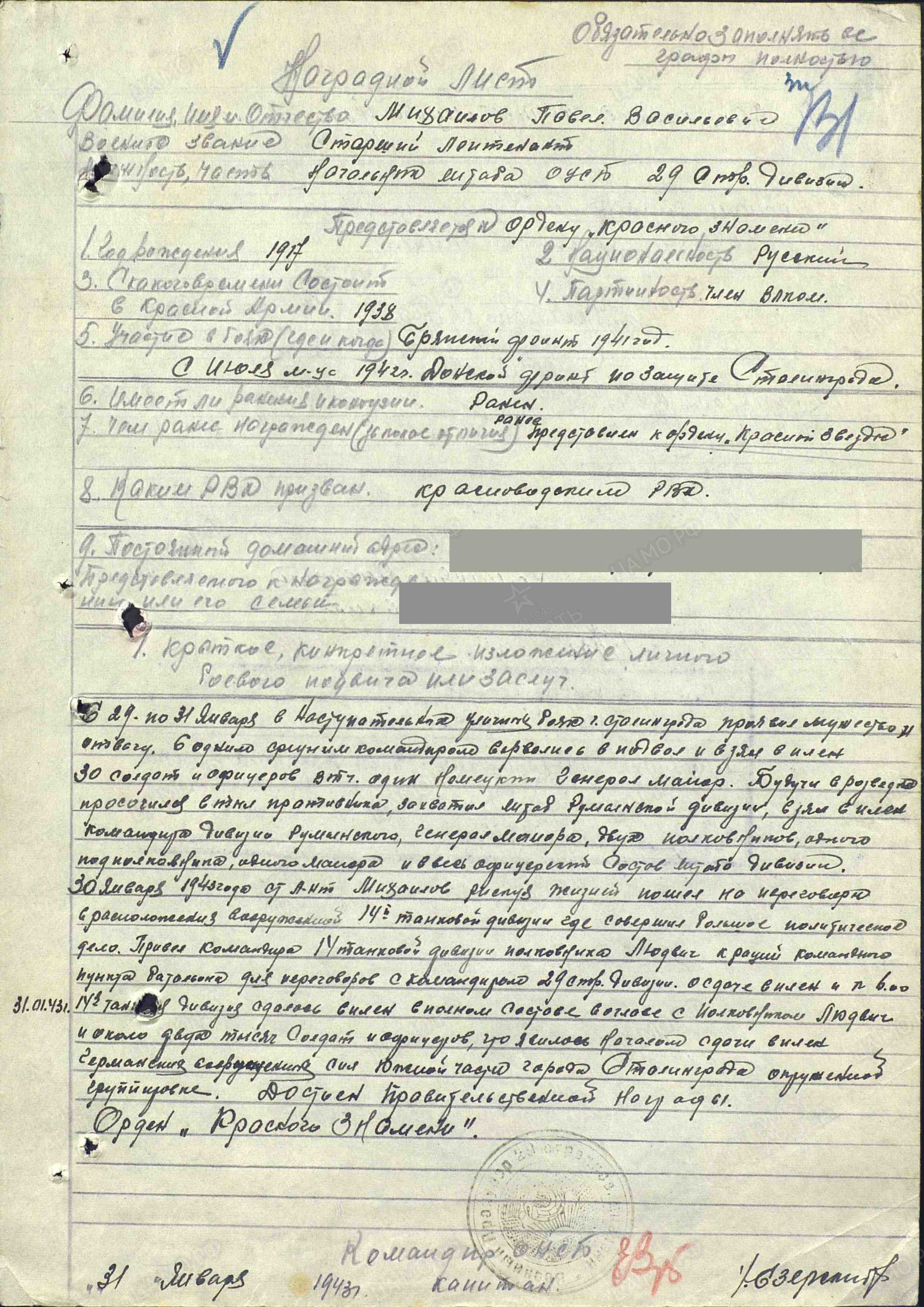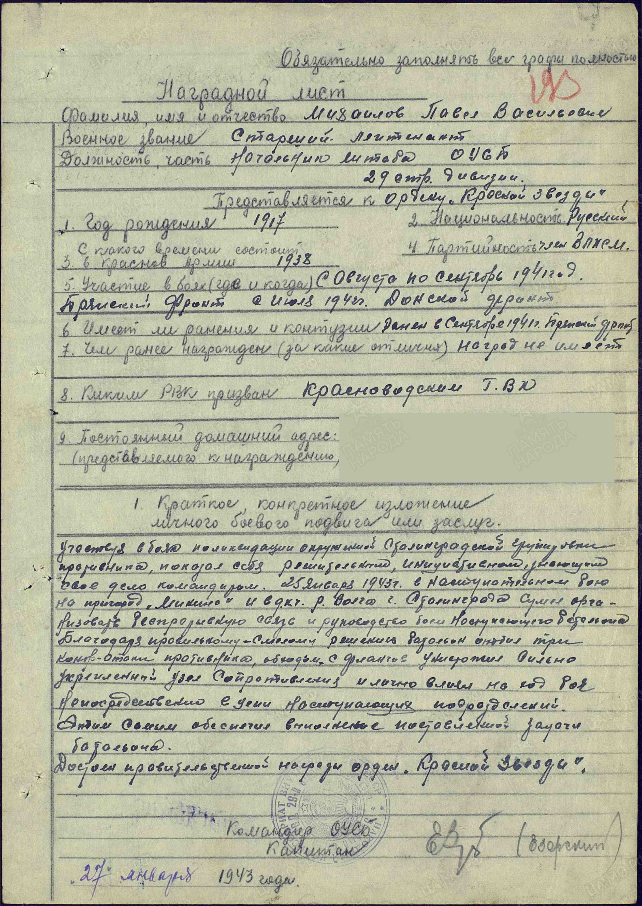 Информация сайта podvignaroda.ru: Участвуя в боях по ликвидации окруженной Сталинградской группировки противника, показал себя решительным, инициативным, знающим свое дело командиром. 25 января 1943 г. в наступательном бою на пригород Микино вдоль реки Волга в г. Сталинград сумел организовать беспрерывную связь и руководство боем наступающего батальона. Благодаря правильному и смелому решению батальон отбил три контратаки противника, обходом с флангов уничтожил сильно укрепленный узел сопротивления и лично влиял на ход боя непосредственно в цепи наступающих подразделений. Этим обеспечил выполнение поставленной батальону задачи. Достоин правительственной награды – ордена Красной Звезды (наградной лист от 27.01.1943 г.).