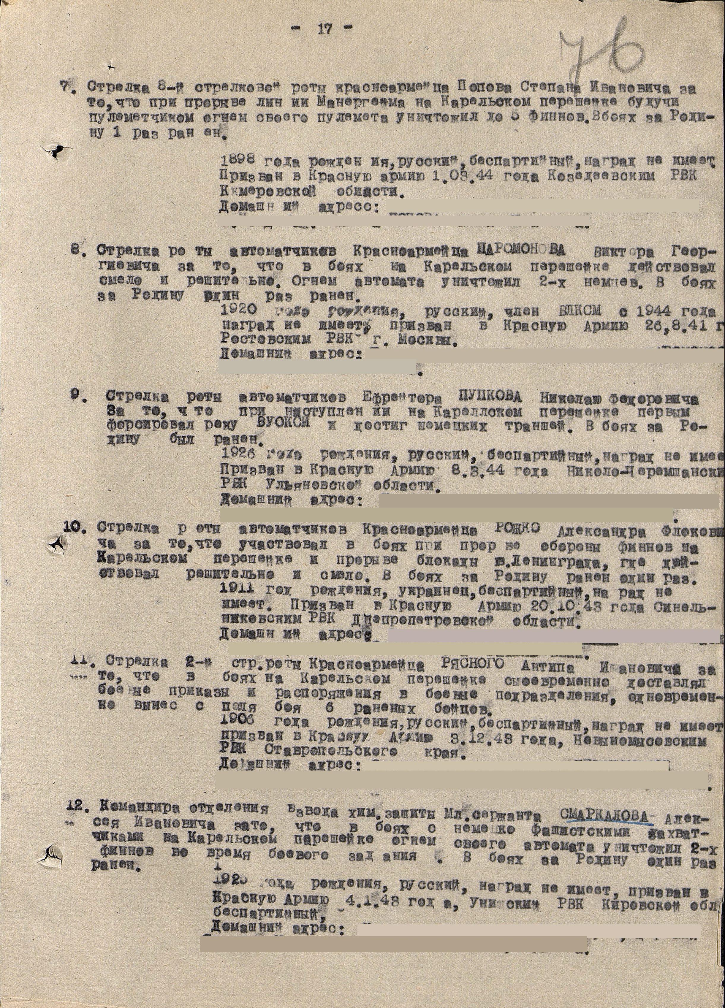 Информация сайта podvignaroda.ru: Наградить медалью «За боевые заслуги» стрелка роты автоматчиков, ефрейтора Пупкова Николая Федоровича за то, что при наступлении на Карельском перешейке первым форсировал реку Вуокса и достиг немецких траншей. В боях за Родину был ранен (наградной лист от 27.05.1945 г.).